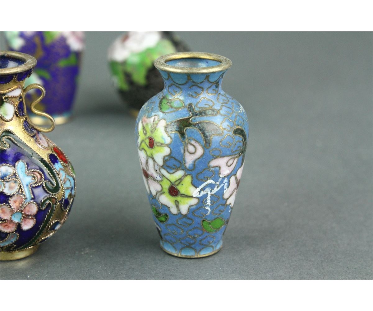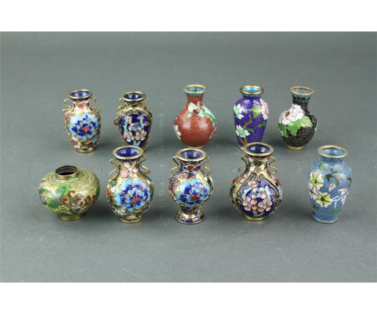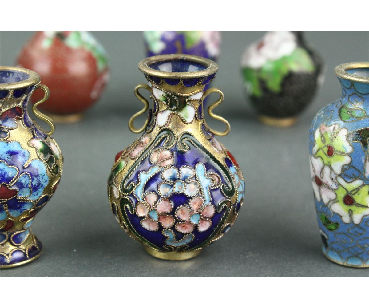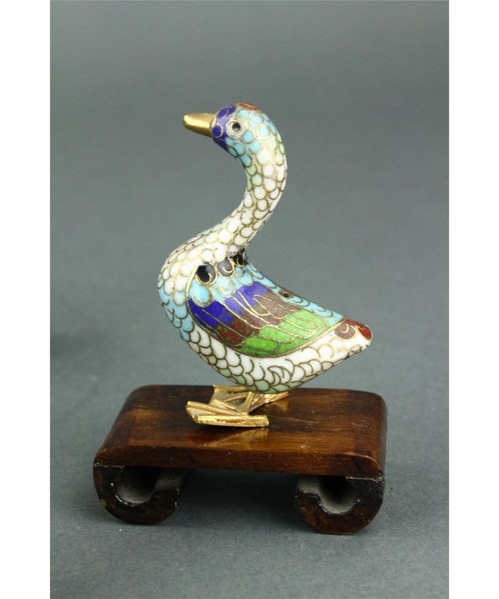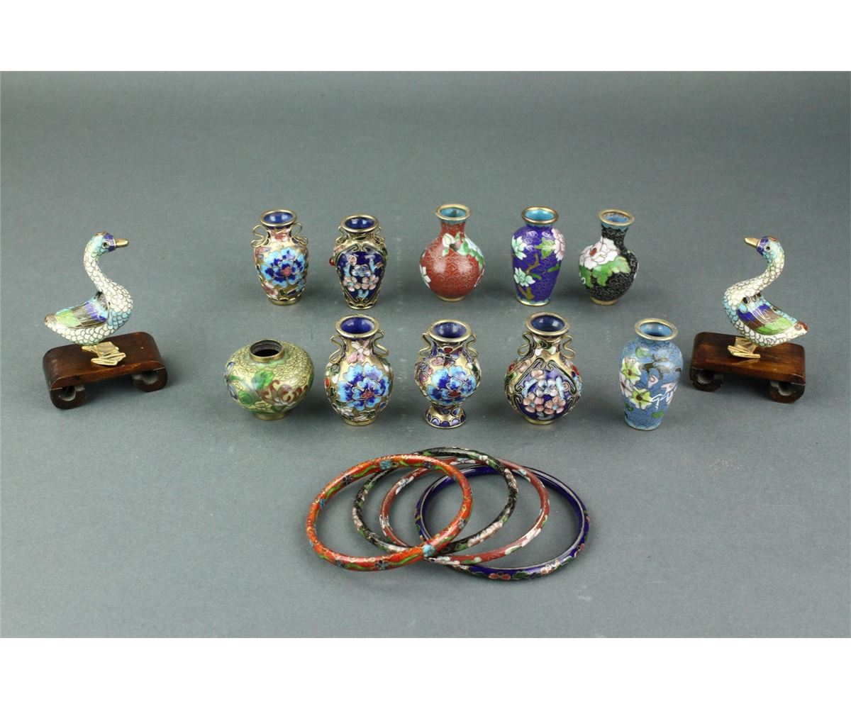 Group of Chinese cloisonne decorative items; comprised of ten small vases, four bangles and a pair of goose figures with wood stands; D: 7 cm, 388 grams total