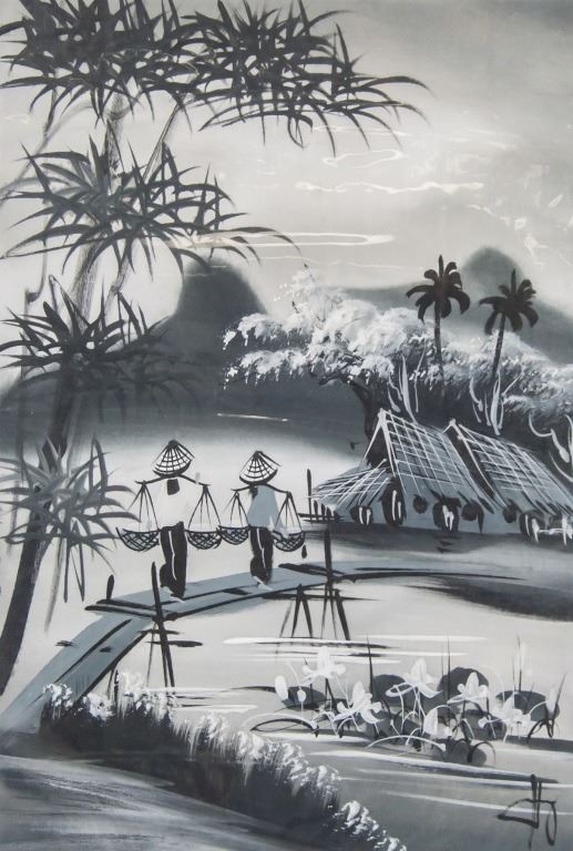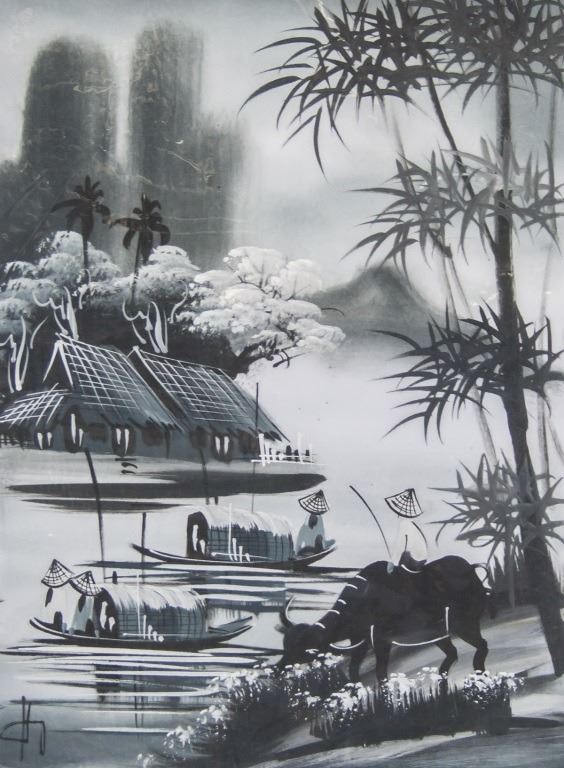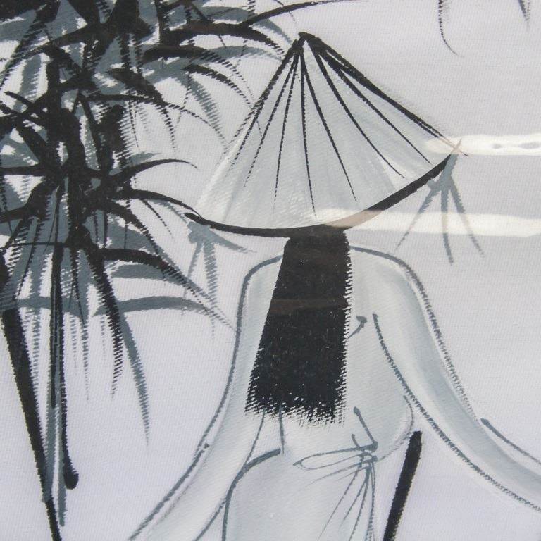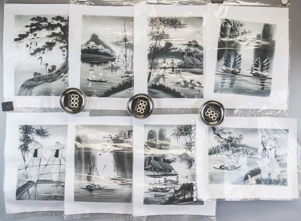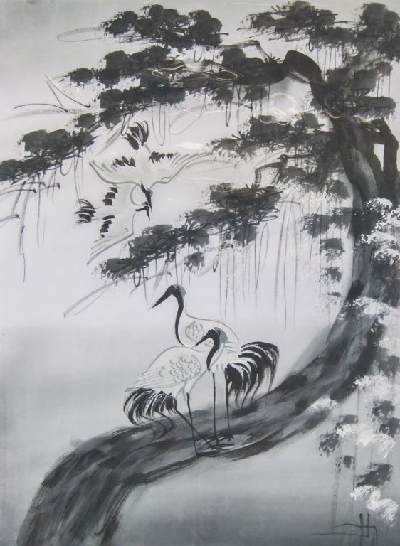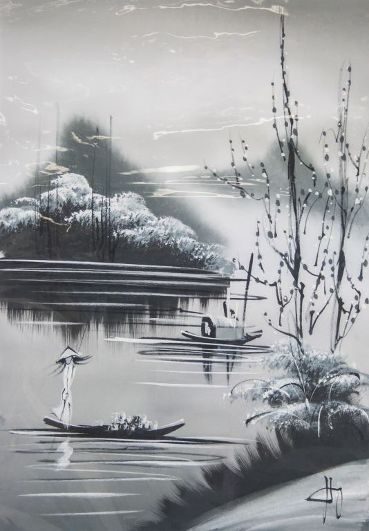 Chinese ink on paper. Featuring black and white landscape scenes, cranes, and boats. Signed. 33 x 24 cm. 317 grams (8).