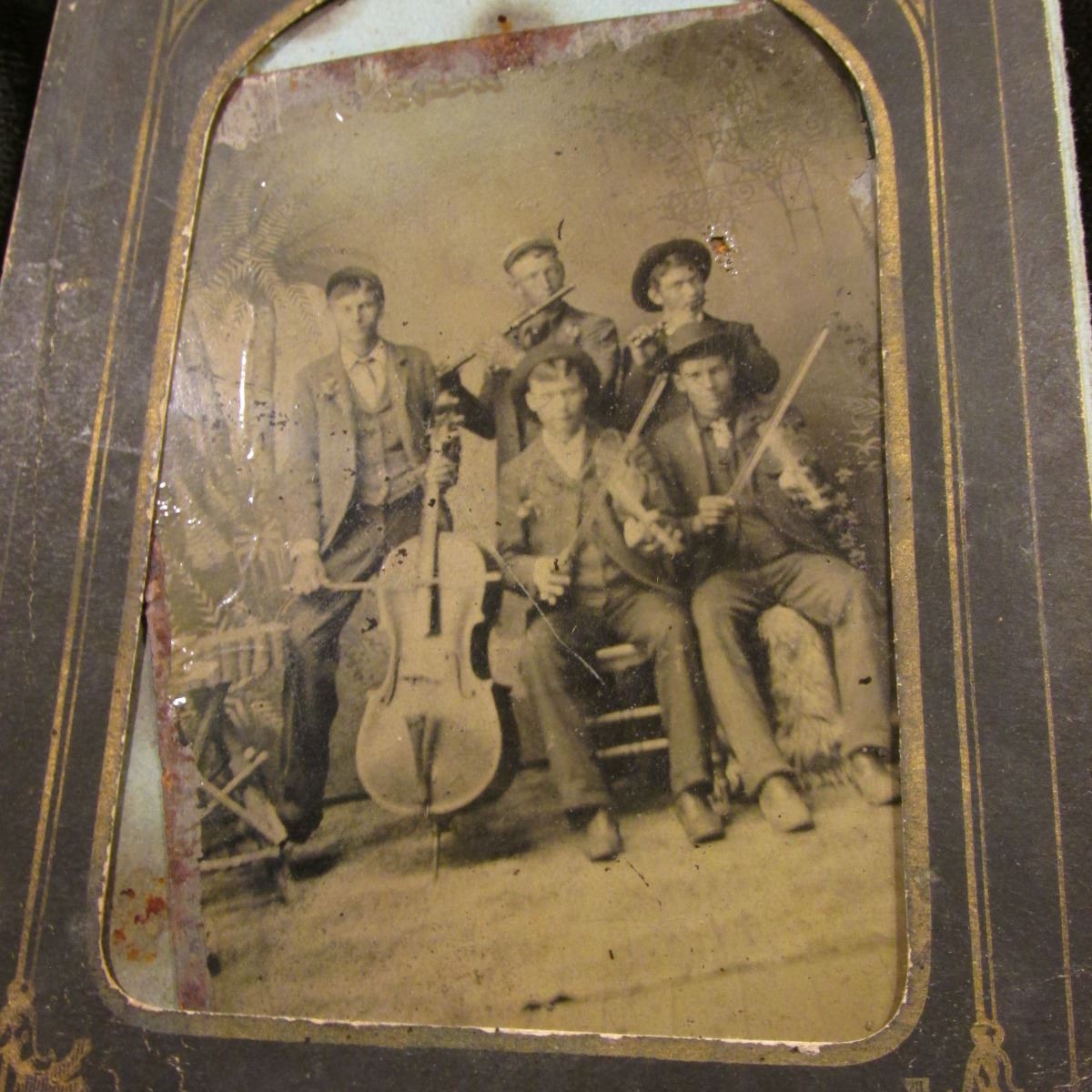 Group of Civil War era Tin types & Black and White Photos,one has a gold-colored frame, another depicts a five piece band.