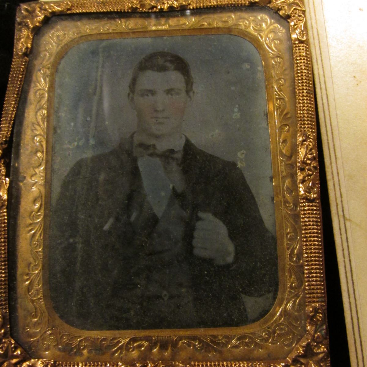 Group of Civil War era Tin types & Black and White Photos,one has a gold-colored frame, another depi