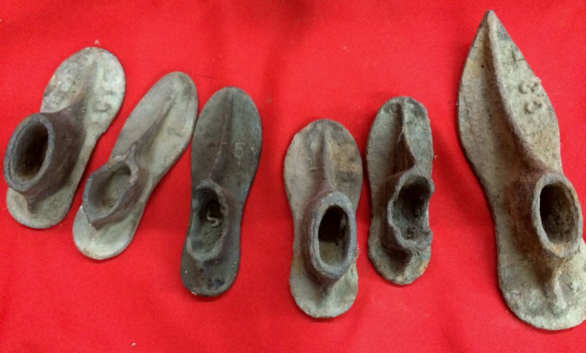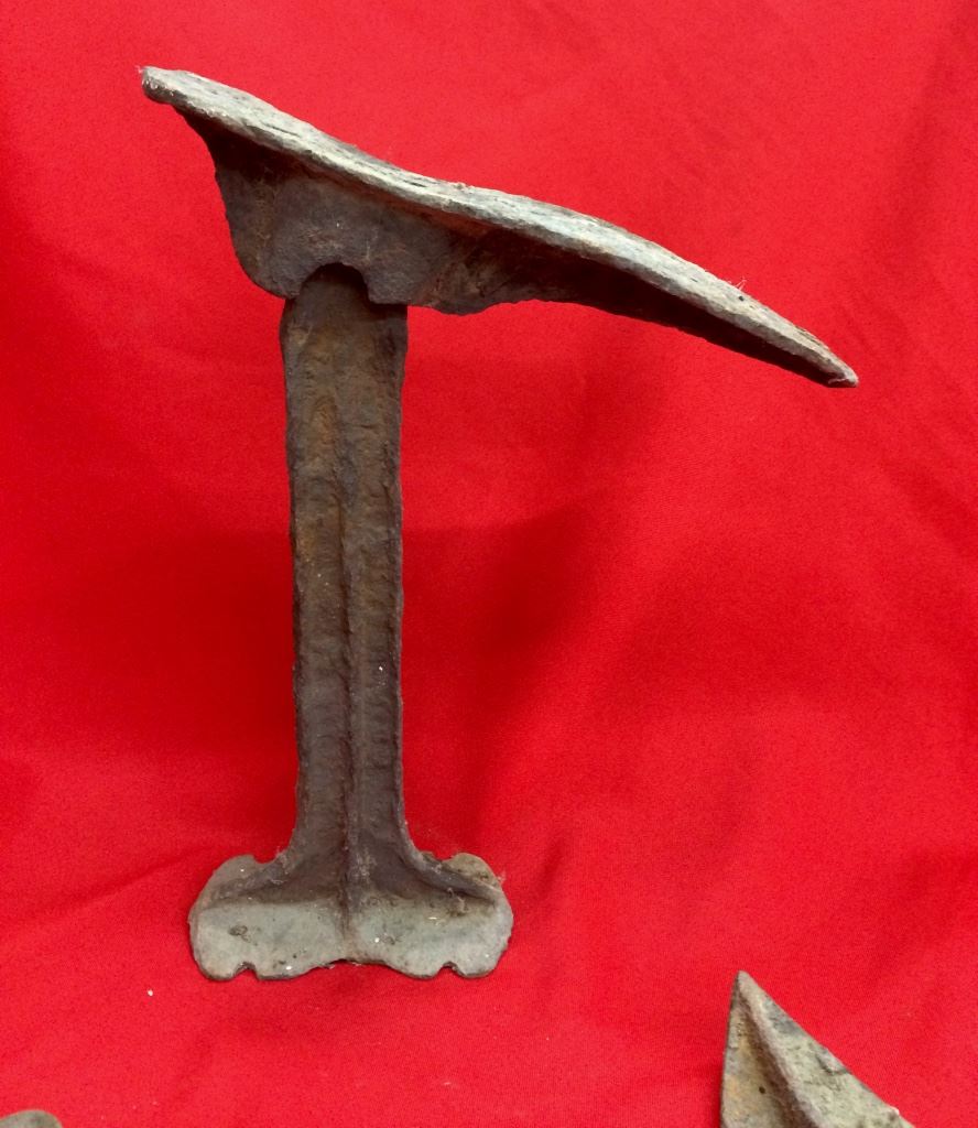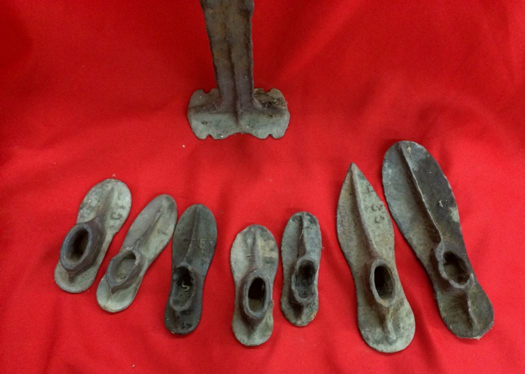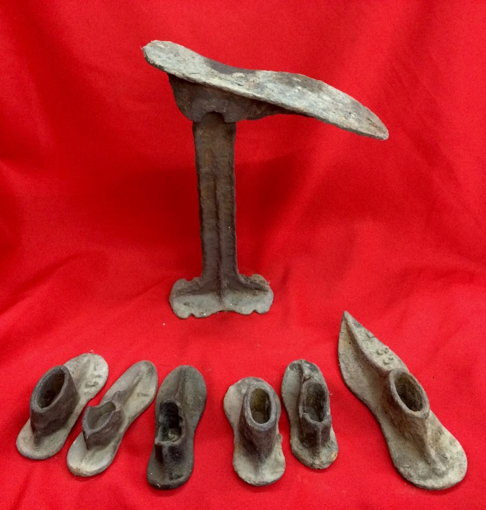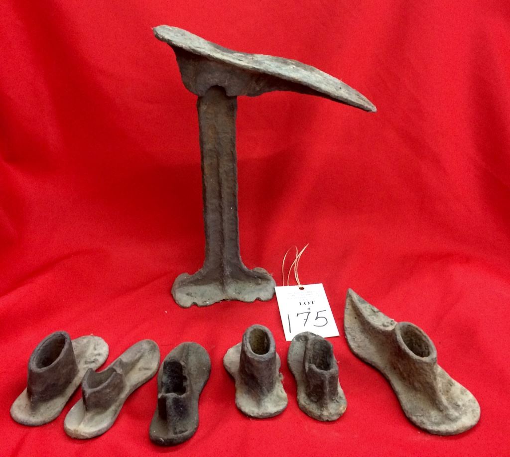 There are 7 different antique cobblers iron shoe forms, plus a stand all for 1 money in this lot! Items all came from display at the old Frontier Relics Museum at Dos Cabezas, AZ. They were all found / dug from historical areas in Southeastern Arizona by Orville Mickens (curator and owner of Frontier Relics). All are dated to the second half of the 1800s or early 1900s. As found condition. Shipping: There will be a $10 handling / packaging fee for shipping this lot. The actual cost of postage will be added on top of that.