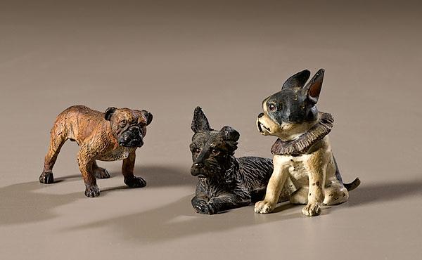 20th century. Includes a brindle-colored bulldog and two joined terriers, a French bulldog and a Scottish Terrier; bulldog, 1.125" high x 2.25" long; the terriers, 1.875" high x 2.75" long.