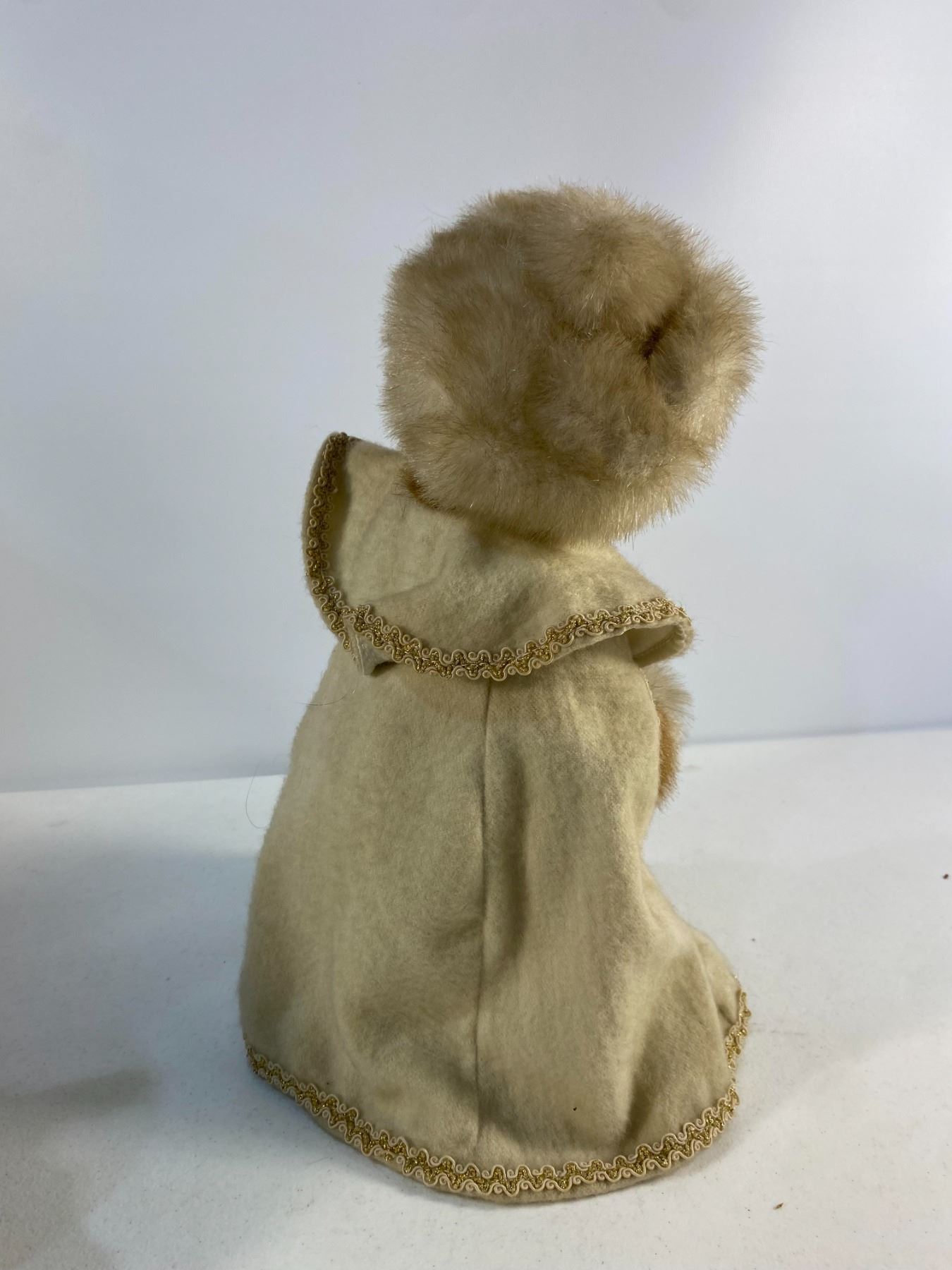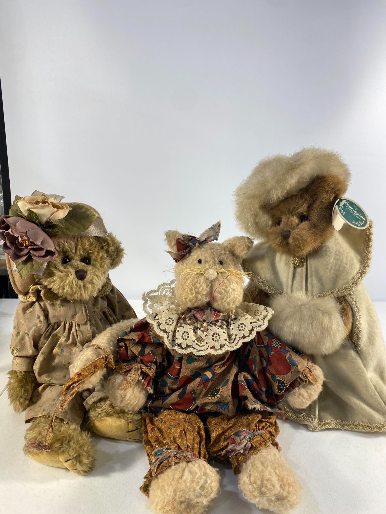 Three plush figures including two bears and a cat dressed in vintage fabric outfits. One features a winter coat with faux fur trim. Approx. 1214" tall Condition: Good; minor wear consistent with age.