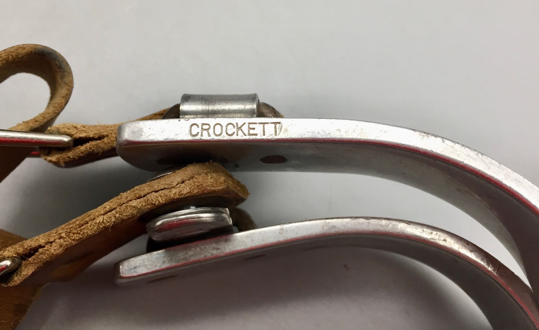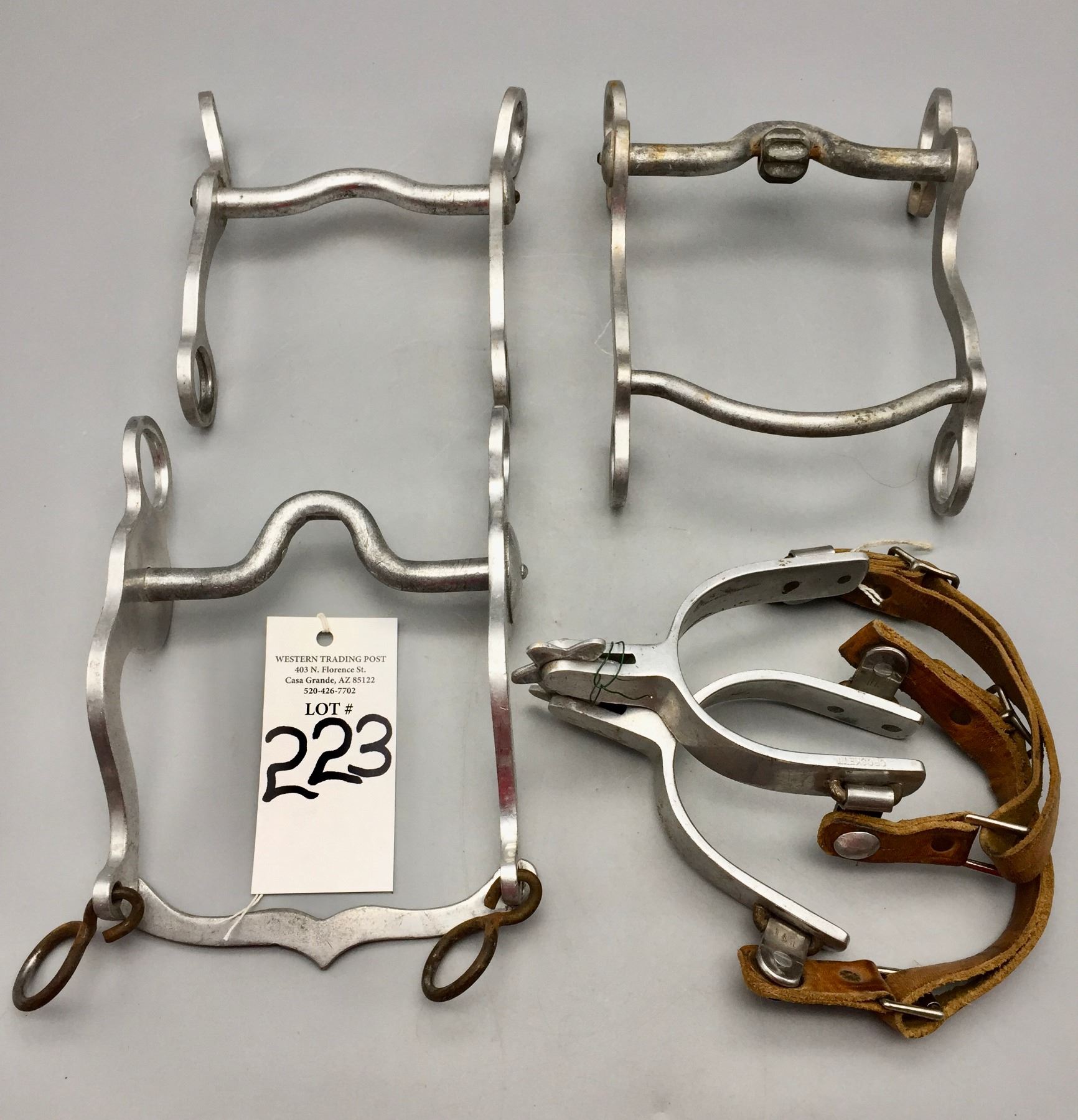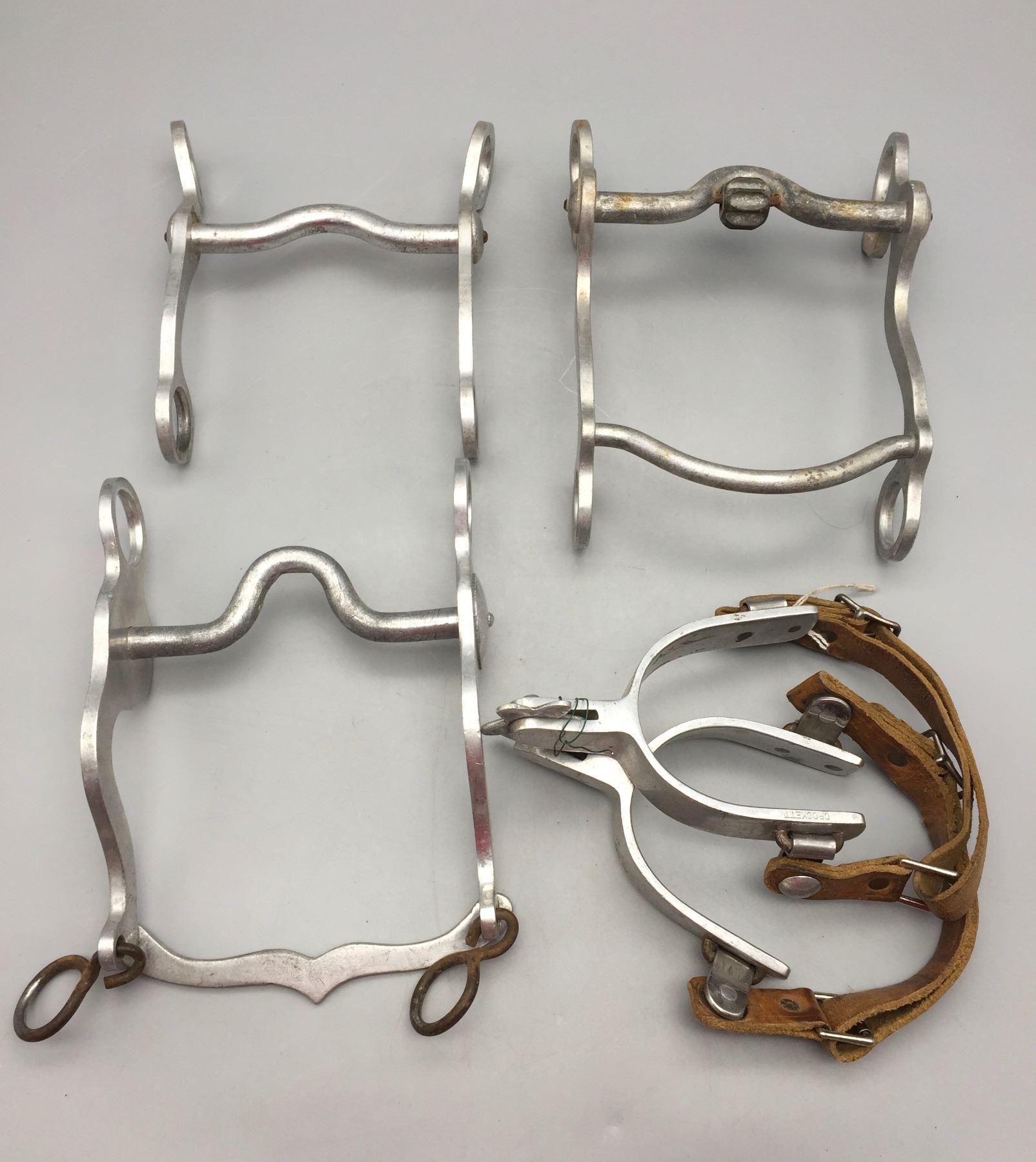 Description: Included for sale in this lot are a group of Crockett bits and spurs in varying sizes and styles. All are the lightweight, aluminum and the spurs include brown leather straps. Maker: All marked Crockett. Approx. Age: Vintage. Size: Spurs measure with a 3” heel, 2-1/4” shank and 1” band. Bits measure with a 5” mouth, 8” shank and 5” mouth, 8” shank and 4-5/8” mouth, 6-5/8” shank. Condition: Good for their age, normal wear expected. Please look closely at the pictures - they are an important part of our description. Shipping: There will be a $8 handling / packaging fee for shipping this lot. The actual cost of postage will be added on top of that.