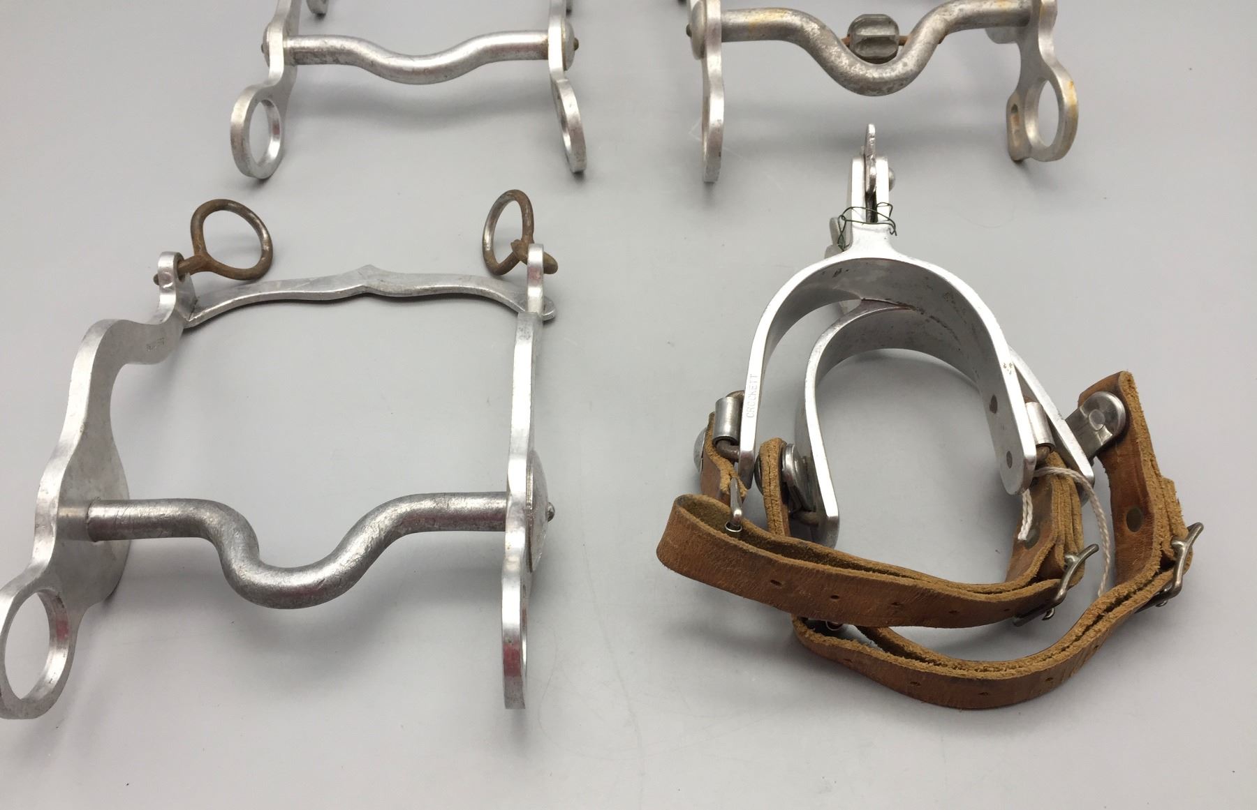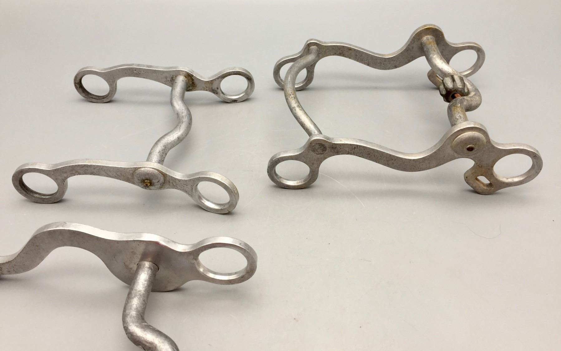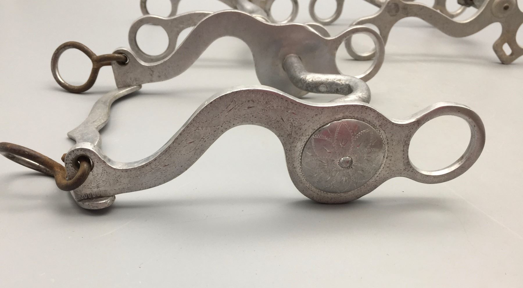 Description: Included for sale in this lot are a group of Crockett bits and spurs in varying sizes and styles. All are the lightweight, aluminum and the spurs include brown leather straps. Maker: All marked Crockett. Approx. Age: Vintage. Size: Spurs measure with a 3” heel, 2-1/4” shank and 1” band. Bits measure with a 5” mouth, 8” shank and 5” mouth, 8” shank and 4-5/8” mouth, 6-5/8” shank. Condition: Good for their age, normal wear expected. Please look closely at the pictures - they are an important part of our description. Shipping: There will be a $8 handling / packaging fee for shipping this lot. The actual cost of postage will be added on top of that.