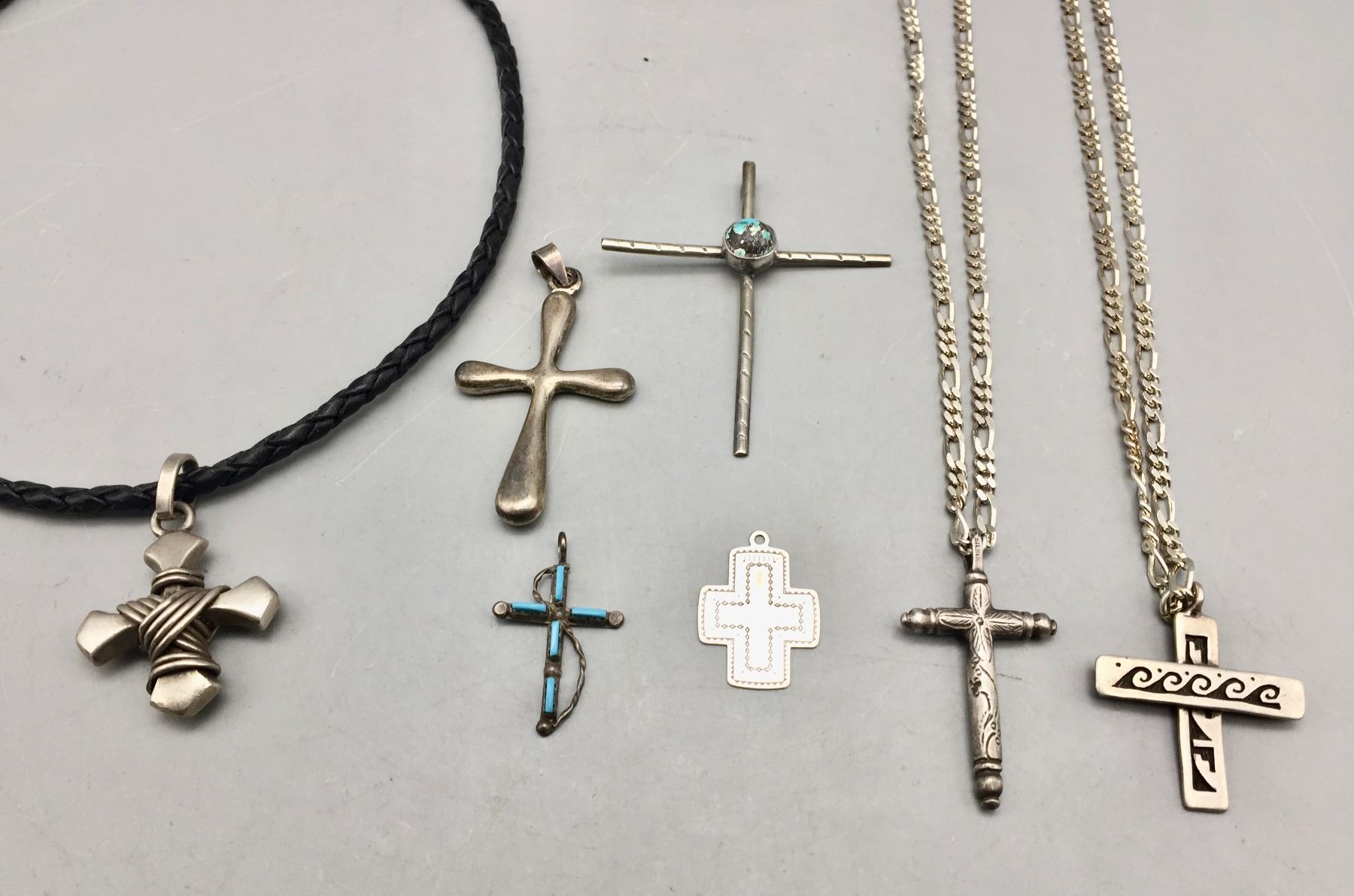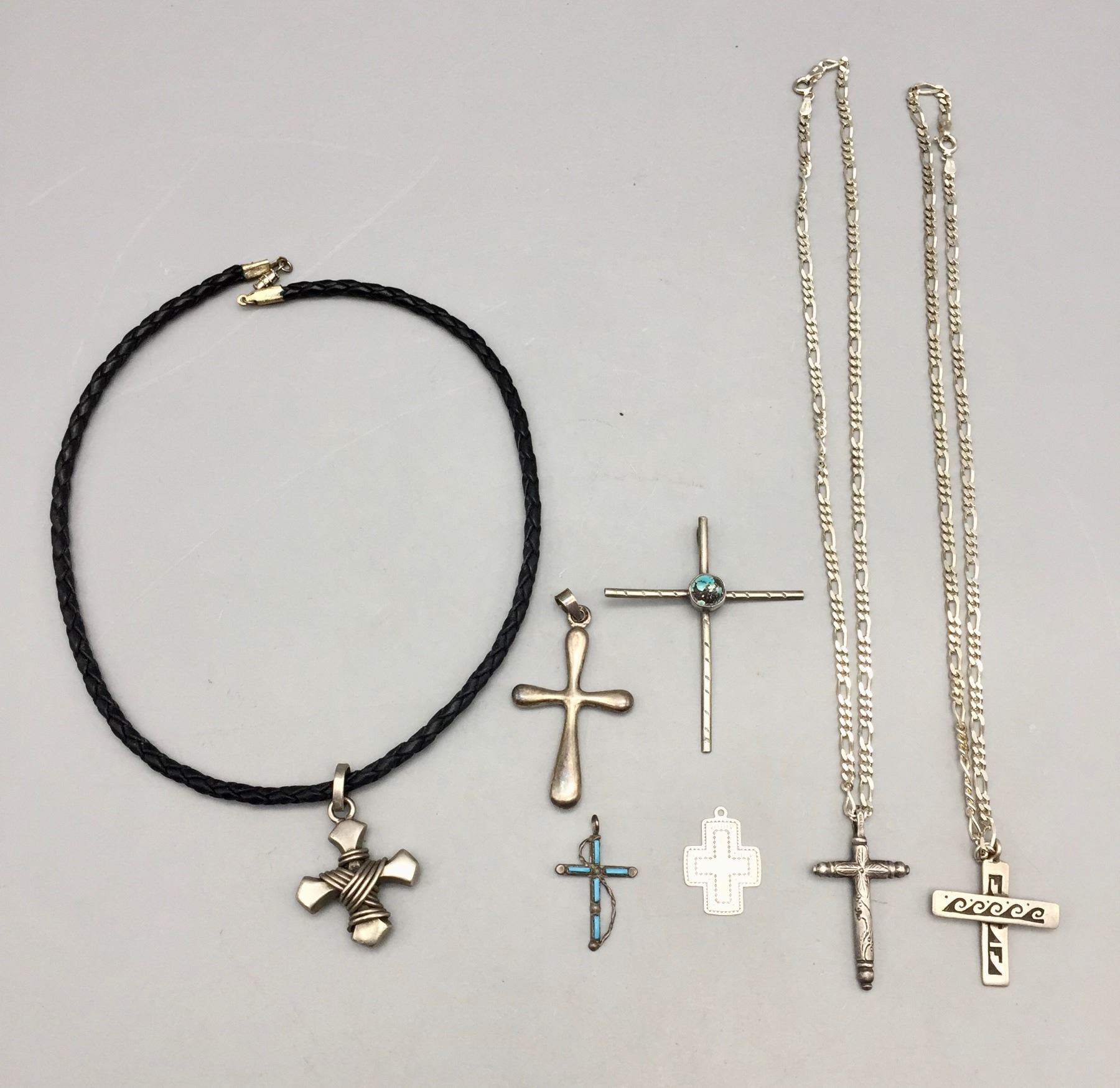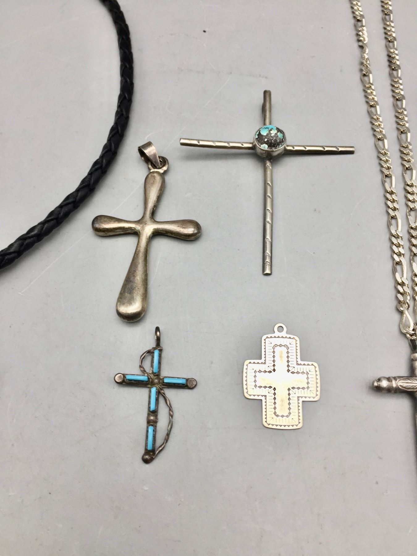 Description: Offered for sale in this lot is a group of cross jewelry. Some of the crosses have turquoise and chains and they all appear to be sterling silver.
