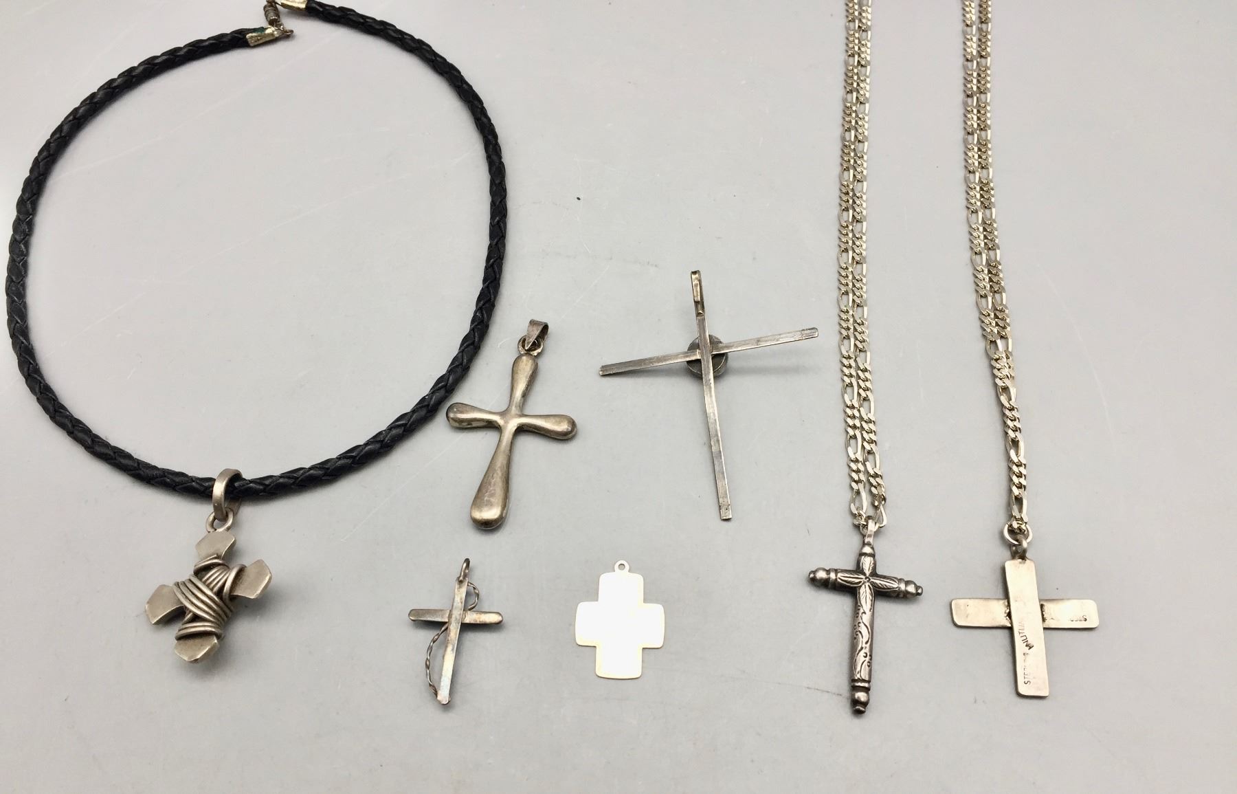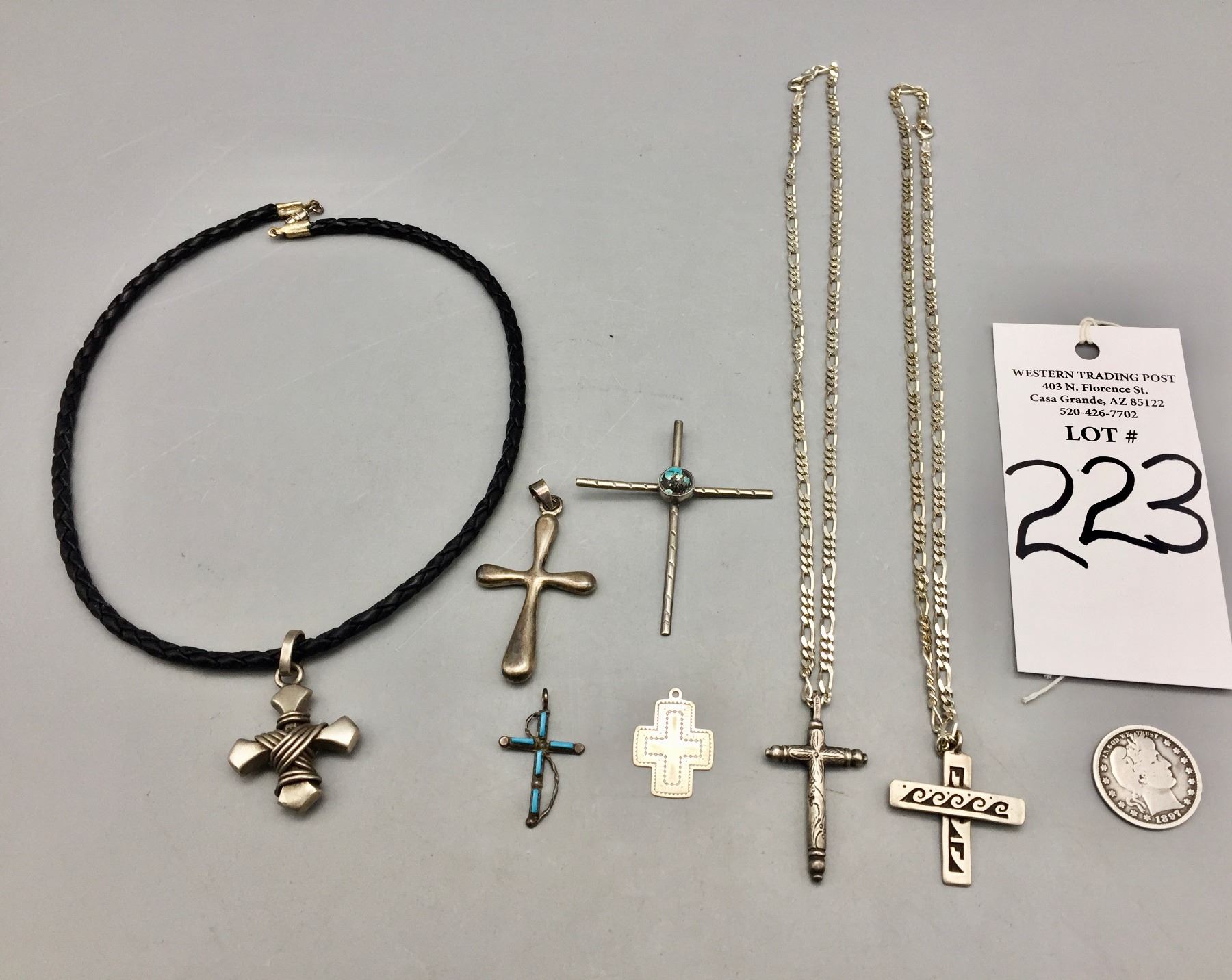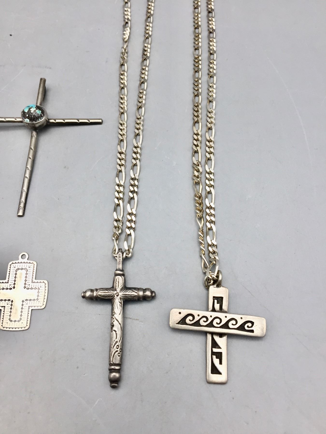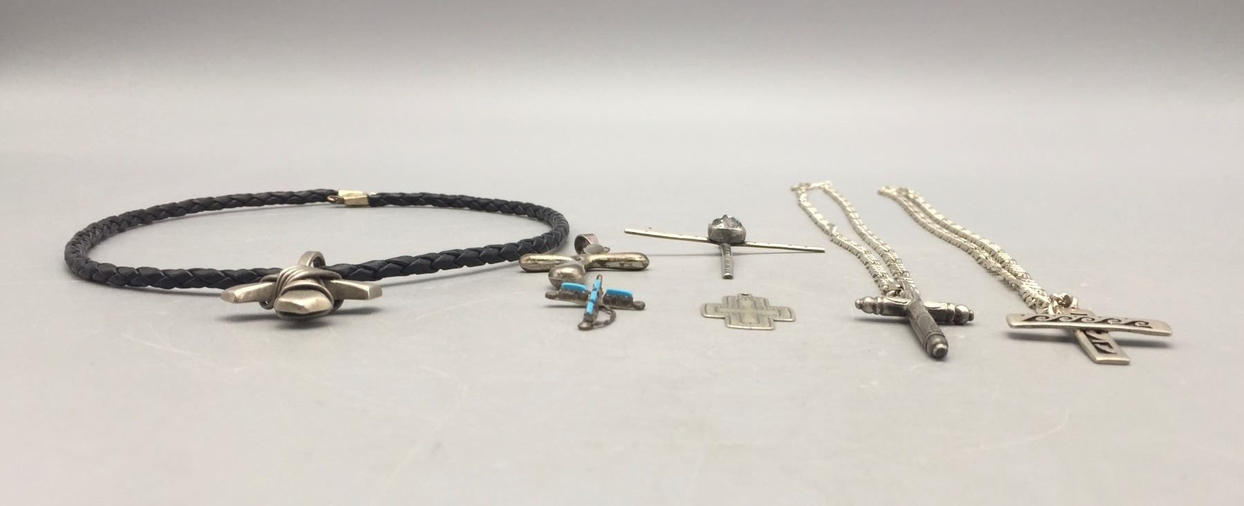 Description: Offered for sale in this lot is a group of cross jewelry. Some of the crosses have turquoise and chains and they all appear to be sterling silver.