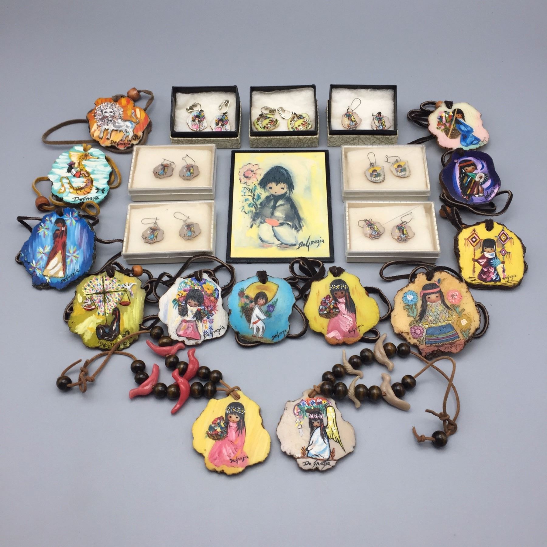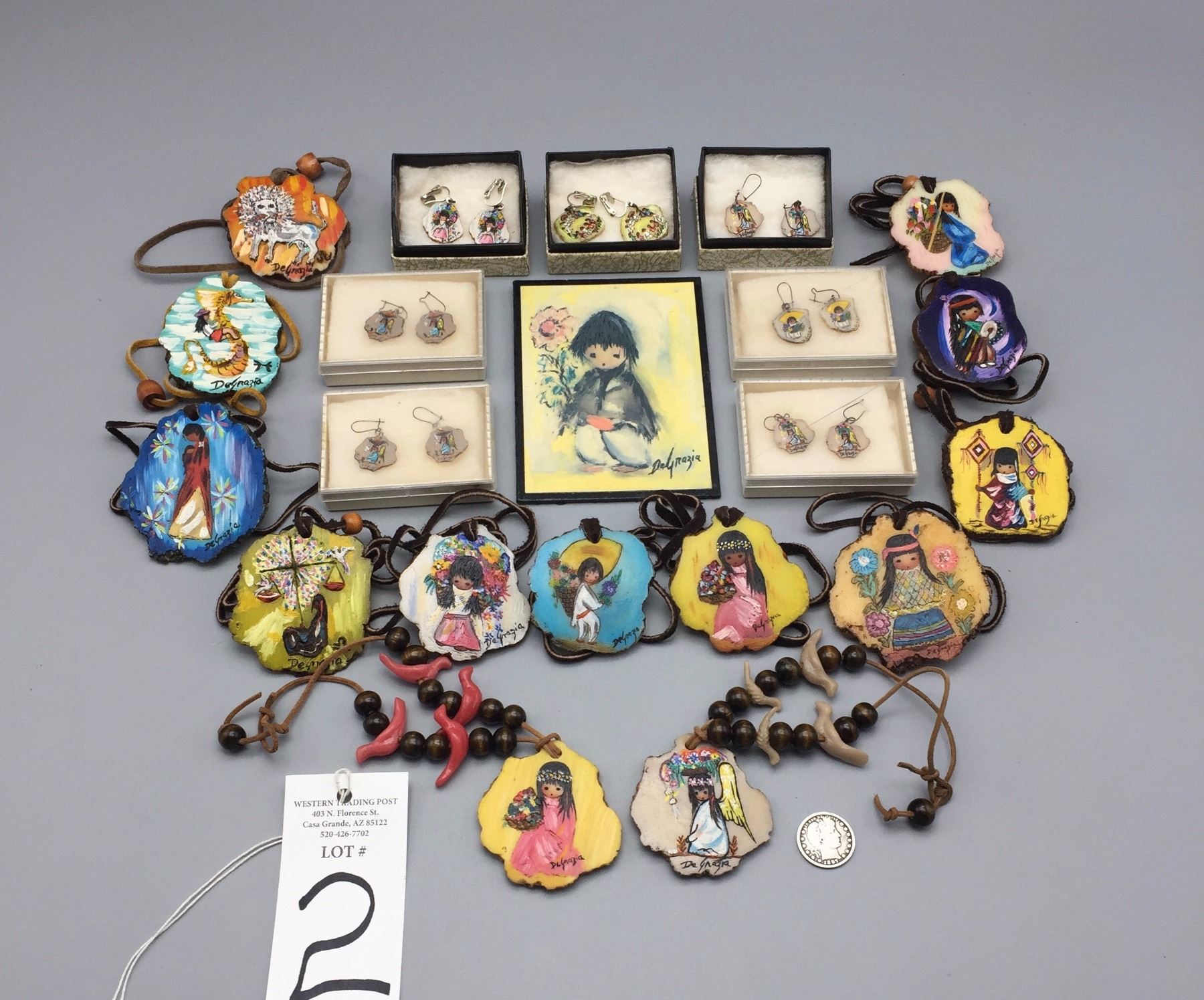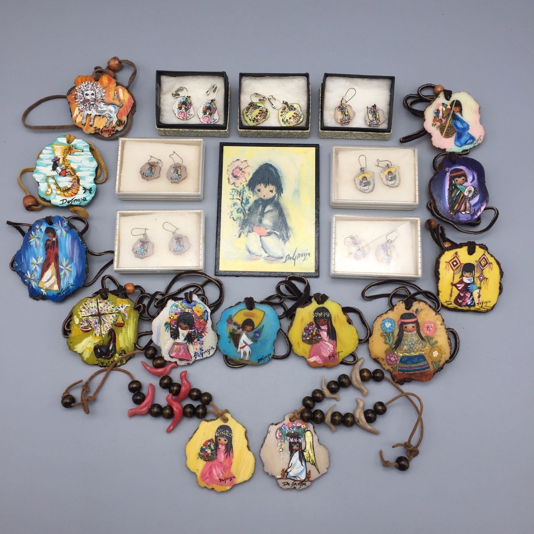 Maker: DeGrazia designs. Approx. Age: Circa 1980s. Size: Varies. Additional Info: NOS. 13 necklaces, 7 pair of earrings and a wooden plaque. Condition: Good for their age. Please look closely at the pictures - they are an important part of our description. Shipping: There will be a $7 handling / packaging fee for shipping this lot. The actual cost of postage will be added on top of that.