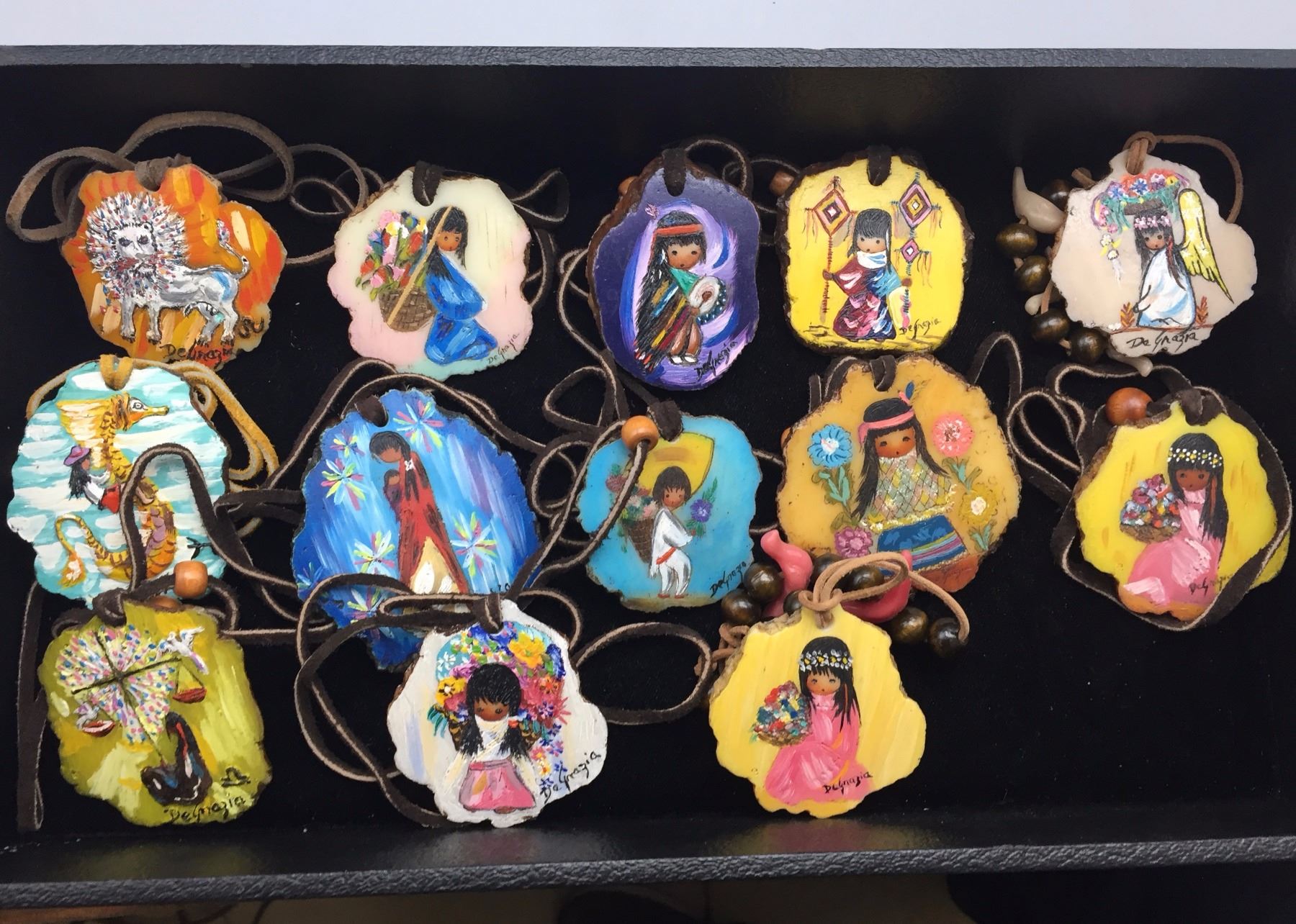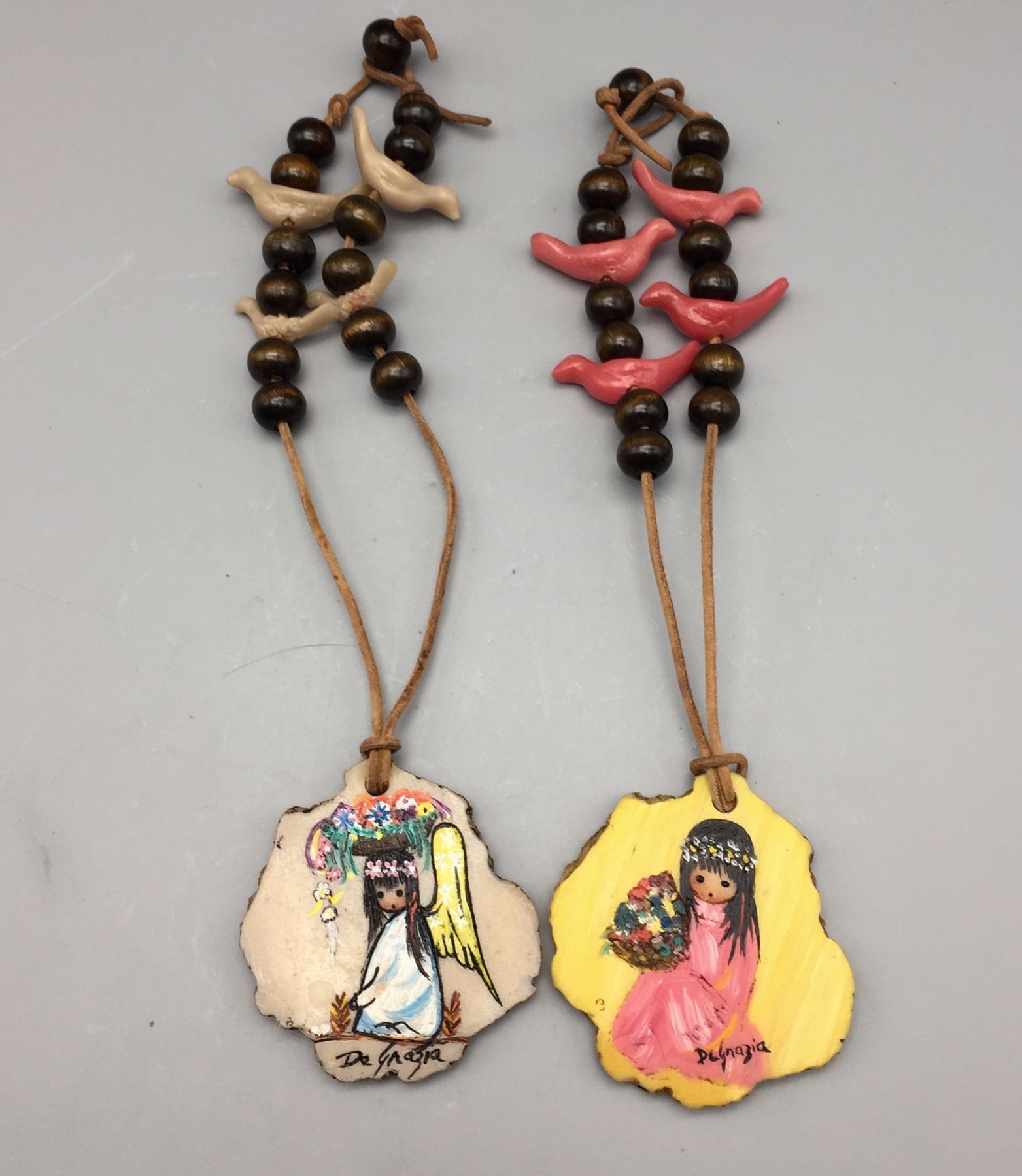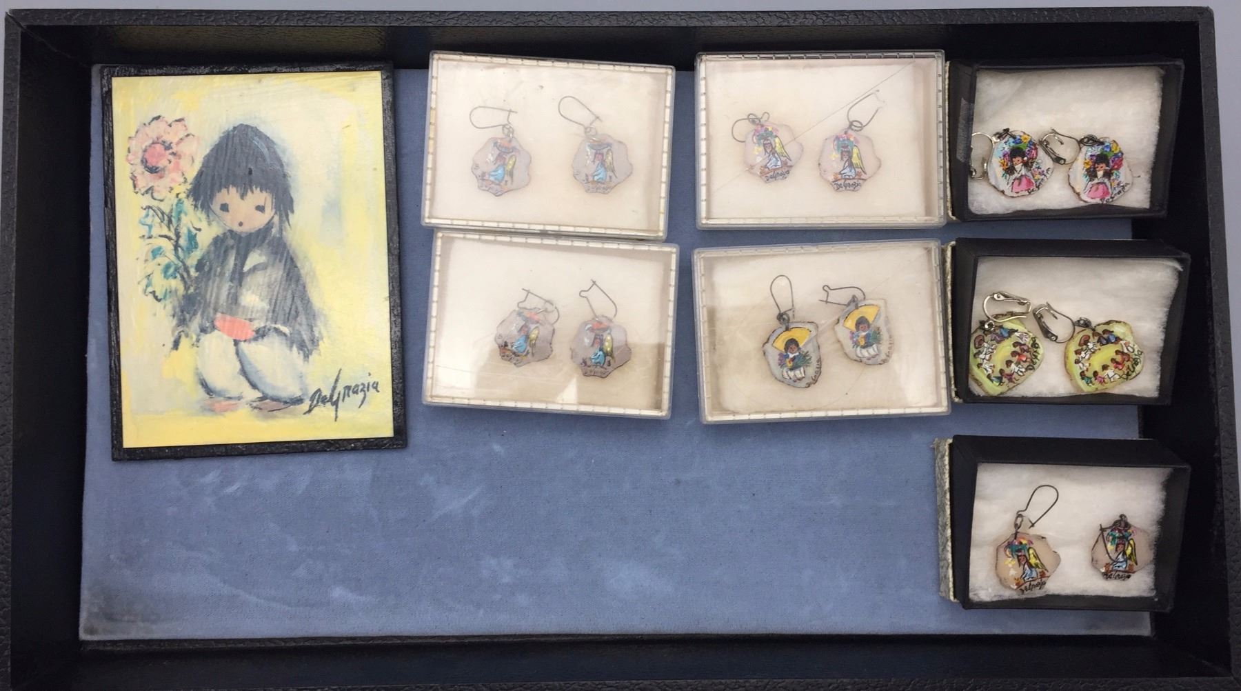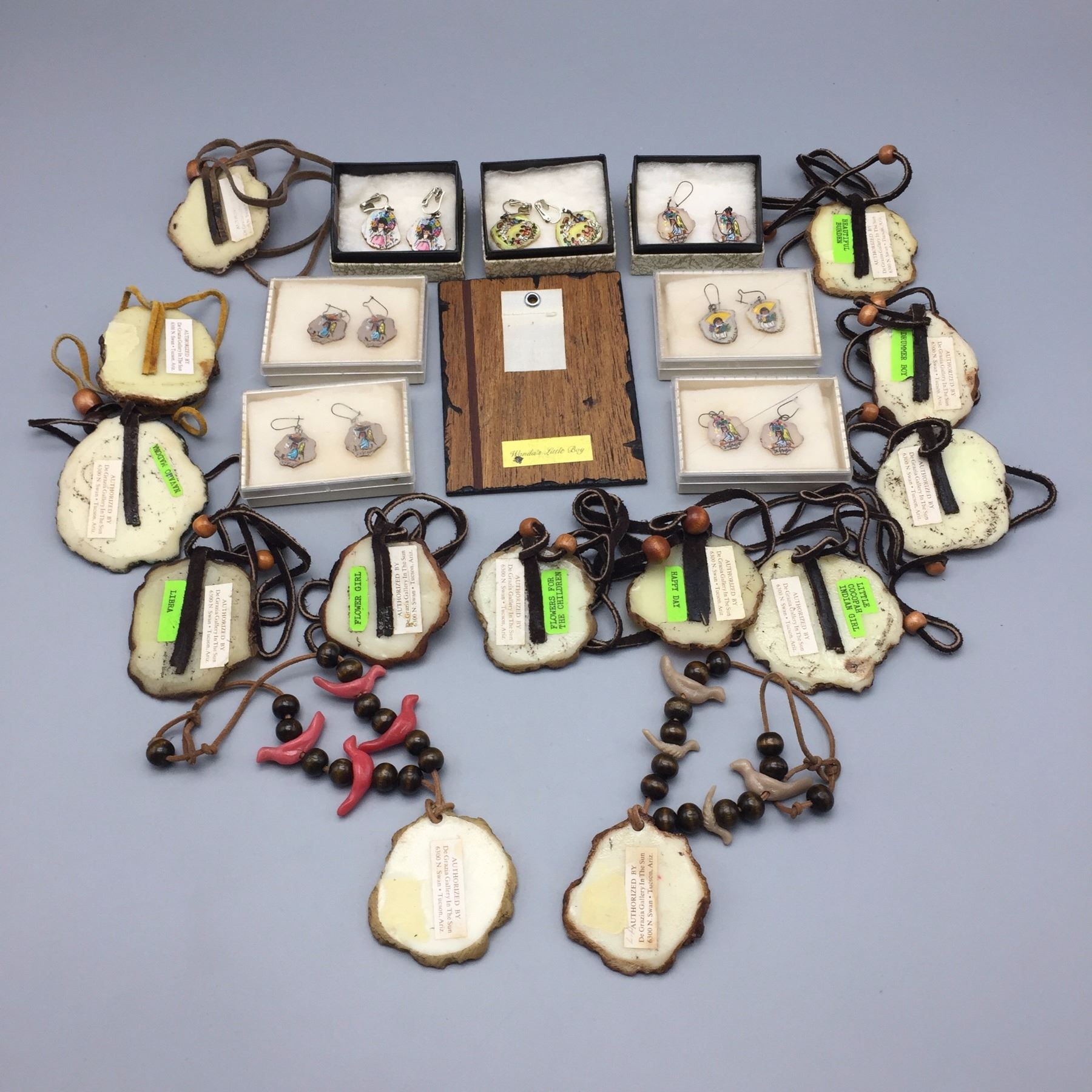 Maker: DeGrazia designs. Approx. Age: Circa 1980s. Size: Varies. Additional Info: NOS. 13 necklaces, 7 pair of earrings and a wooden plaque. Condition: Good for their age. Please look closely at the pictures - they are an important part of our description. Shipping: There will be a $7 handling / packaging fee for shipping this lot. The actual cost of postage will be added on top of that.