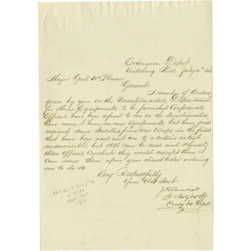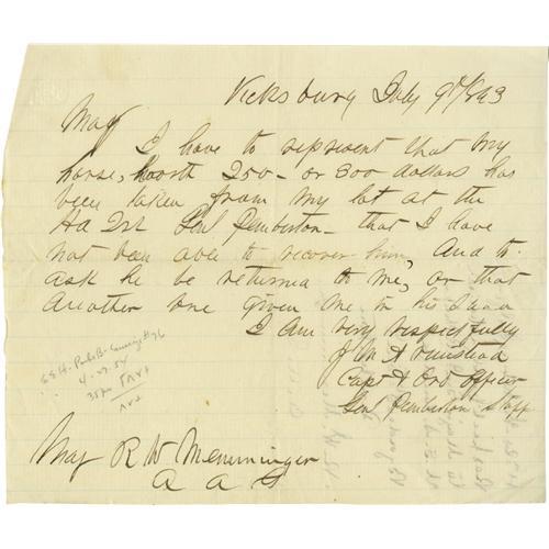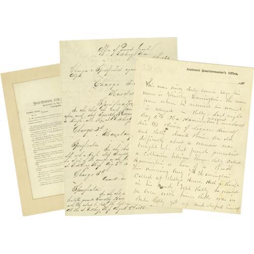 <B>Civil War - Group of Documents Pertaining to Vicksburg</B></I> including most notably charges and specifications brought against James Kelly for the charge of manslaughter, dated Aug. 27, 1863; with a sworn statement from witnesses. Also, an LS from Captain G.L. Fort, Sept. 3, 1863 detailing the current state of orders and boat assignments, he writes: "<I>I am entirely out of coal, and wood, General Grant ordered the last barge of coal I had sent to Orleans yesterday, we are now without any fuel...</B></I>". DS, "<I>JM Armistead</B></I>", July 9, 1863, stating that his horse was taken and not returned at Gen. Pemberton's head quarters; an LS to General McPherson dated July 14, 1863 regarding issuing horse equipment to Confederate officers: "<I>I have no new equipment but have just received some saddles from out troops in the field that have been used and are to a certain extent unserviceable...</B></I>"; a printed copy of General Orders No. 13, dated April 4, 1864 awarding the Medal of Honor to soldiers and officers for service at Champion Hills, Vicksburg, July 4, 1863. Total of 7 items, all in very good condition.<BR><BR><b>Shipping:</b> Small Flat (<a target="_blank" href="http://www.heritageauctions.com/common/shipping.php">view shipping information</a>)