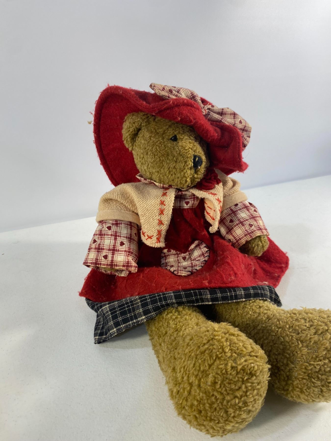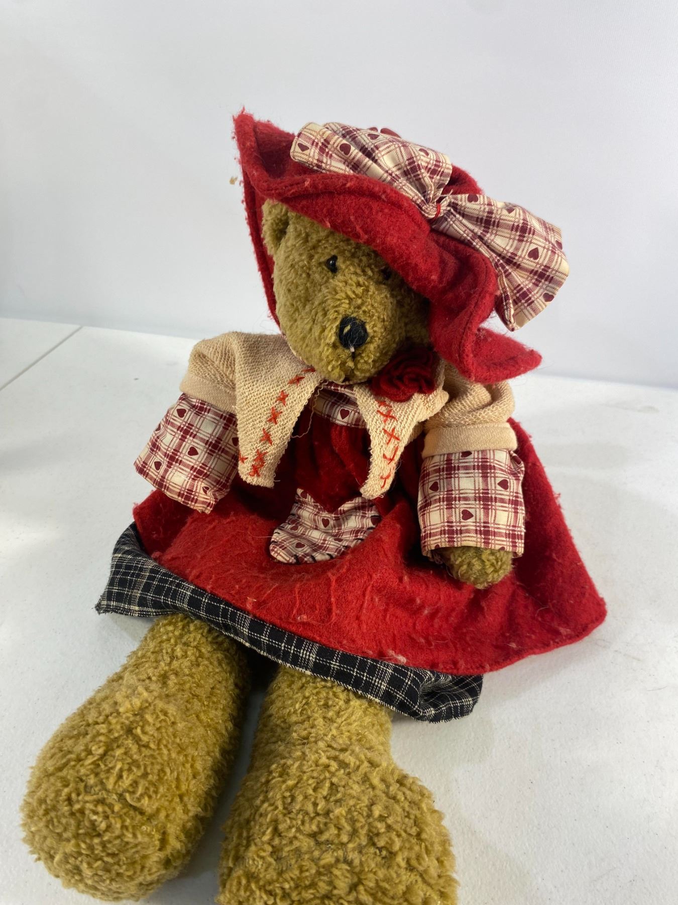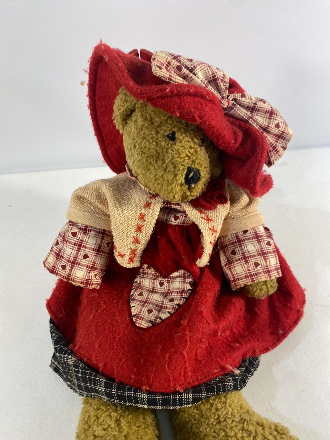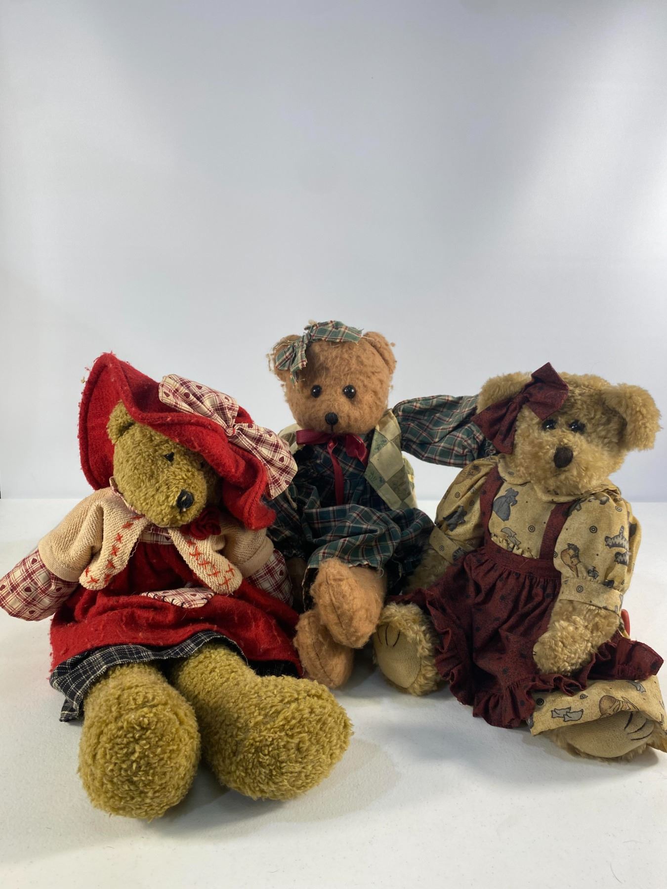 Trio of teddy bears dressed in plaid and red country-style outfits, each with detailed fabric clothing.  Approx. 12" tall  Condition: Good; light wear to fabric and fur.