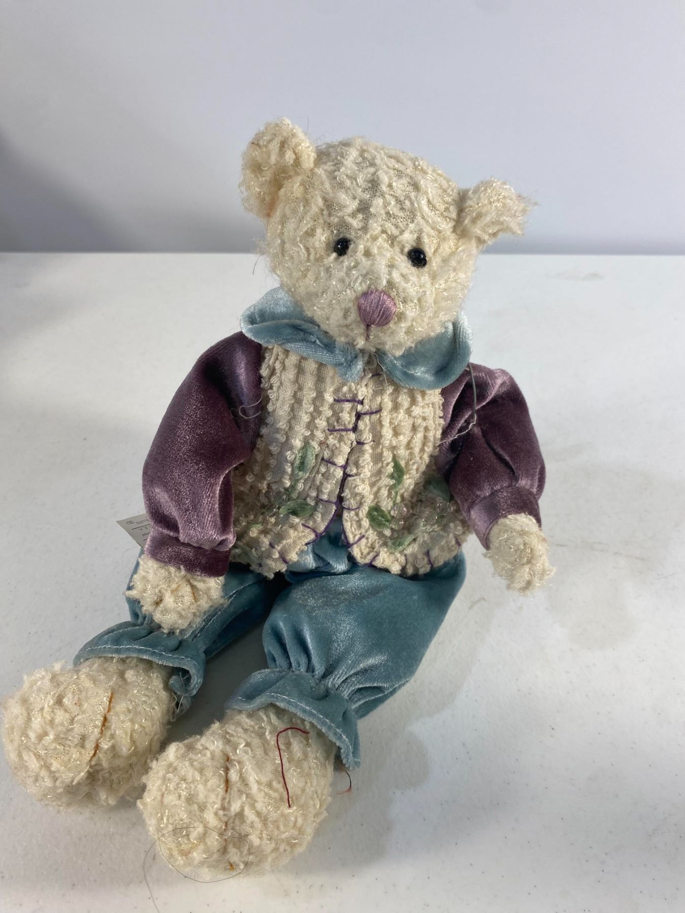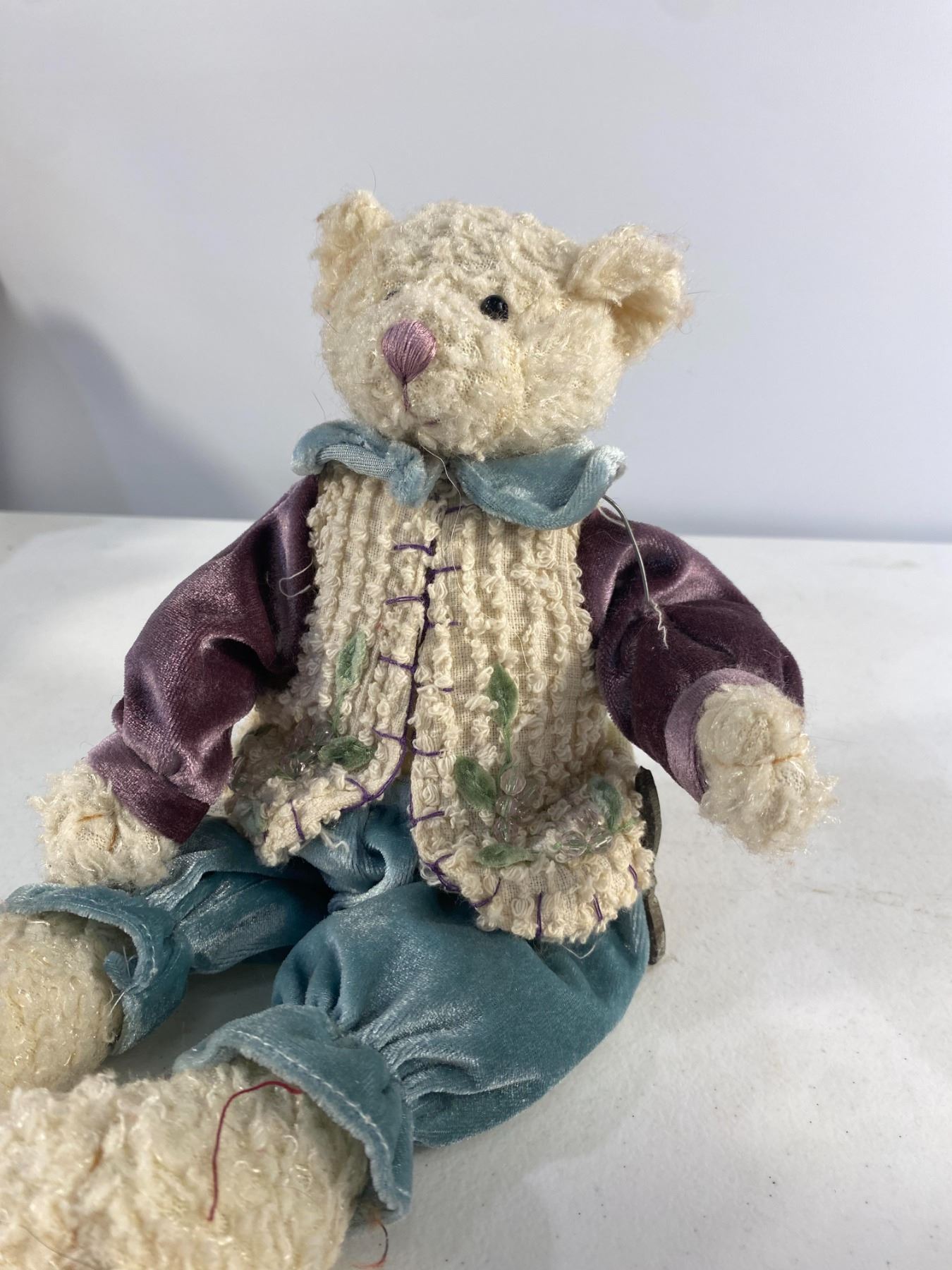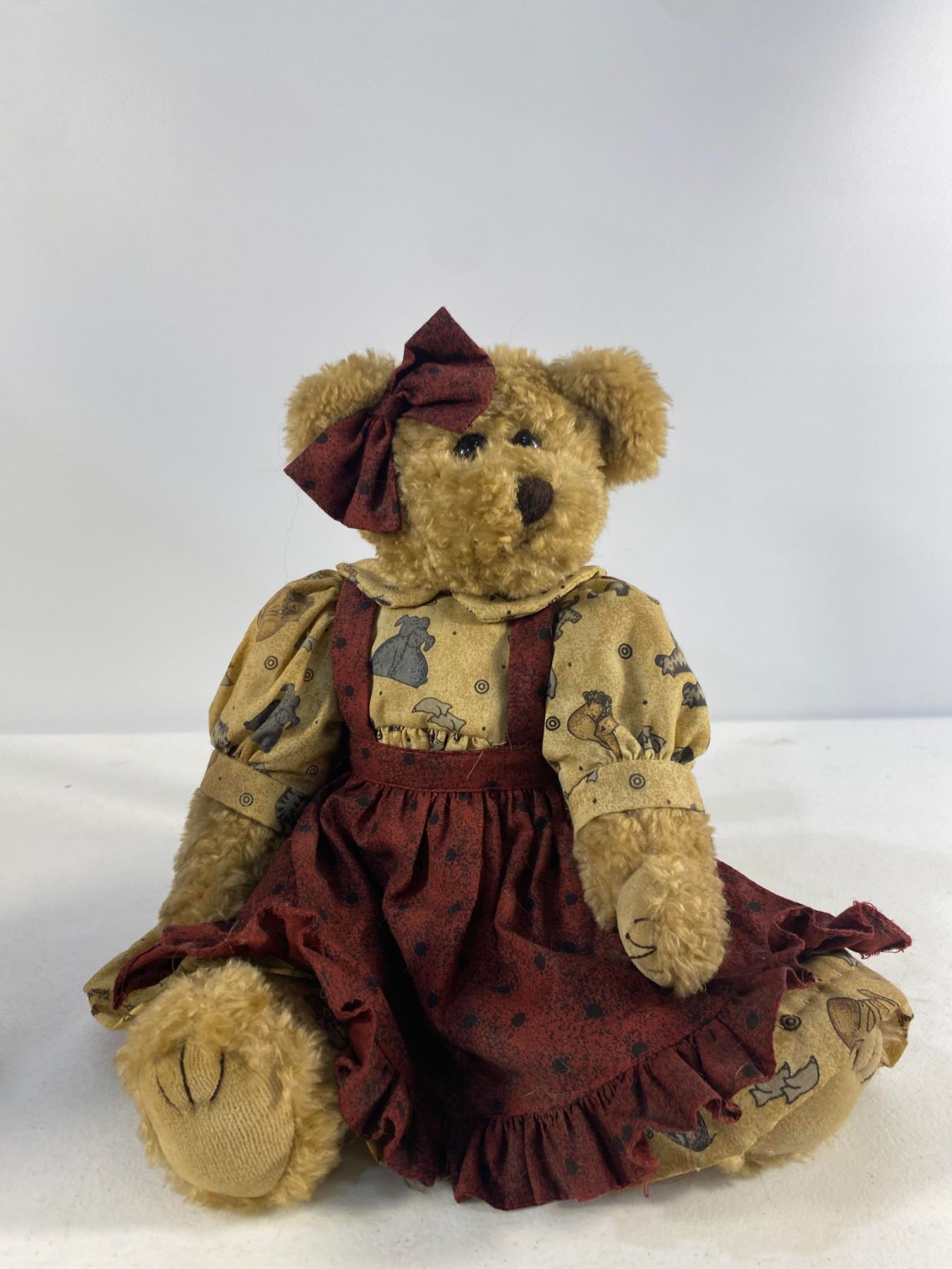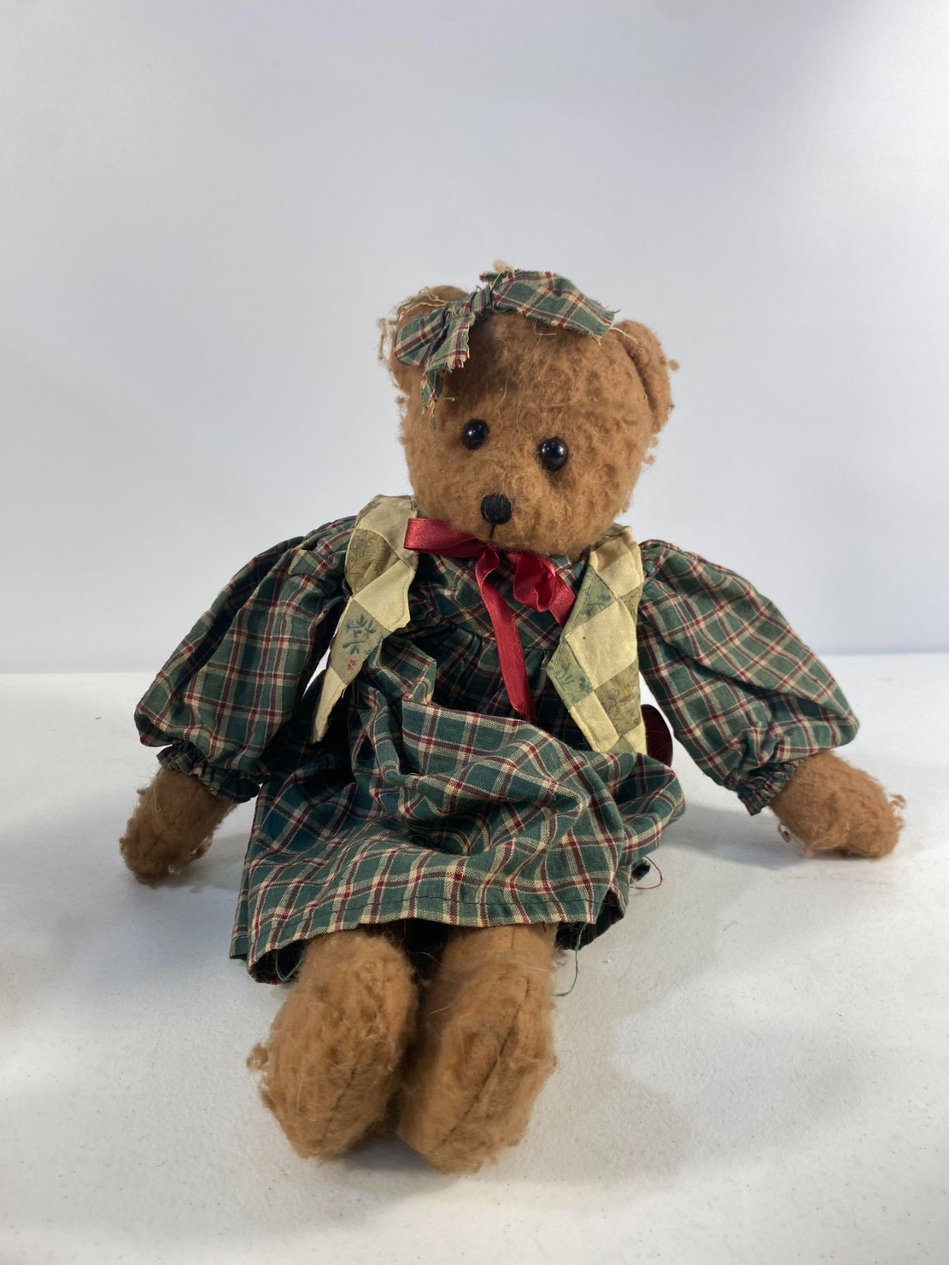 Trio of teddy bears dressed in plaid and red country-style outfits, each with detailed fabric clothing.  Approx. 12" tall  Condition: Good; light wear to fabric and fur.