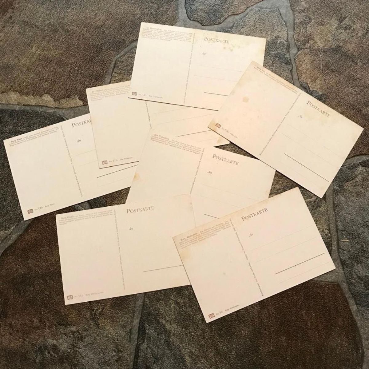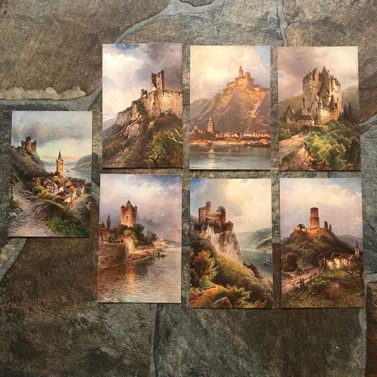 Group of 7 early 1900's Grand Tour travel artwork postcards ( postkartes )Â depicting castle scenes along the Rhine River, Germany. 3 1/2" X 5 1/2" each. Unused & perfect for framing individually.