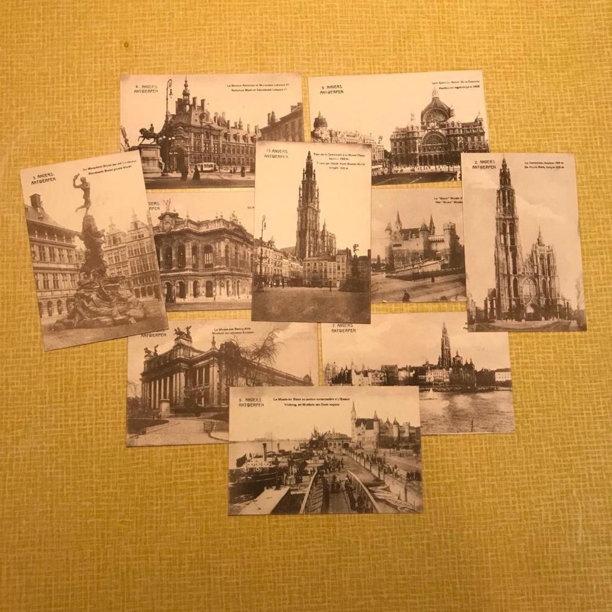 Early 1900's sepia tone numbered postcards. Grand Tour collectibles from Antwerp Belgium, Anvers Antwerpen. Scenes include: #2 Le Cathedrale, #3 Le Monument Brabo, #4 La Banque Nationale et Monument Leopold, #5 La Musee de Steen au ponton, #6 Le Musee de Beaux Arts, #7 Panorama de lav Ville, #9 Le "Steen", #9 Gare Centrale, #11 Le Theatre Royal Flamand, #13 Tour de la Cathedrale a la Grand Place. 3 1/2" X 5 1/2" each.Â