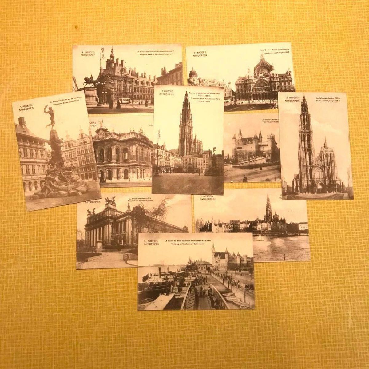 Group of 10 early 1900's sepia-tone numbered postcards. Grand Tour collectibles from Antwerp Belgium, Anvers Antwerpen. Scenes include: #2 Le Cathedrale, #3 Le Monument Brabo, #4 La Banque Nationale et Monument Leopold, #5 La Musee de Steen au ponton, #6 Le Musee de Beaux Arts, #7 Panorama de lav Ville, #9 Le "Steen", #9 Gare Centrale, #11 Le Theatre Royal Flamand, #13 Tour de la Cathedrale a la Grand Place. 3 1/2" X 5 1/2" each.Â