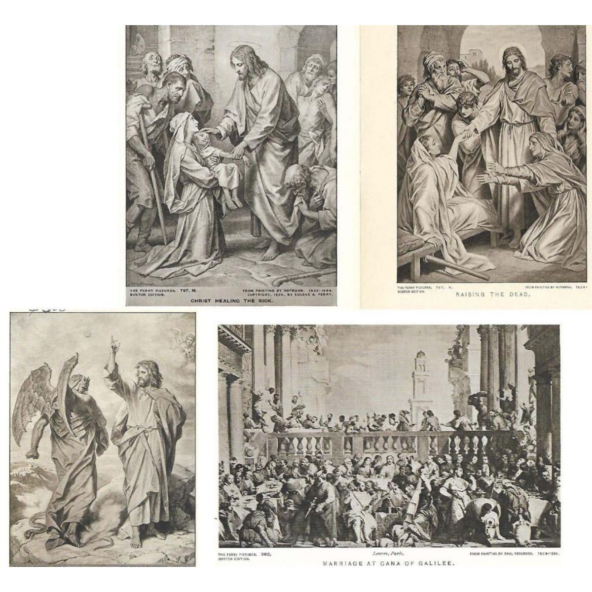 Group of  four early 1900's half tone prints by Perry Pictures including: Christ's Miracles/Messages: #797M Christ Healing the Sick (Hofmann), #797N Raising the Dead (Hofmann), # 382 Marriage at Cana of Galilee (Veronese), #797H The Temptation of Christ (Hofmann) 5 1/2" X 8" each, suitable for framing. *** In the early 1900's, Eugene Ashton Perry, Master of the Center Grammar School of Malden, Massachusetts, discovered the possibility of making and distributing half-tone reproductions of famous paintings, sculptures & architecture to be sold at reasonable prices so that everyone could afford to own art. Perry Group # 8. Â