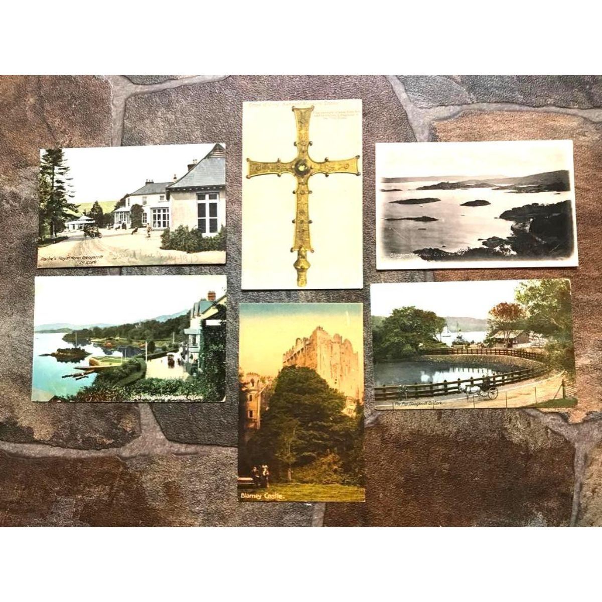 Five early 1900's Vacation Travel postcards of Ireland including: colored lithograph postcards of Blarney Castle with Edwardian couple standing lower left, Cross of Cong, National Museum, Dublin, The Eccles Hotel, Roche's Hotel & The Pier Glengarriff, County Cork & a black & white photo postcard of Glengarriff Harbour, County Cork. Â