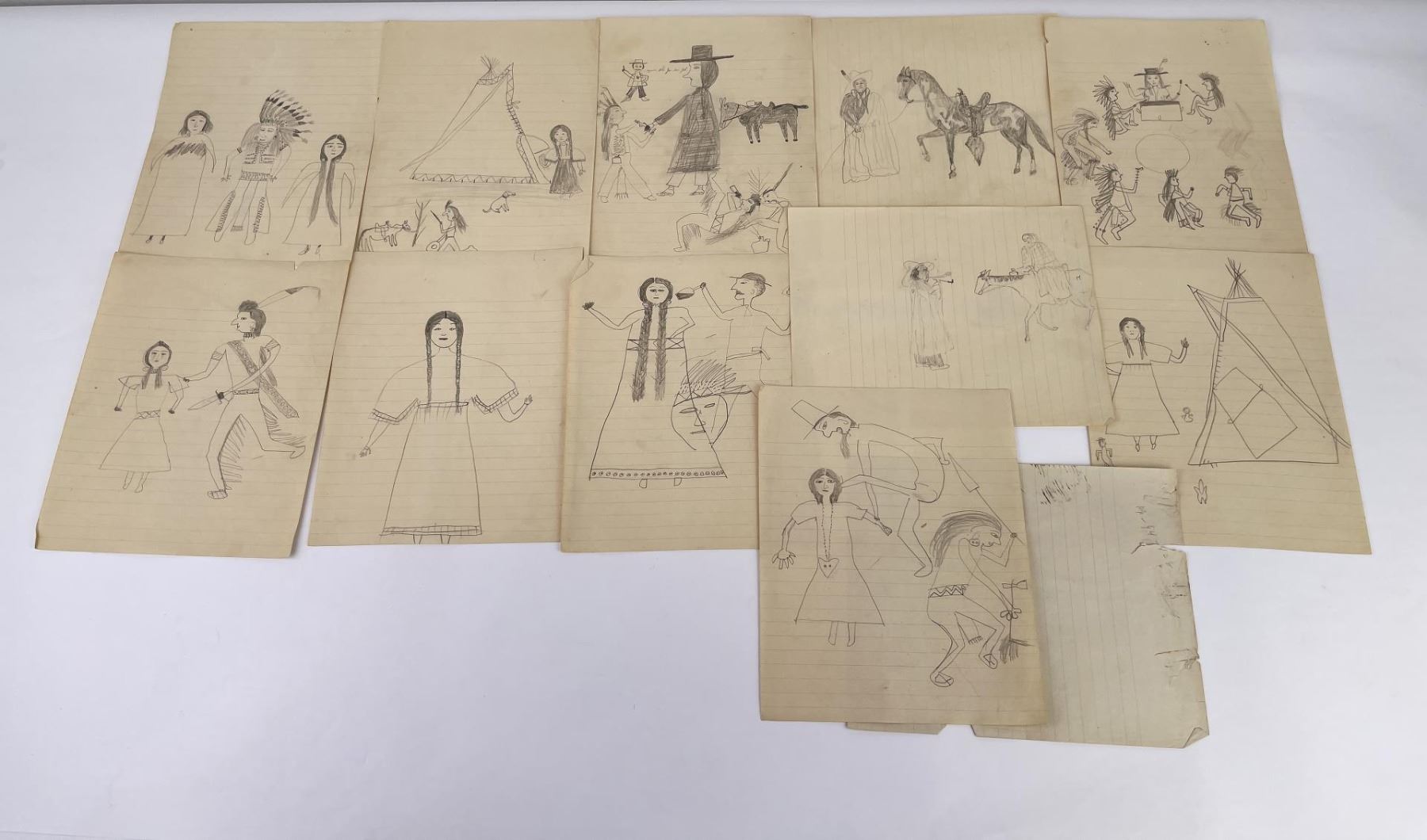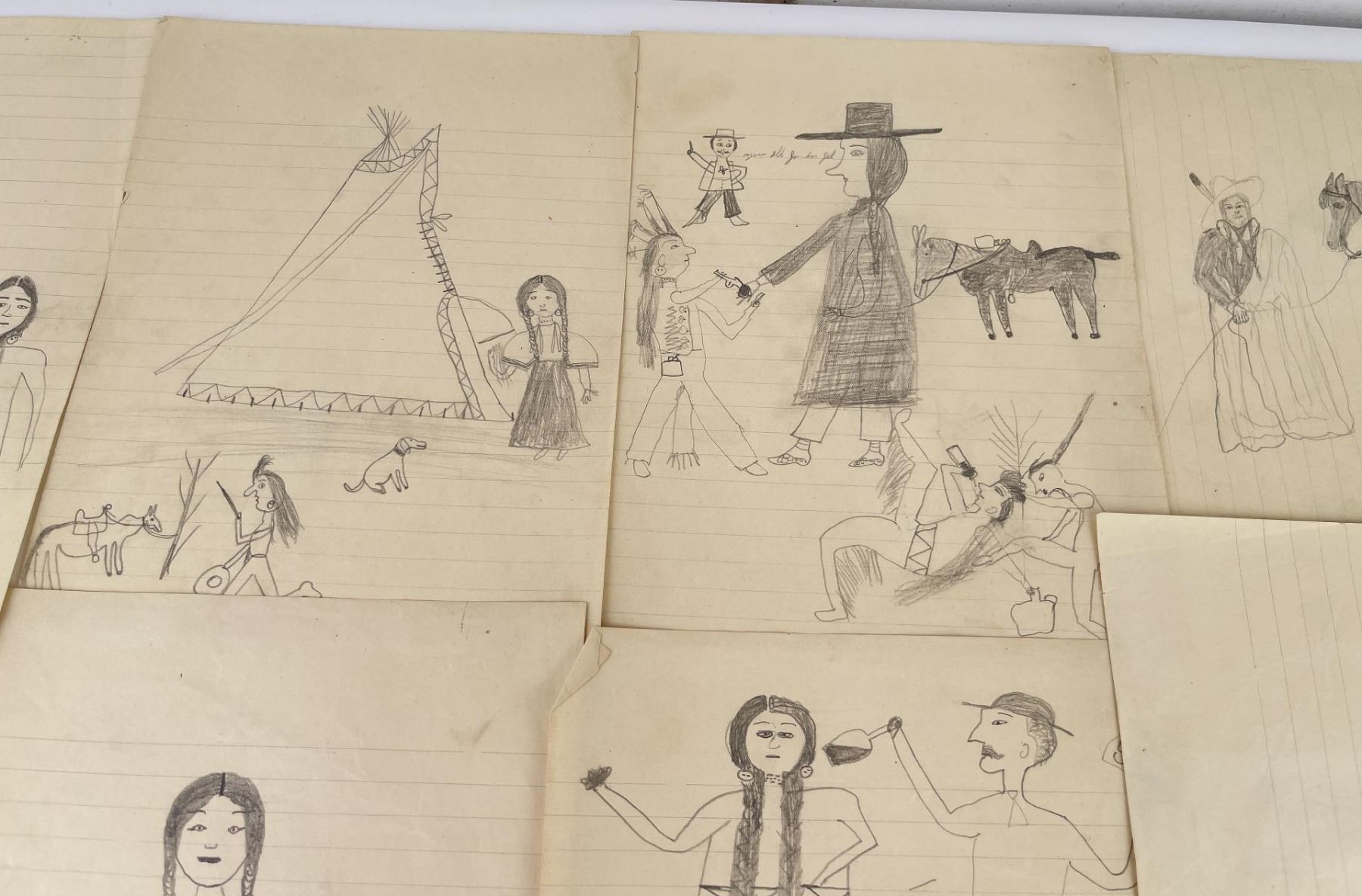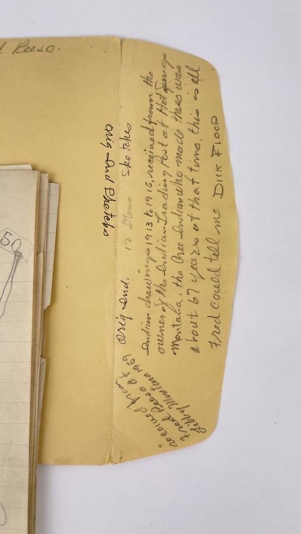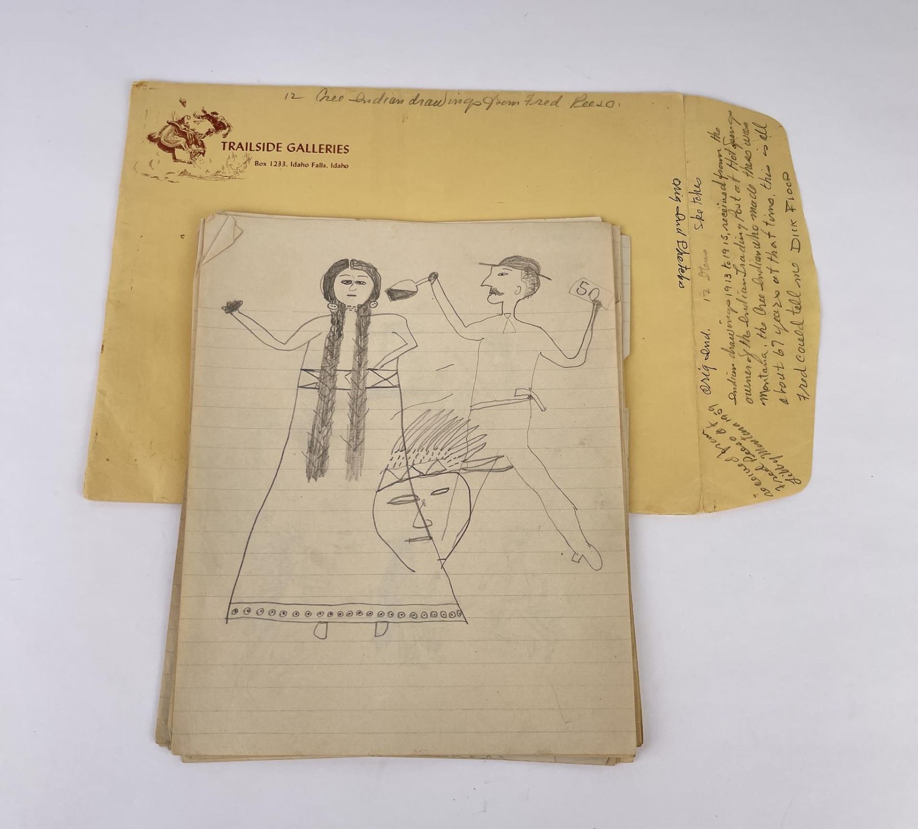 Very nice group of drawings. Total of 11. Depicting various frontier scenes, including violence against Native Women, Retaliation by the Indians against prairie Women, Drum Circles, Frontier scenes, and one that appears to be of a Missionary. Fantastic group of images. Purchased by Dick Flood in Montana. Kept in an original Trailside Galleries envelope, with pencil notation on the outer flap: "received from Fred Peeso of Libby Montana 1959 / Indian drawings 1913 to 1915, received from the owner of the Indian Trading Post at Hot Springs Montana. The Cree Indian who made these was about 67 years at that time, this is all Fred could tell me. DICK FLOOD".