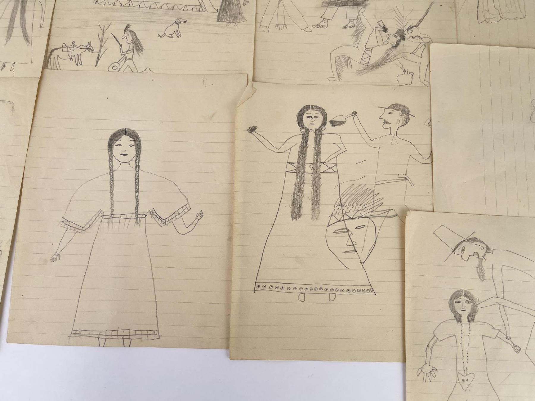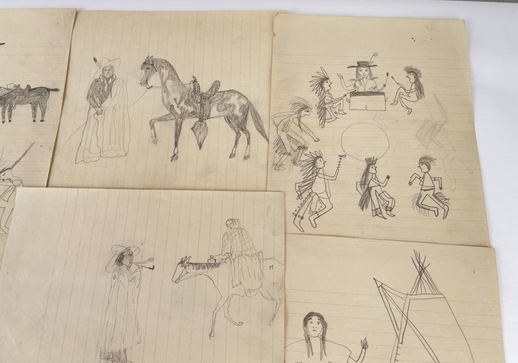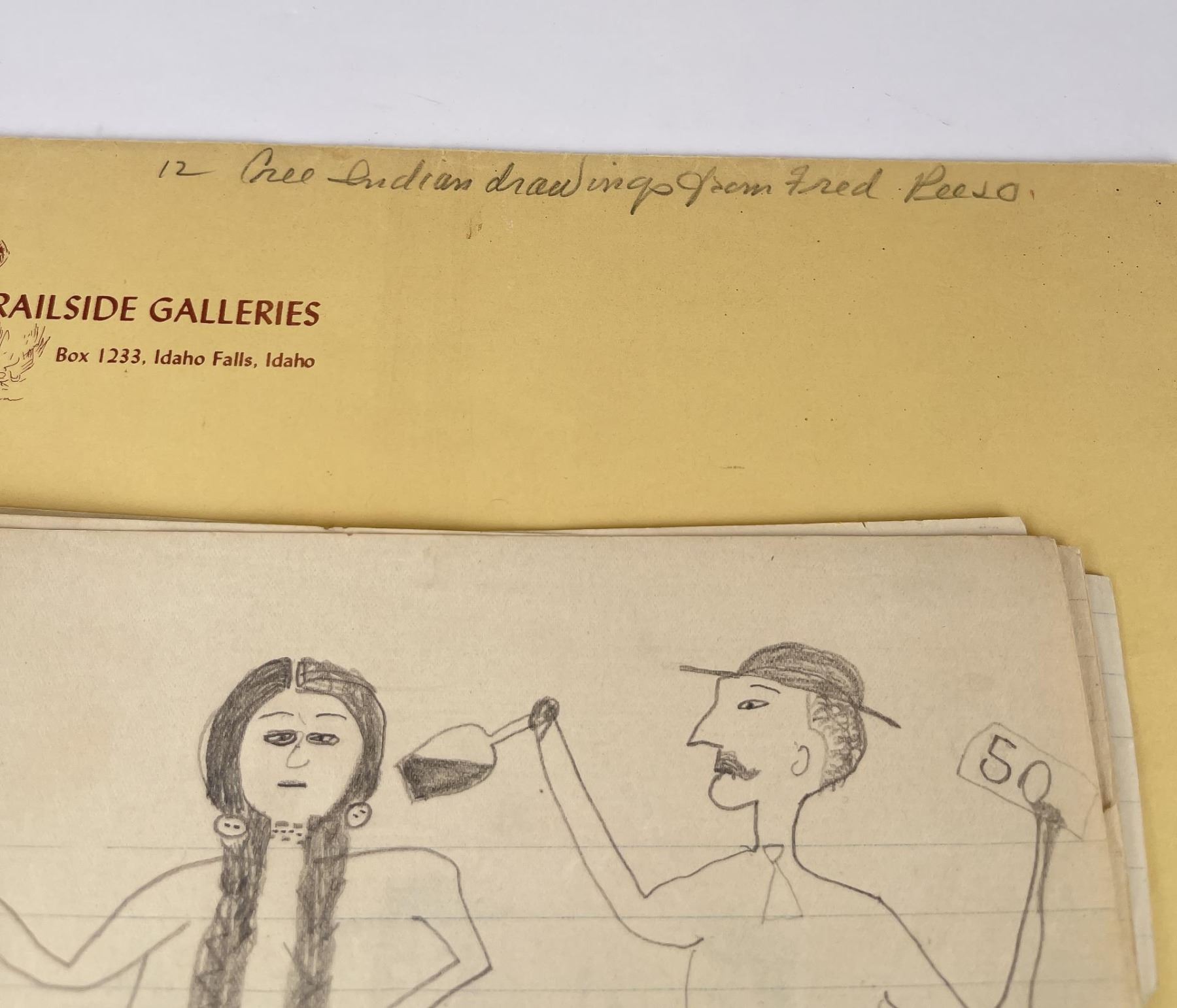 Very nice group of drawings. Total of 11. Depicting various frontier scenes, including violence against Native Women, Retaliation by the Indians against prairie Women, Drum Circles, Frontier scenes, and one that appears to be of a Missionary. Fantastic group of images. Purchased by Dick Flood in Montana. Kept in an original Trailside Galleries envelope, with pencil notation on the outer flap: "received from Fred Peeso of Libby Montana 1959 / Indian drawings 1913 to 1915, received from the owner of the Indian Trading Post at Hot Springs Montana. The Cree Indian who made these was about 67 years at that time, this is all Fred could tell me. DICK FLOOD".