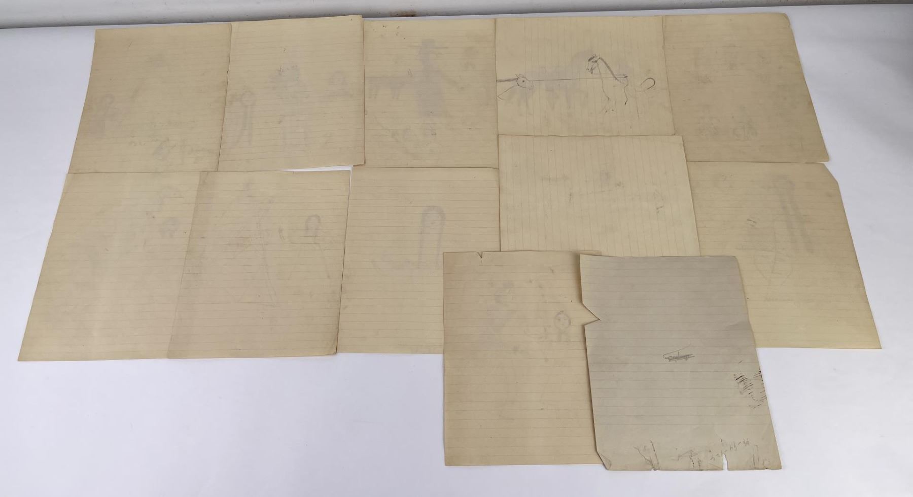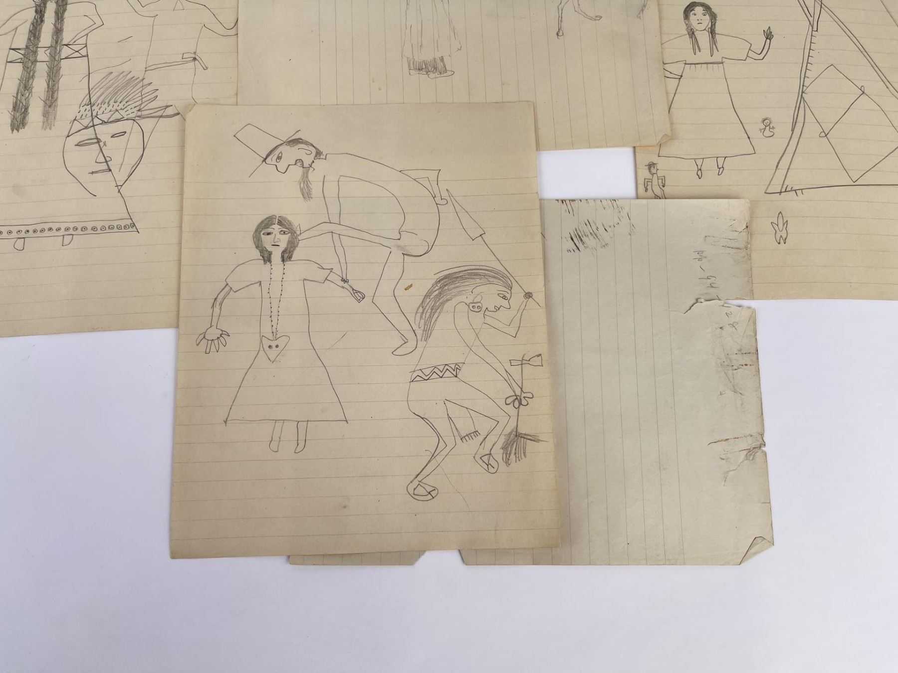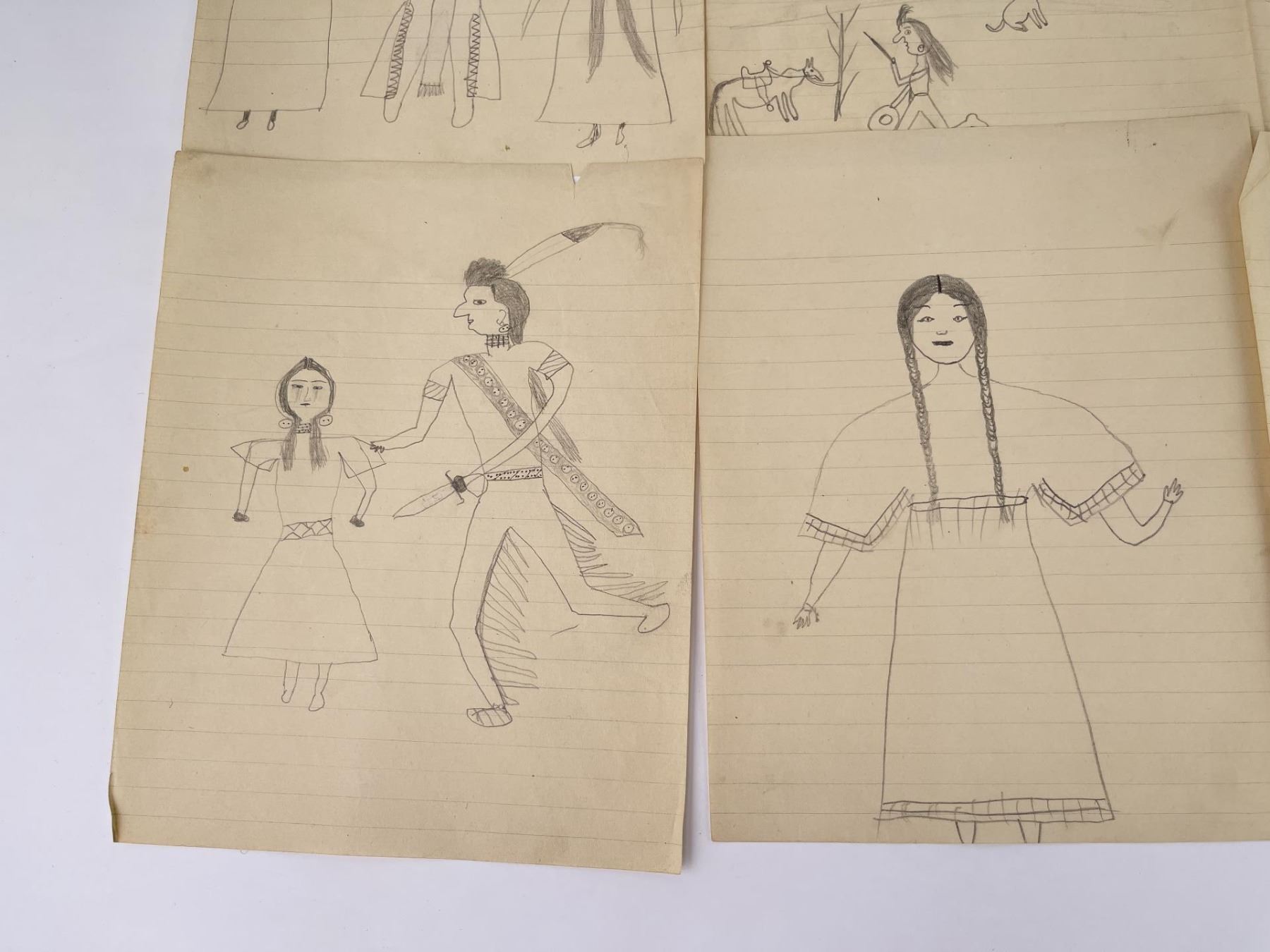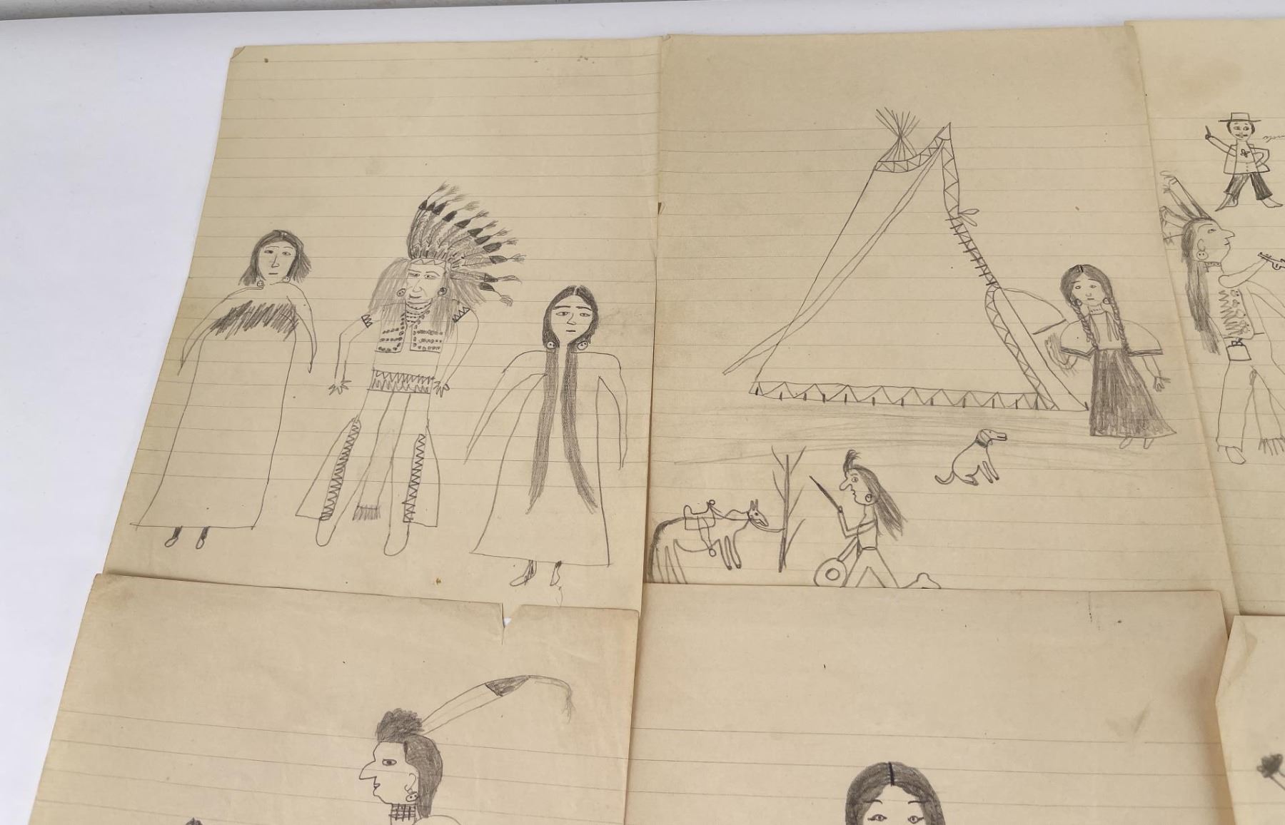 Very nice group of drawings. Total of 11. Depicting various frontier scenes, including violence against Native Women, Retaliation by the Indians against prairie Women, Drum Circles, Frontier scenes, and one that appears to be of a Missionary. Fantastic group of images. Purchased by Dick Flood in Montana. Kept in an original Trailside Galleries envelope, with pencil notation on the outer flap: "received from Fred Peeso of Libby Montana 1959 / Indian drawings 1913 to 1915, received from the owner of the Indian Trading Post at Hot Springs Montana. The Cree Indian who made these was about 67 years at that time, this is all Fred could tell me. DICK FLOOD".