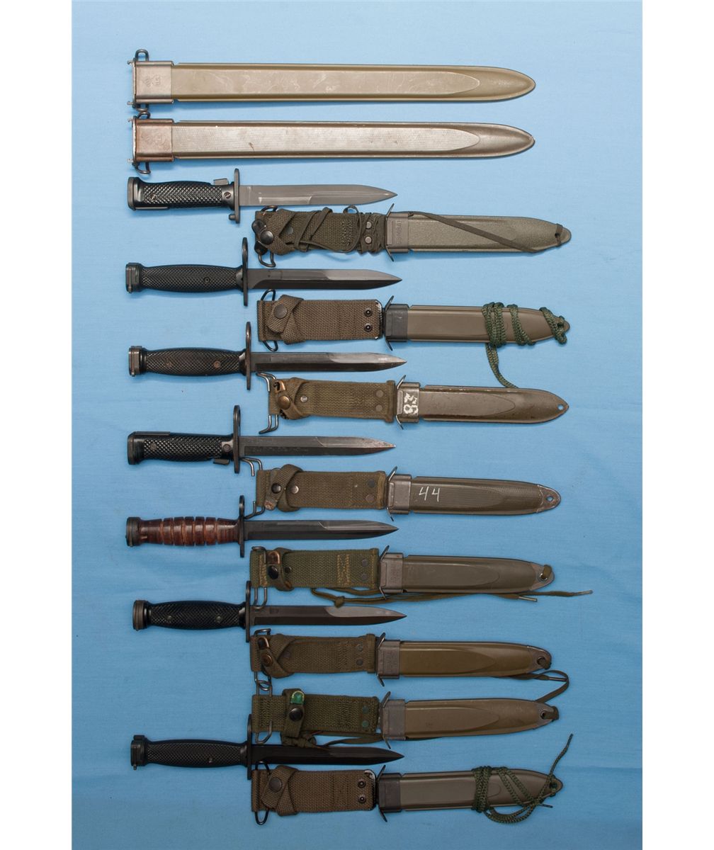 7 bayonets all with 6 3/4 inch blades and M8A1 scabbards. 3 loose scabbards. CONDITION: Very good or better overall.