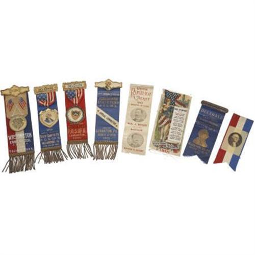 <B>Group of Eight Old Pennsylvania Ribbons</B></I>. All eight ribbons are in very nice condition. Five of these are for the Patriotic Order Sons of America and various events in Pennsylvania in the years 1901, 1902, 1903, and 1912. This fraternal group was very popular from the 1880s through the late teens. Two are for Pennsylvania locals and the other features a celluloid image of George Washington.<BR><BR><b>Shipping:</b> Flat Material, Small (<a target="_blank" href="http://www.heritageauctions.com/common/shipping.php">view shipping information</a>)