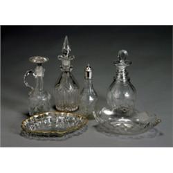 Consisting of a pair of decanters; four decanters, one with silver plate top; two cruets, one with English silver crested spout and handle; a pair of gilt-edged shallow dishes and a shaped-rim oval dish. Chips to rims; some stoppers probably replaced.