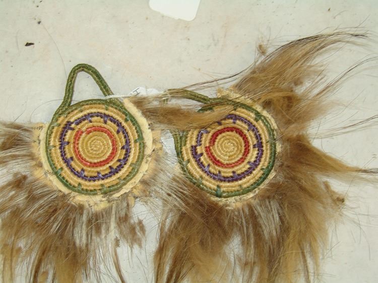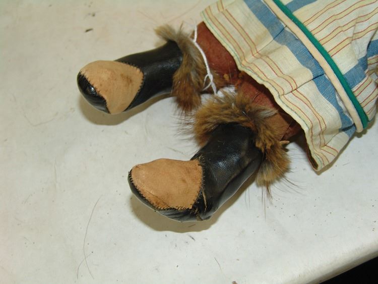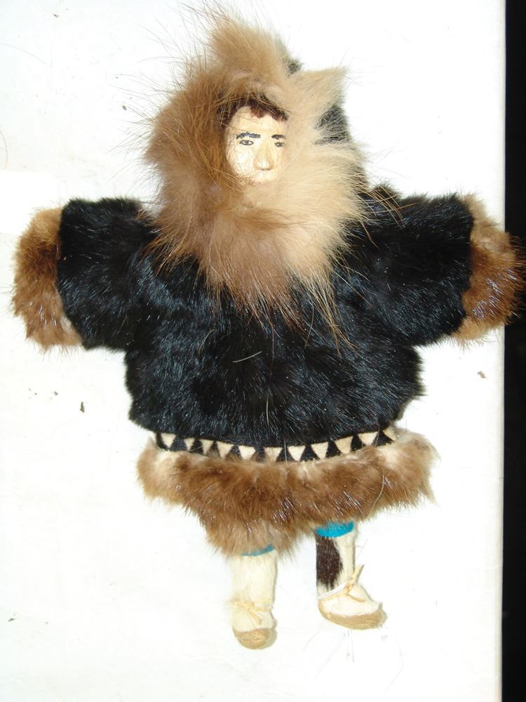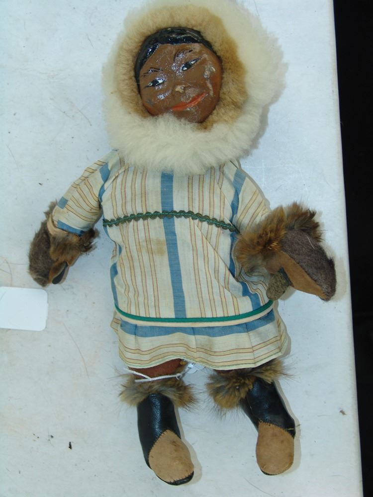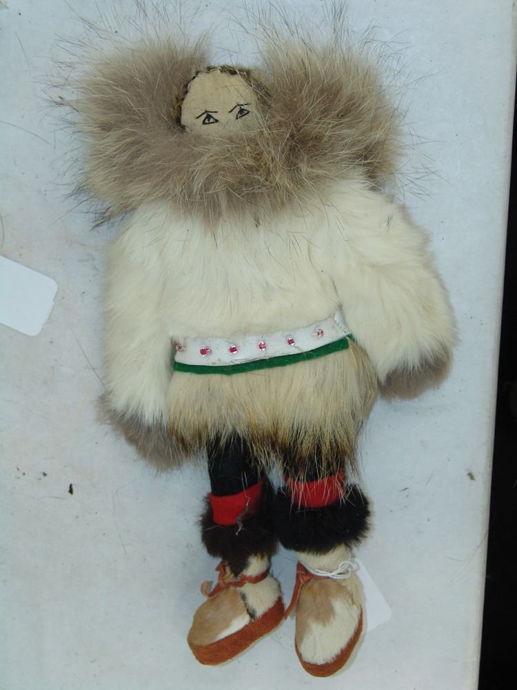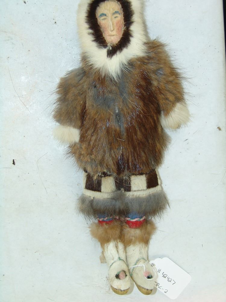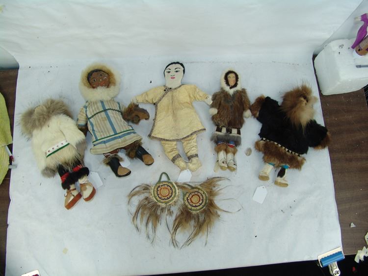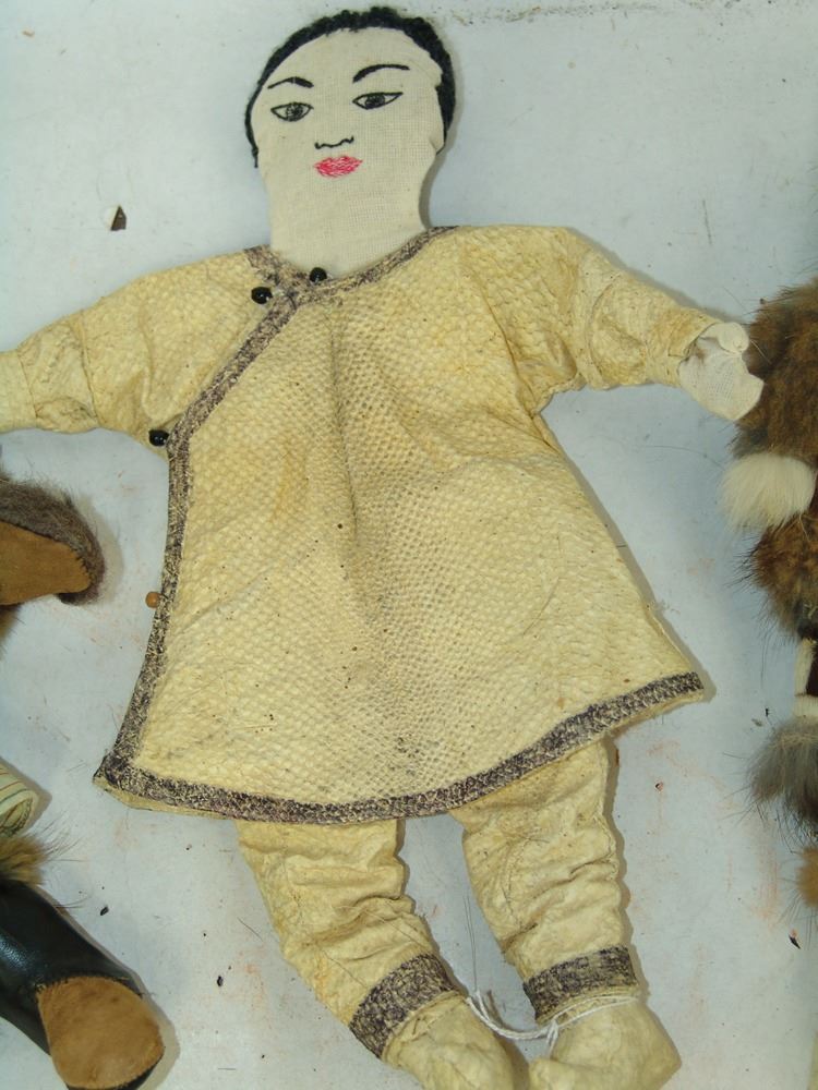 Including a very rare example made from salmon skin, three traditional versions made from seal skin, and fur, and one cloth doll with leather boots and clay face, plus a pair of traditional finger fans. Good condition.,Mid 1900s,Largest 13"