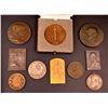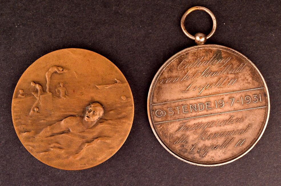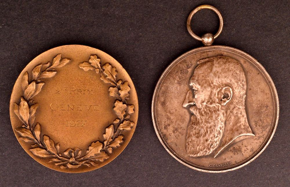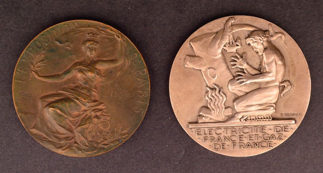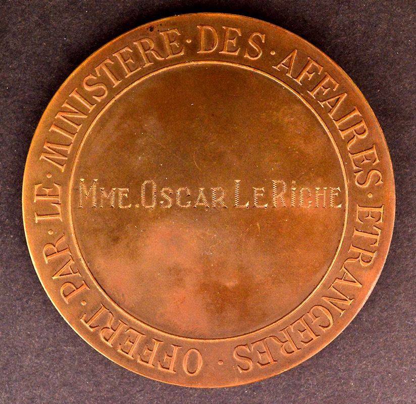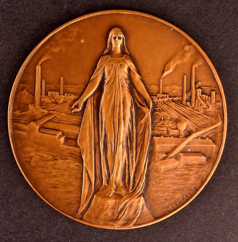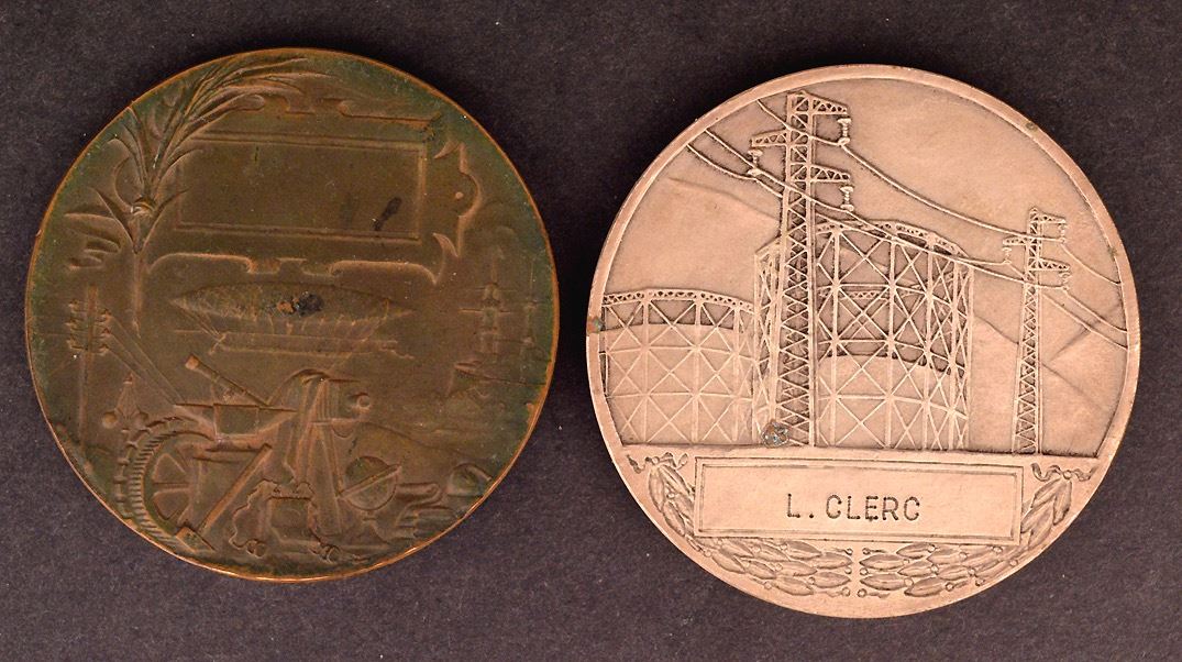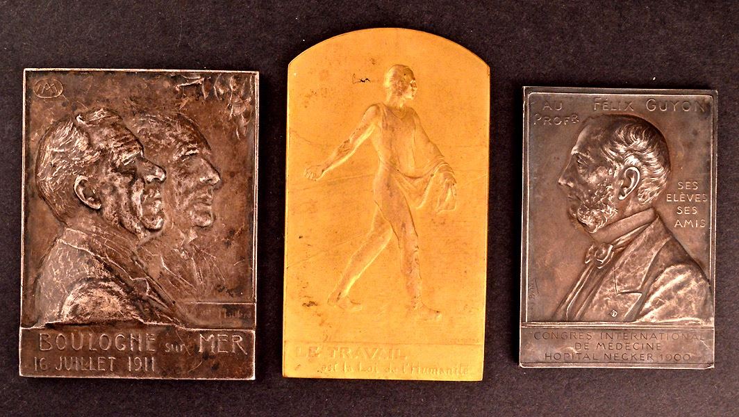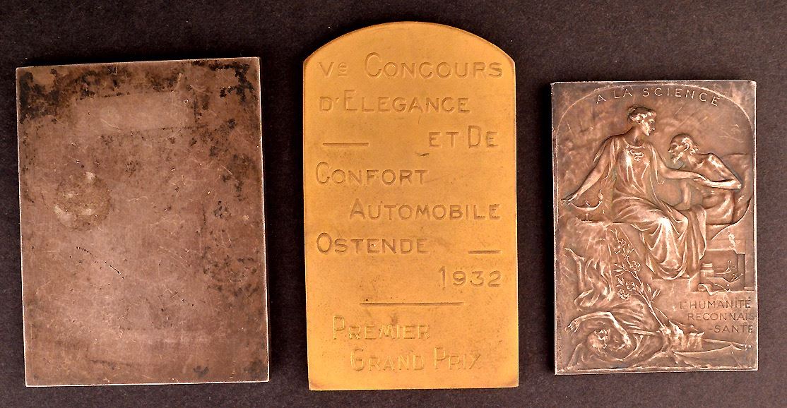 France, (1)- Exposition Paris, 1900, Ae, 53mm; Au Profr Felix Guyon, inscribed "Congres International de Medecine, Hopital Necker, 1900", Ar plate on Ae, rectangular, 63 x 44mm; (3)- Republique Francaise, Offert par le Ministre des Affaires Étrangères, inscribed "Mme. Oscar Le Riche"; Ae, 75mm, corrosion, vertigris; (4)- Boulogne sur Mer, 16 Juillet 1911, Ar plate on Ae, rectangular, 69 x 53mm; (5)- Emile Sargent, Hopital de la Charity, 1937, Ae, 80mm, light corrosion; (6)- Electricite de France et Gaz de France, presented to L. Clerc, Ar plate on Ae, 55mm, in fitted card case, with 27.5.1953 written on lid; Belgium, (7)- Leopold II, Oostend 19.7.1931, Ar plate on Ae, light corrosion; (8)- uniface medal, woman standing at centre, without inscription, in Jules Fonson, Bruxelles case, by Goodefroid Devrees, (1861-1941), Ae, 70mm, pin back removed; (9)- Le Travail est La Loi de L'Humanite, Ve Concours d'Élégance et de Confort Automobile, Ostende, 1932, Premier Grand Prix, Ae, rectangular, 78 x 45mm; Switzerland, (10)- Swimming medal, with only inscription," 2nd Prix, Geneve, 1917"; Ae, 50mm; Fine to EF, total 10 medals