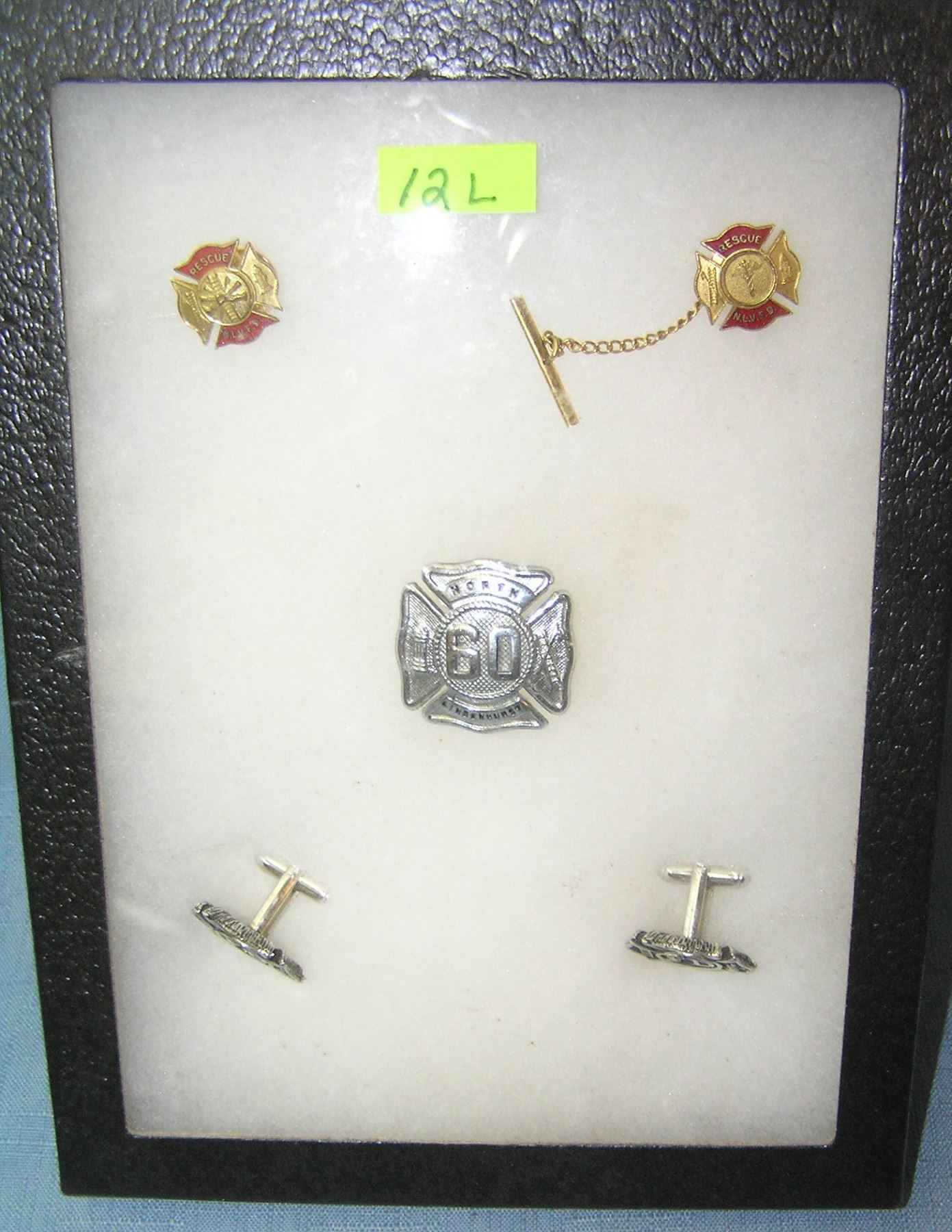 Group of Fire Dept collectibles includes badge, cuff links, tie pin and collar pin est. value $75.00-$80.00
