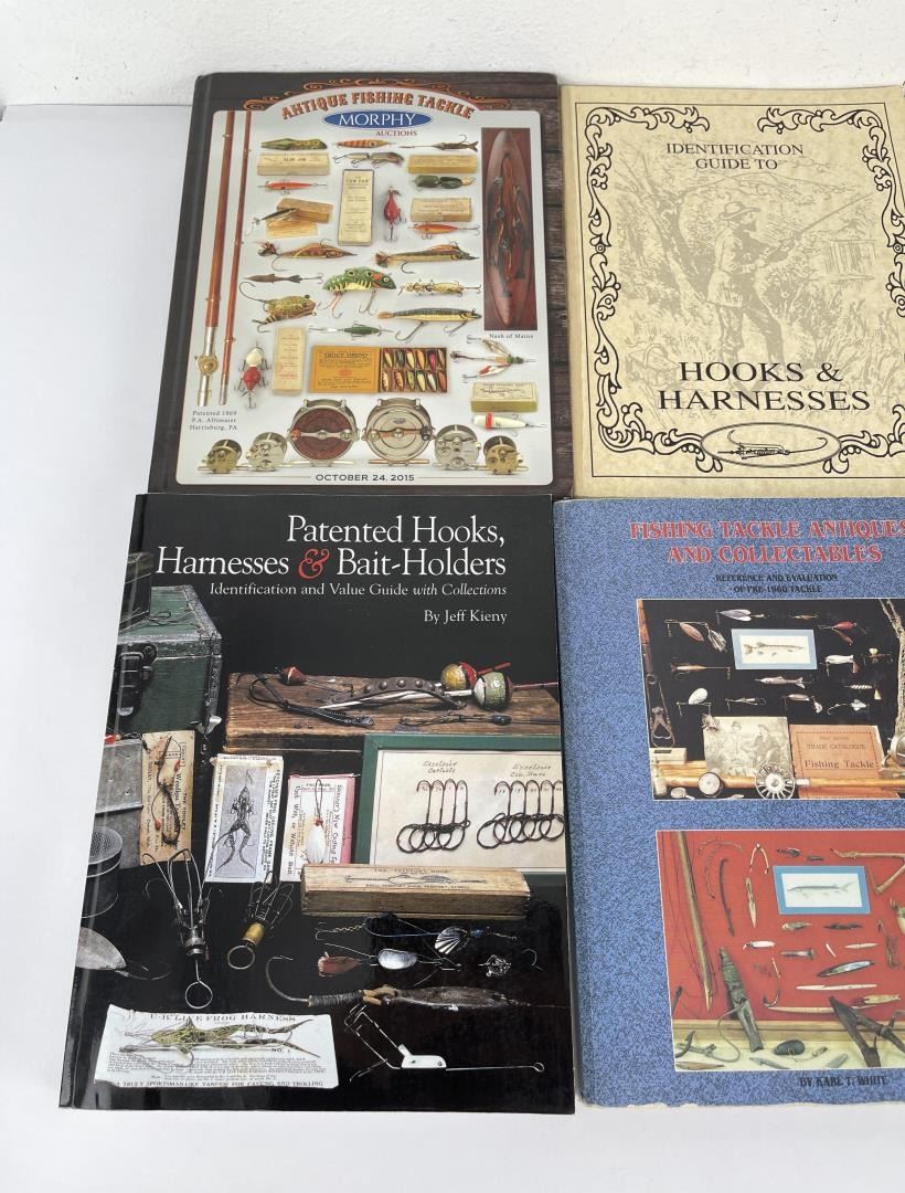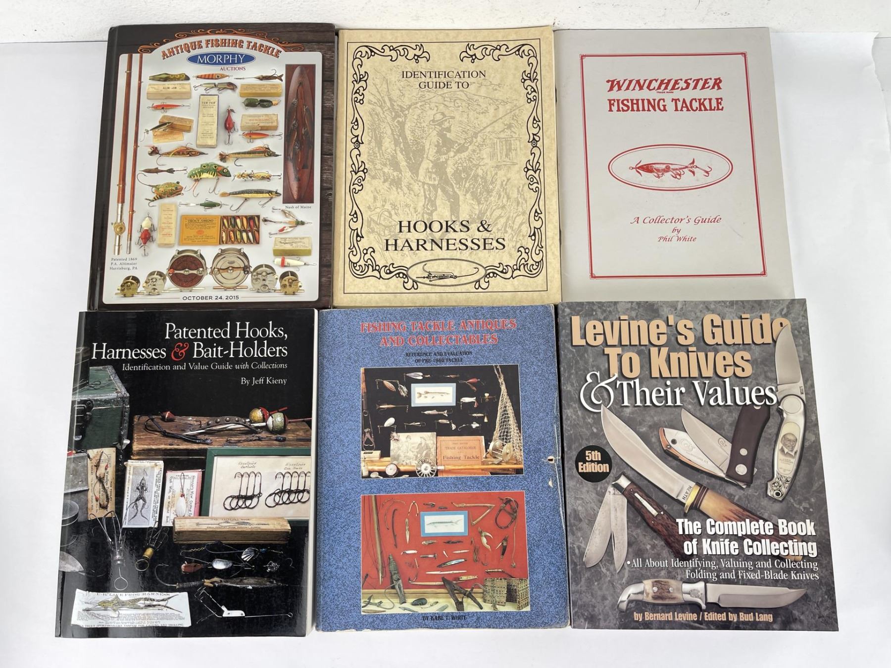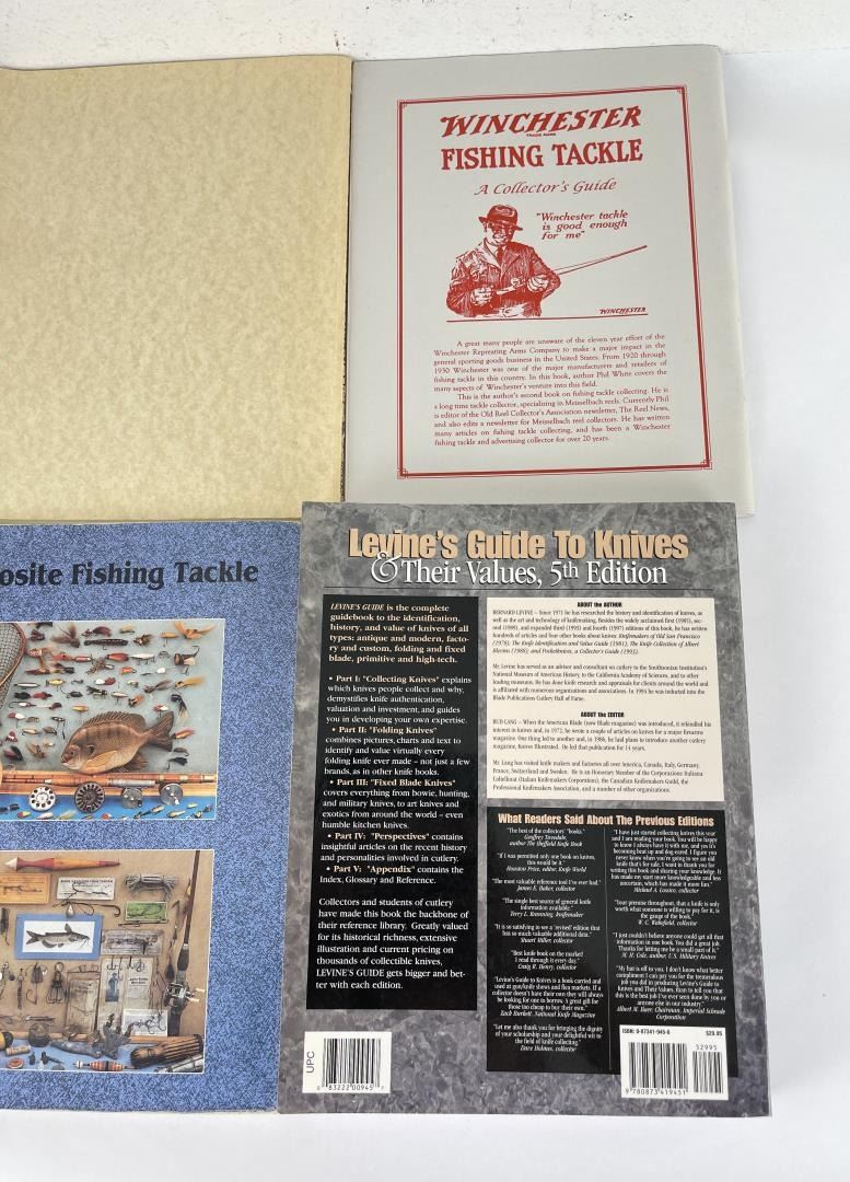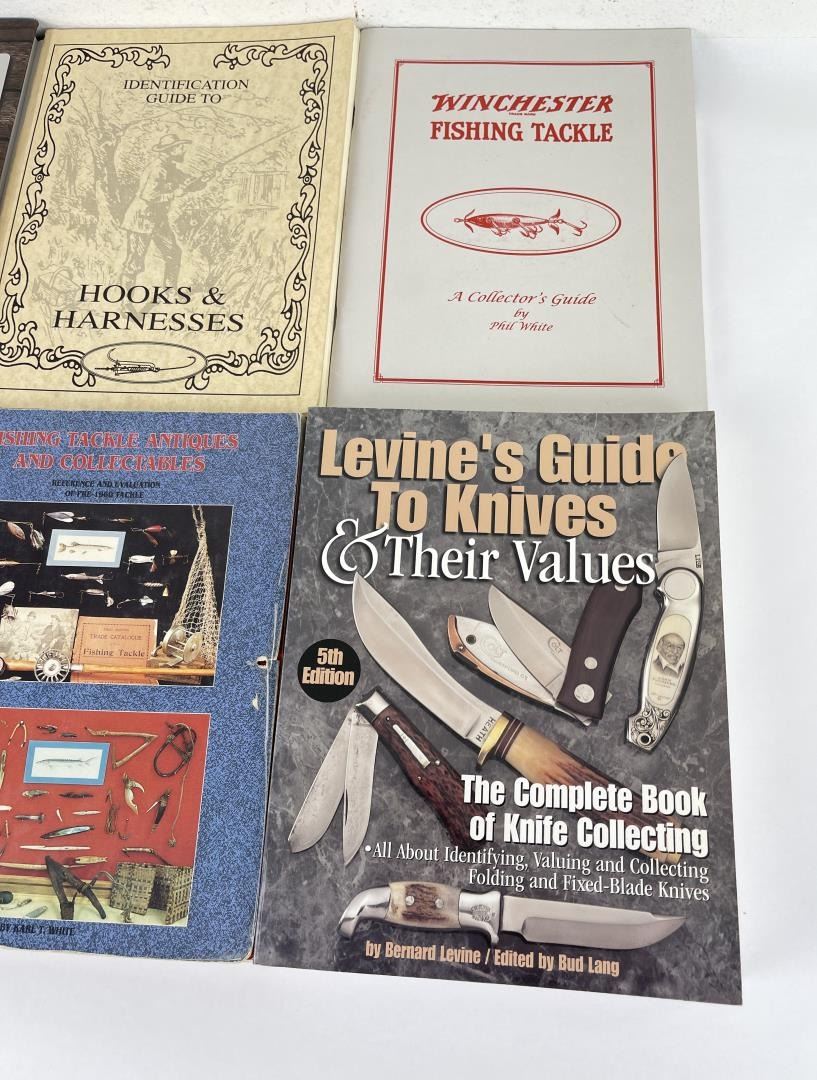 Fishing Tackle Antique and Collectables, Patented Hooks Harness Bait Holders, Winchester Fishing Tackle, Identification guide to Hooks & Harnesses, Morphy Fishing Tackle Auction Catalog, and a Levine's Guide to Knives.