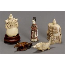 The first, a tea-stained toad form; the second, a fish form; the third, a polychrome decorated bottle in the form of a woman carrying a basket of flowers, the underside with Qianlong reign mark; the fourth and fifth carved with flowers and birds and signed Ta Ming.