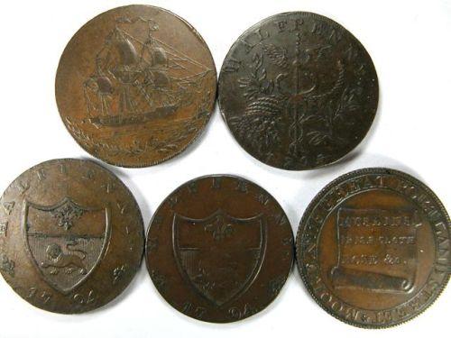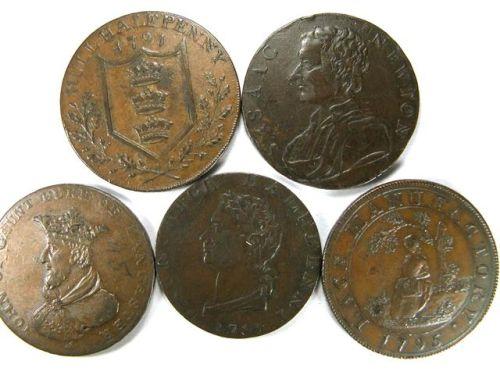 Condor Tokens: 1791 Hull Halfpenny, Uncirculated, 1793 Sir Isaac Newton Halfpenny, EF, 1794 John of Gaunt, Duke of Lancaster Halfpenny, Uncirculated, 1795 Brunswick Halfpenny with 1794 reverse, EF and 1795 Moore Lace Manufactory, Uncirculated. Total five tokens