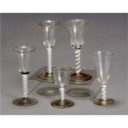 Group of Five English White Opaque, Twist Glasses, 18th Century, Each with variously decora...