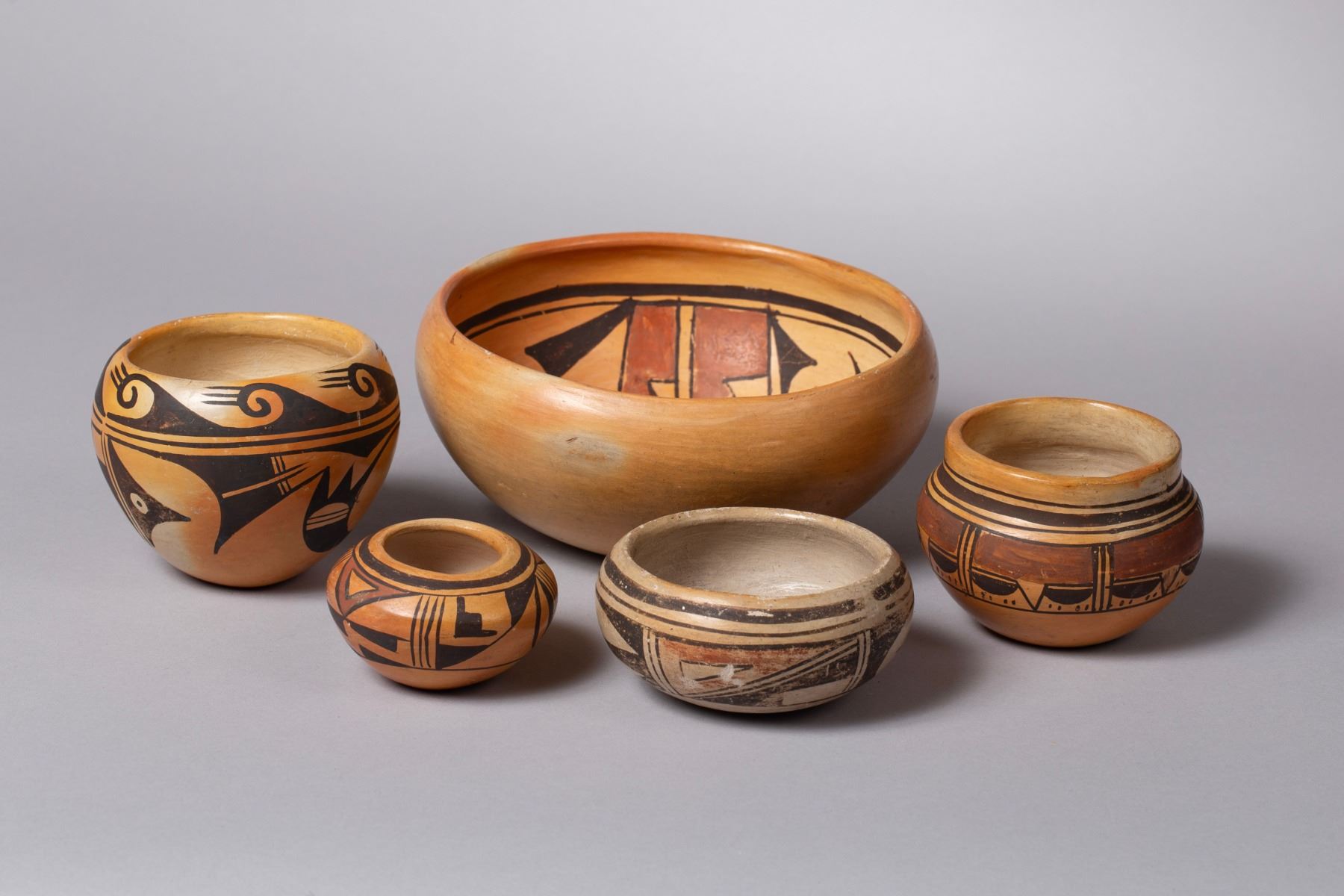 A set of five traditional handcrafted Hopi redware bowls, each featuring hand-painted polychrome designs over a redware clay body. The bowls vary in size, from a standard medium bowl to smaller, collectible miniatures.
