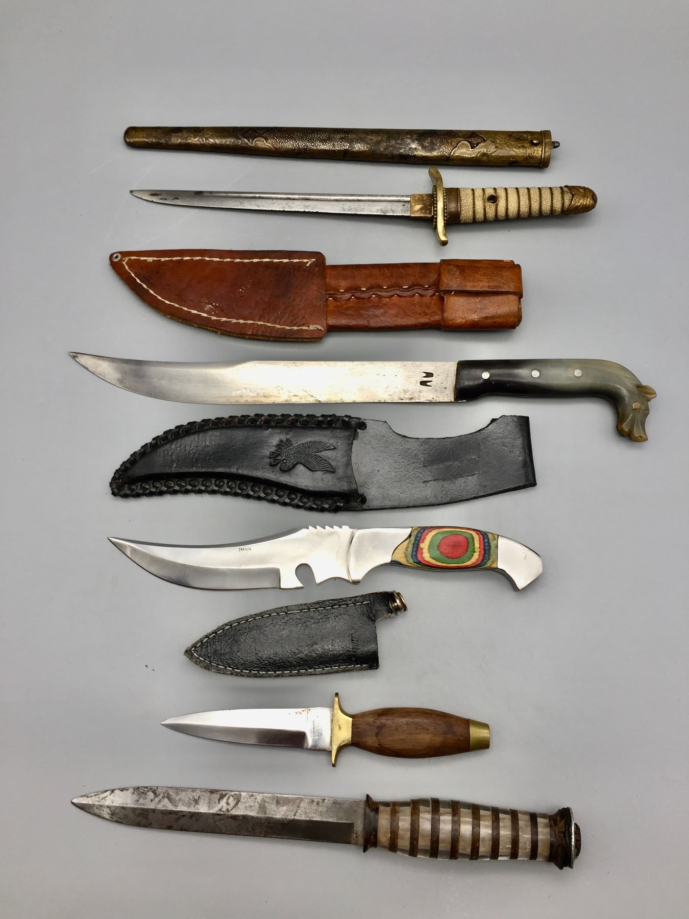 Description: Included for sale in this lot is a group of five knifes in varying sizes and styles. All the knives, with the exception of one, comes with a sheath of some kind. Maker: Various. Approx. Age: Vintage. Size: Varies. Condition: Fair for their ages, normal wear expected. Please look closely at the pictures - they are an important part of our description. Shipping: There will be a $8 handling / packaging fee for shipping this lot. The actual cost of postage will be added on top of that.