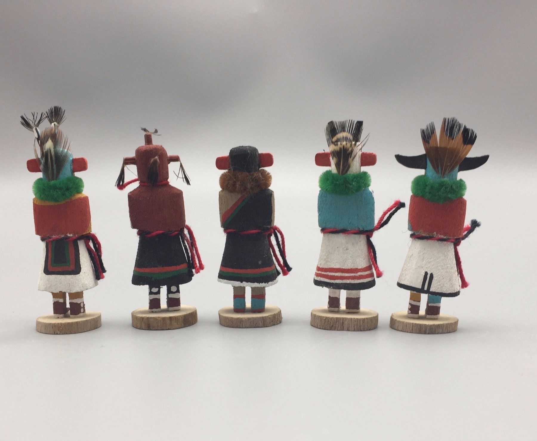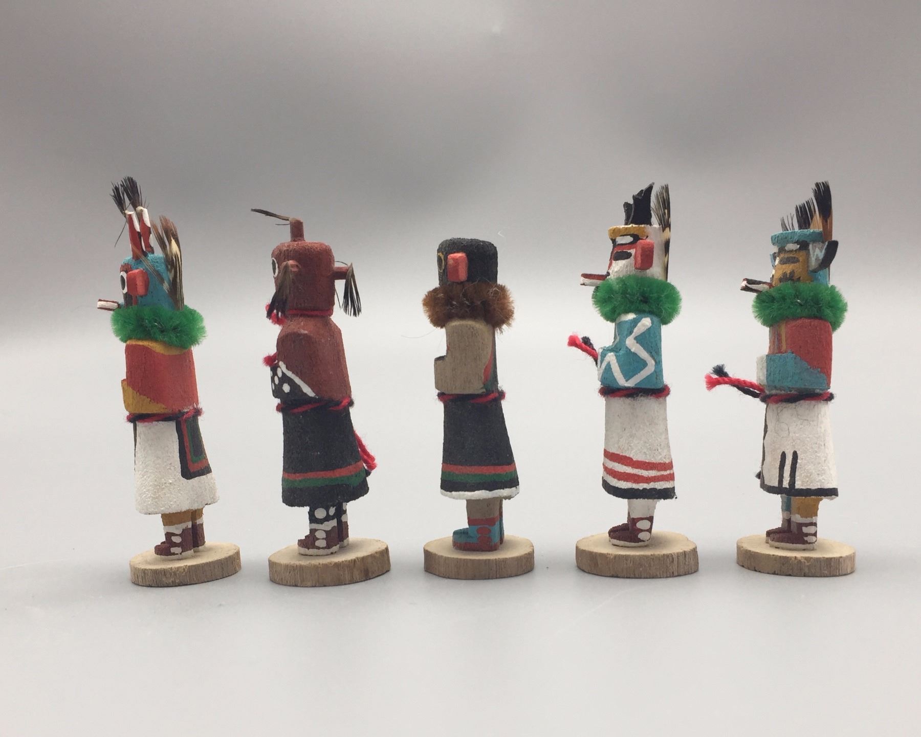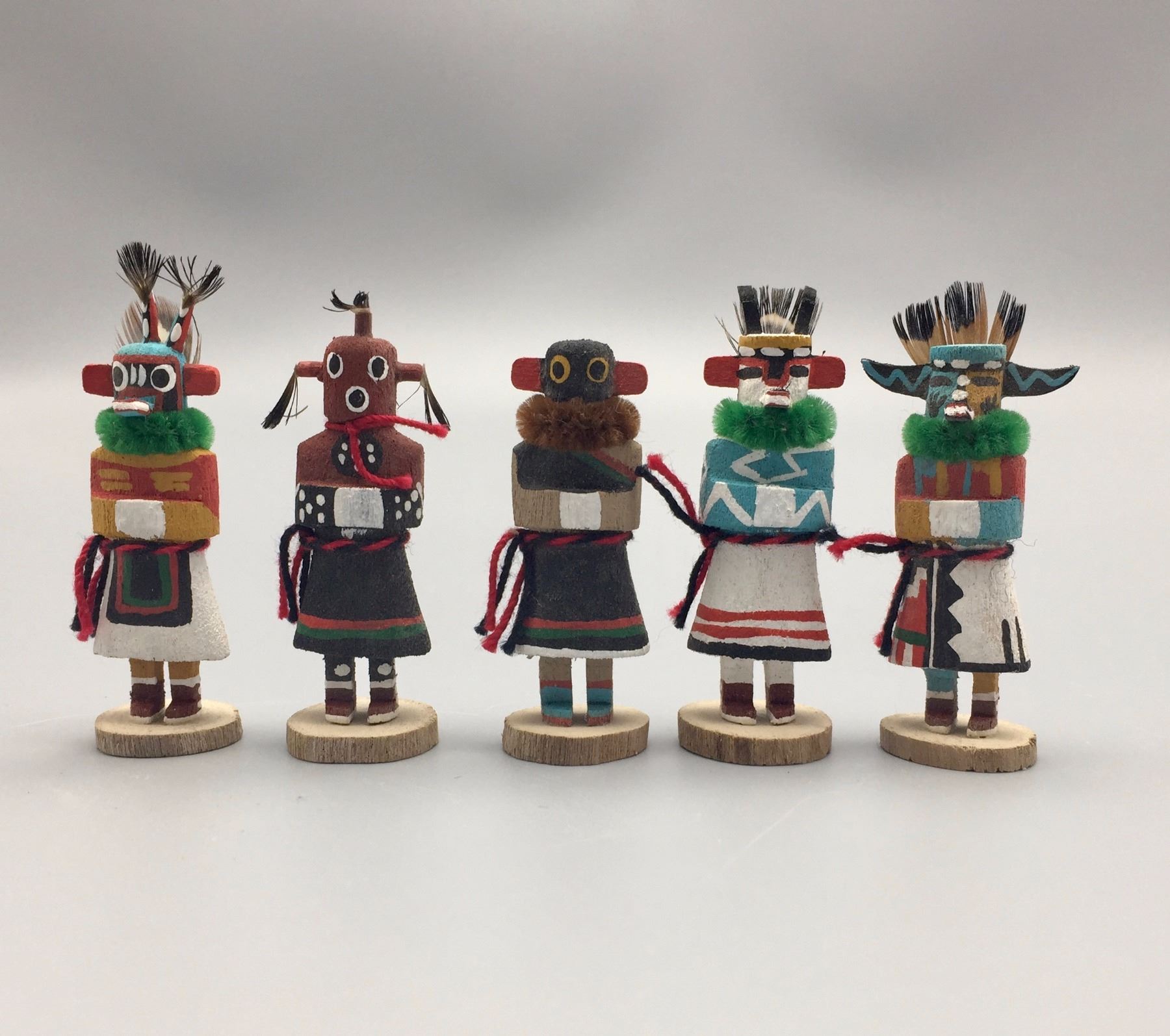 Maker: Signed LM (Loretta Multine, Hopi). Approx. Age: Fairly modern. Size: Approx. 2 1/2” h. Additional Info: Five miniature handpainted Hopi Kachinas; Three Horn, Mudhead, Orge Woman, Badger and Antelope. Condition: Good, normal wear expected. Please look closely at the pictures - they are an important part of our description. Shipping: There will be a $7 handling / packaging fee for shipping this lot. The actual cost of postage will be added on top of that.