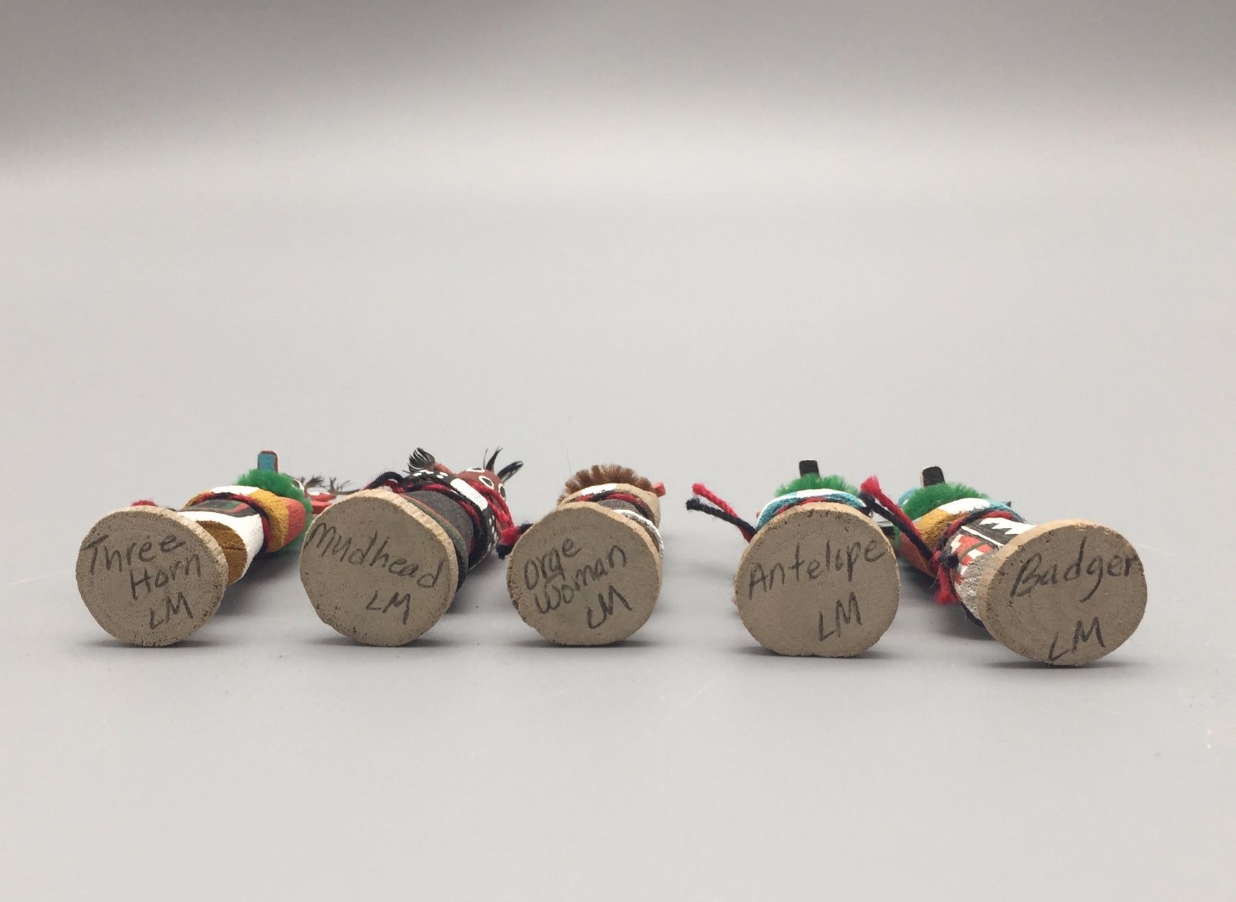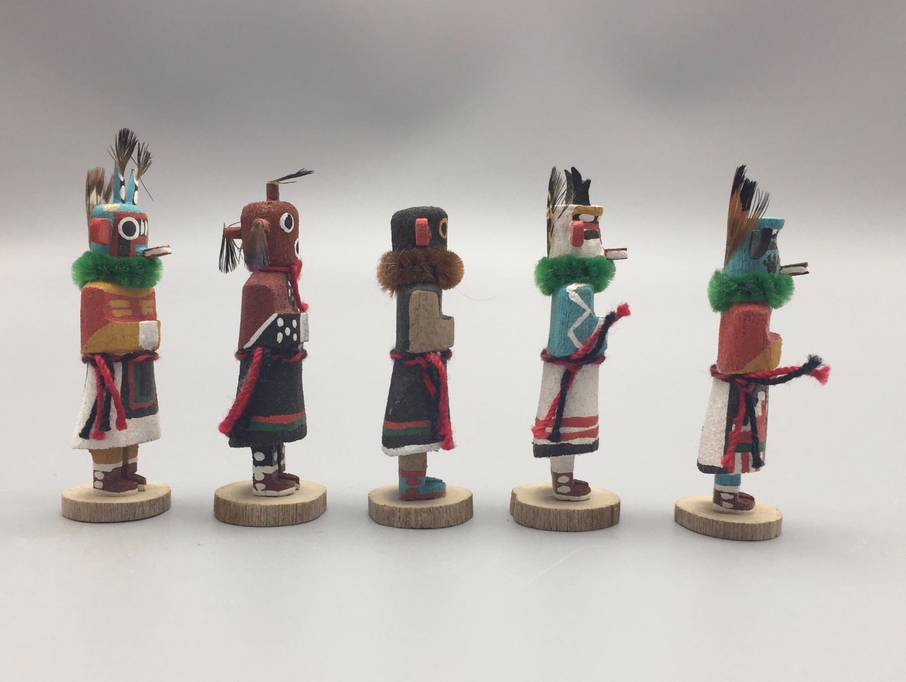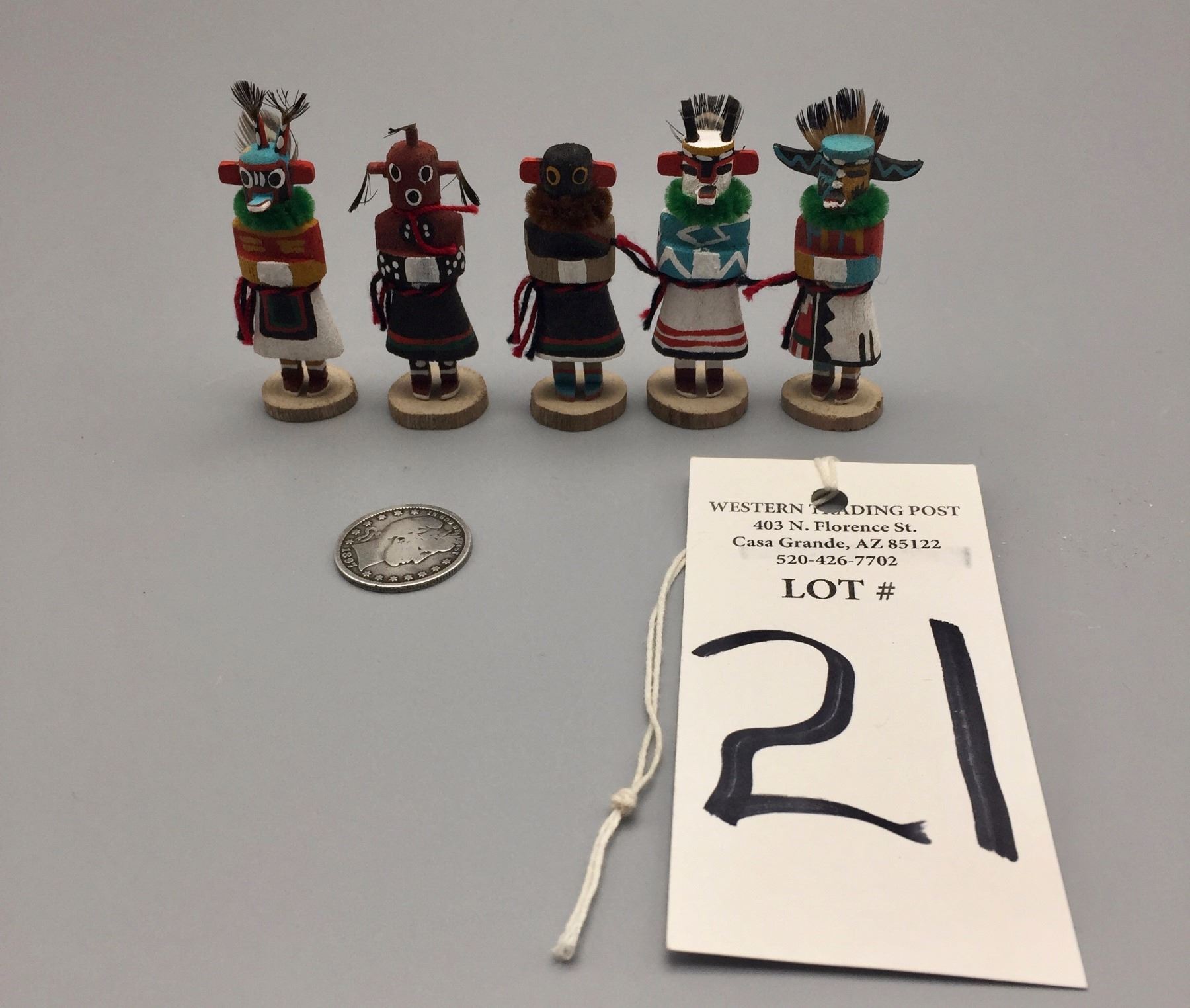 Maker: Signed LM (Loretta Multine, Hopi). Approx. Age: Fairly modern. Size: Approx. 2 1/2” h. Additional Info: Five miniature handpainted Hopi Kachinas; Three Horn, Mudhead, Orge Woman, Badger and Antelope. Condition: Good, normal wear expected. Please look closely at the pictures - they are an important part of our description. Shipping: There will be a $7 handling / packaging fee for shipping this lot. The actual cost of postage will be added on top of that.