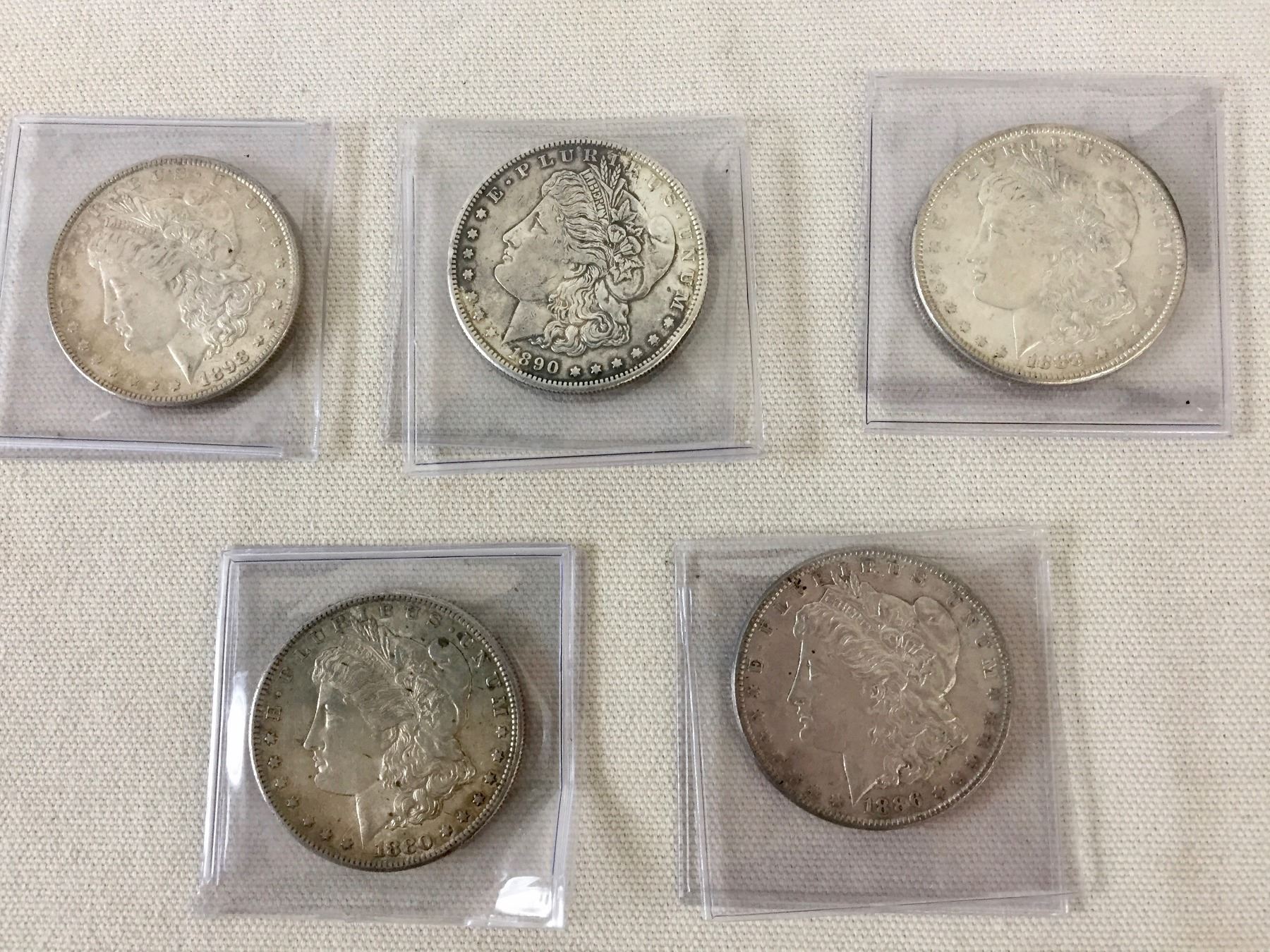 Description: For sale in this lot is a group of five Morgan Silver Dollars, ranging from 1880 to 1898. This is a nice set of Morgans!                                                                                                             Maker: US Treasury.                                                                                                                   Approx. Age: 1880-s, 1886, 1888, 1890-s and 1898.                                                                                                             Size: One dollar.                                                                                                                                                                                                                                  Condition: Good, lightly circulated.                                                                                                                  Please look closely at the pictures - they are an important part of our description.                                Shipping: There will be a $5 handling / packaging fee for shipping this lot. The actual cost of postage will be added on top of that.