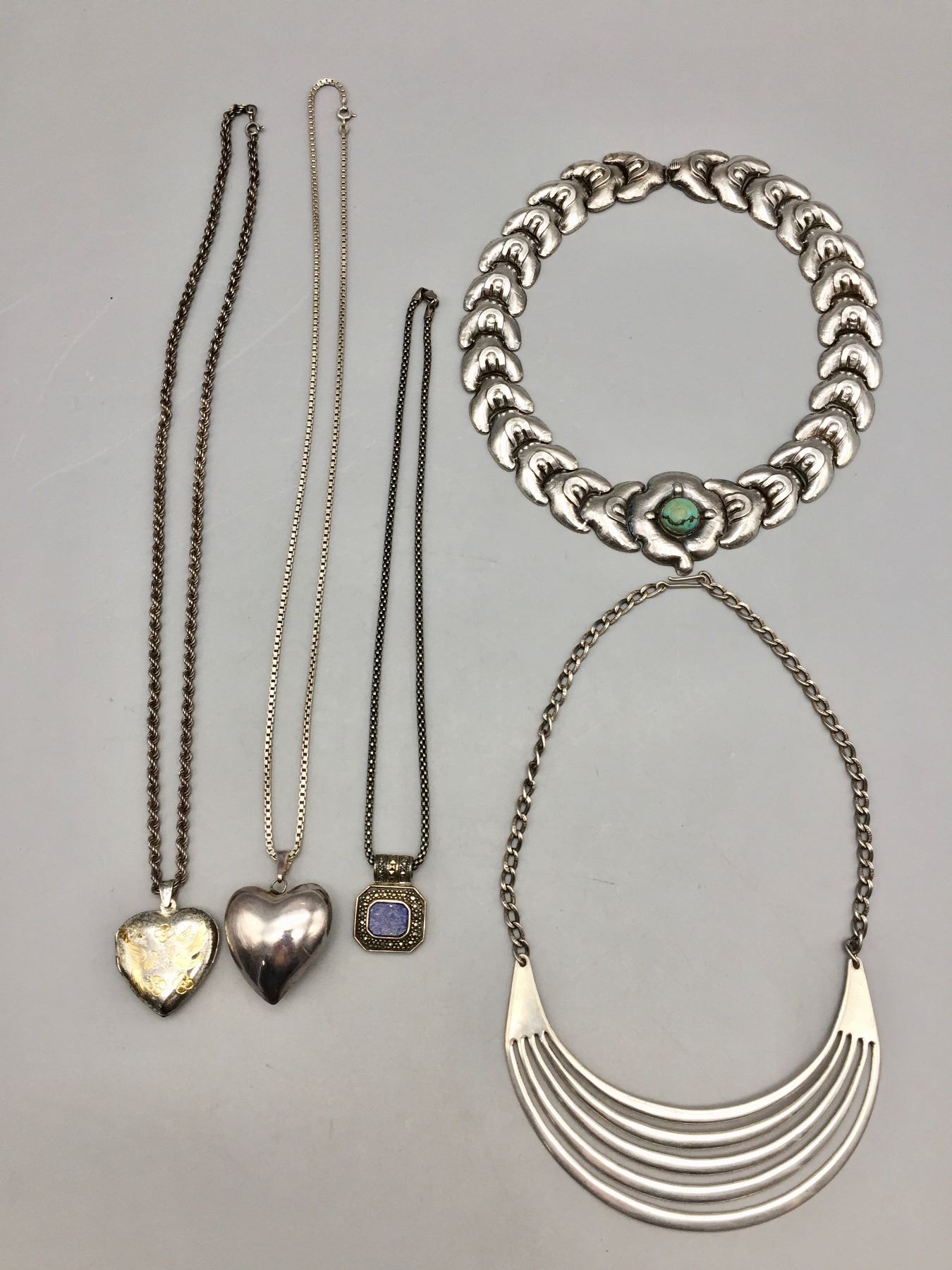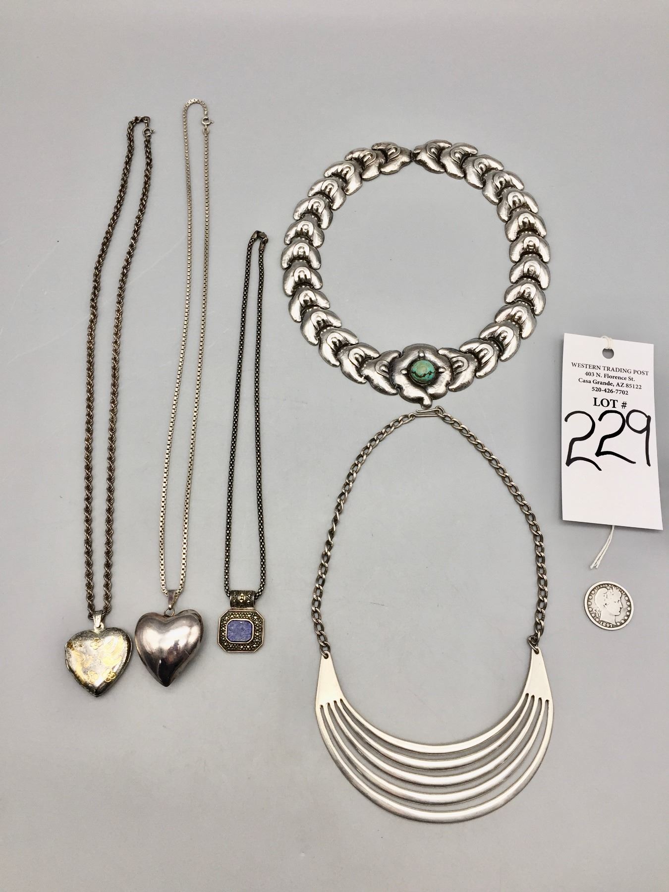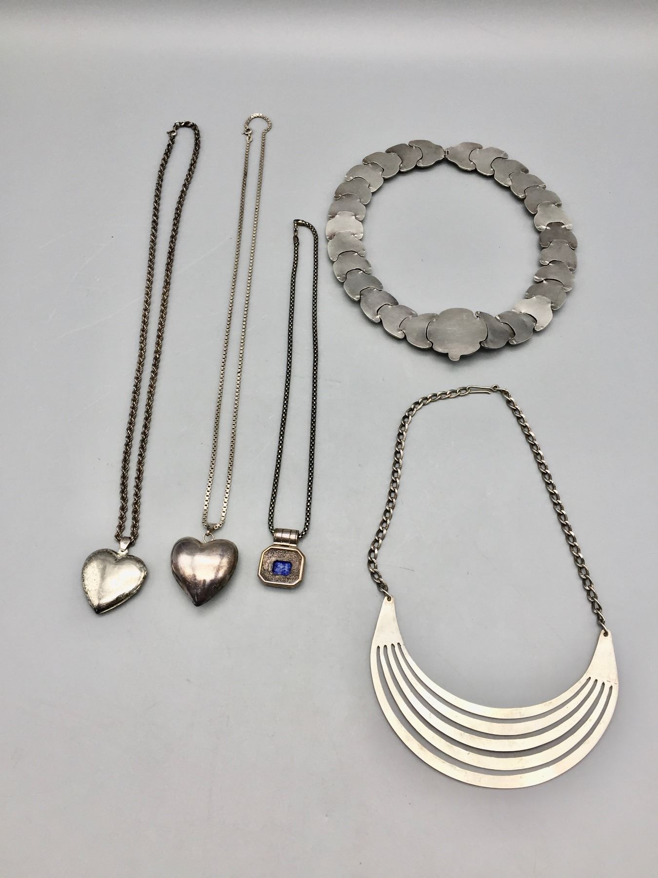 Description: Included in this bargain lot is a group of five necklaces in varying styles and sizes. Some are choker style and some are on chains with pendants.