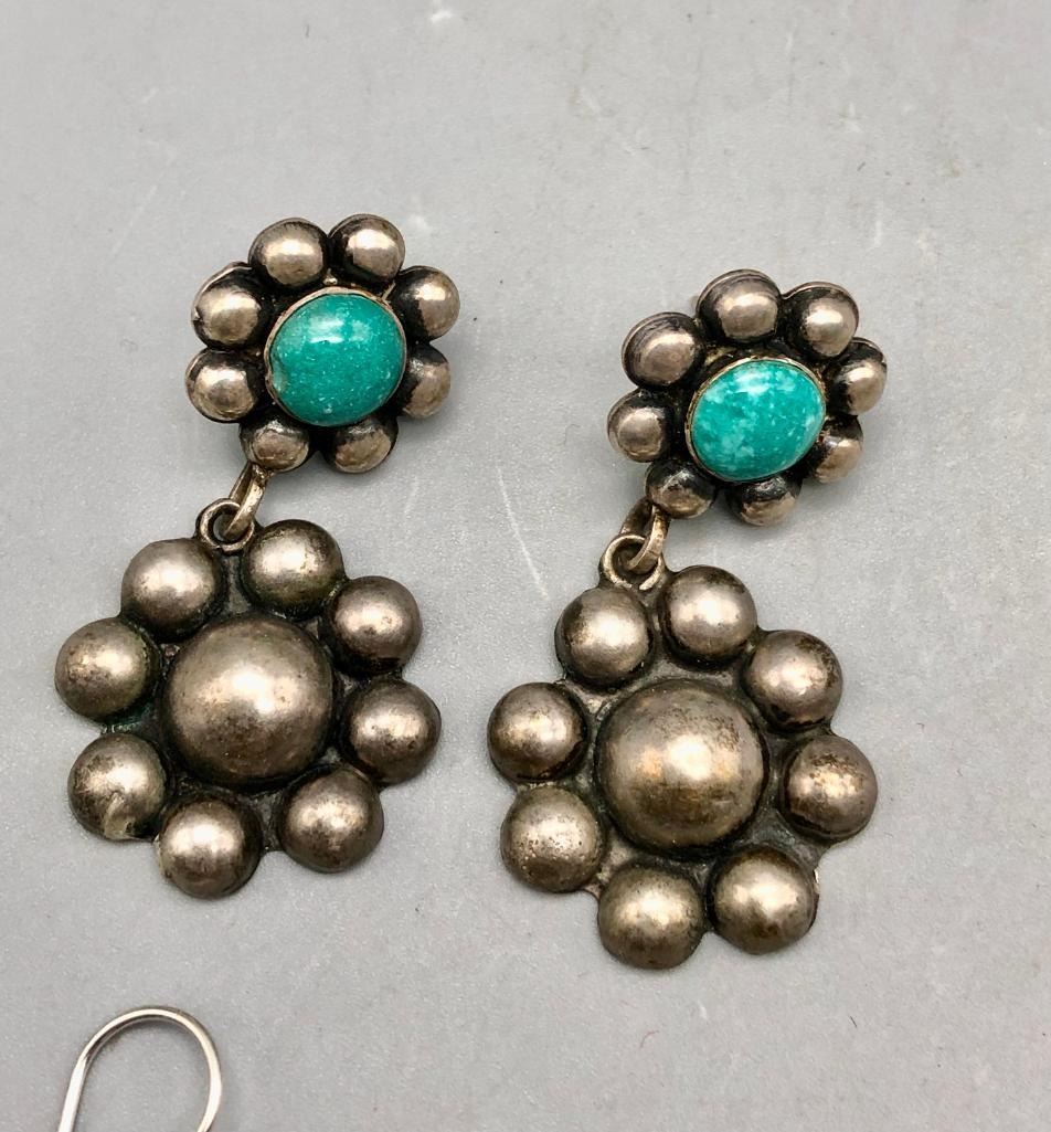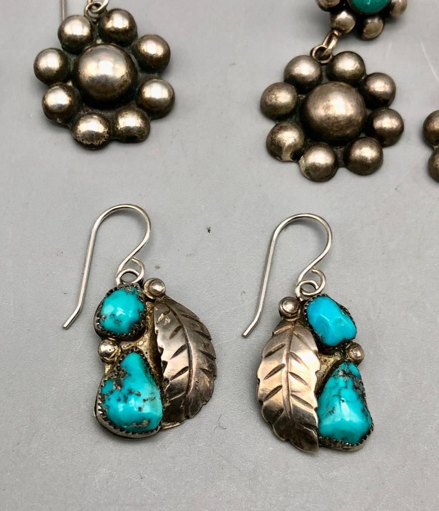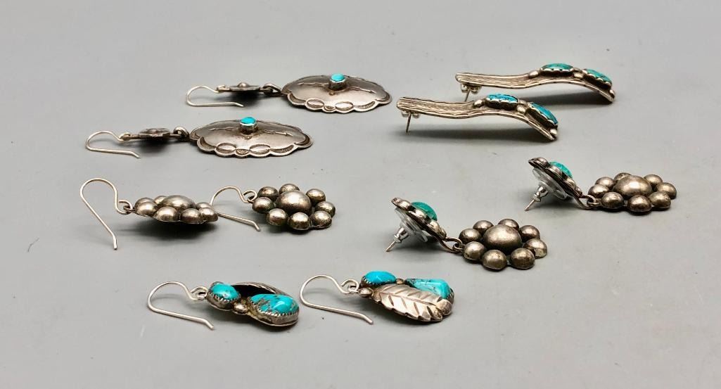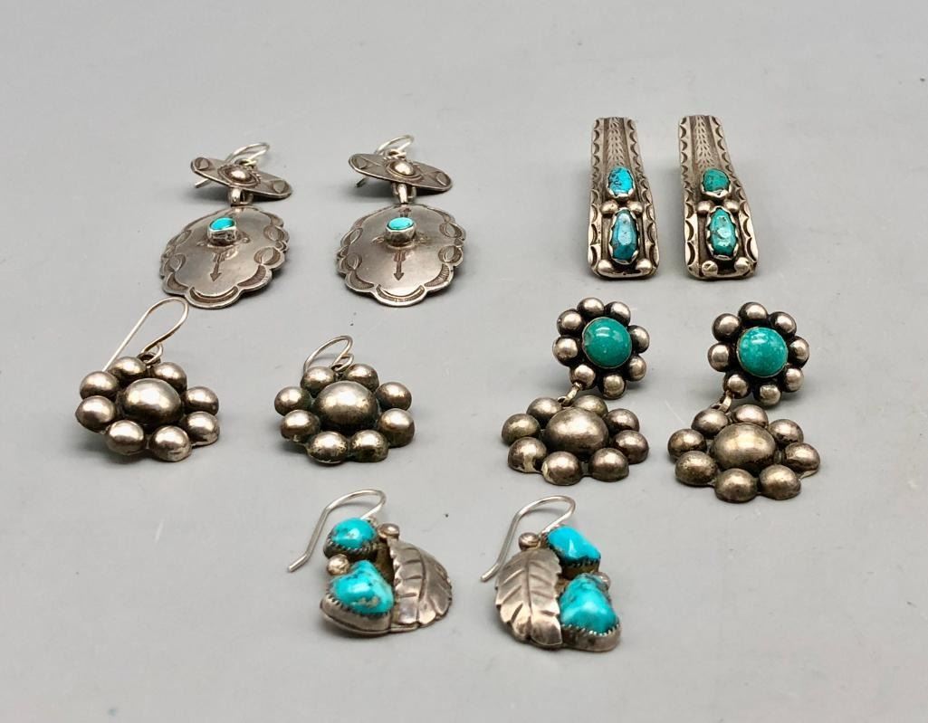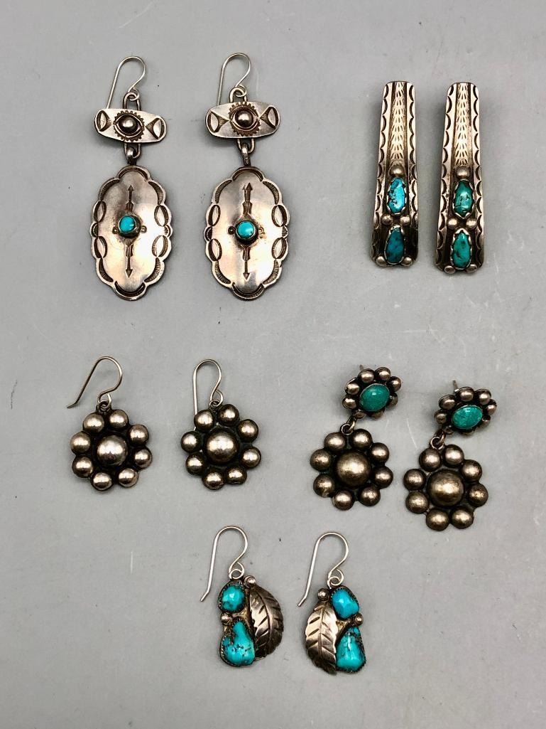 Presented for sale in this lot is a group of five pairs of vintage earrings. This is a fantastic group of earrings with a great combination of sterling silver and turquoise. All are various sizes, styles and made from sterling silver. MAKER: Various. APPROX AGE: Vintage. SIZE: Various. Combined weight is 60.6 grams. CONDITION: Good for their age, normal wear expected. Please look closely at the pictures as they are an important part of our description and are hereby incorporated into the description, specifically with regards to condition. SHIPPING: There will be a $5 handling / packaging fee for shipping this lot. The actual cost of postage will be added on top of that. BUY IT NOW: If you would like to buy this item now, without waiting for the auction day to bid on it, we do offer this option (which is available up to 48 hours before the actual auction starts). The “Buy it Now†price is the high estimate of this lot (plus applicable fees and the Buyer's premium is discounted to 10% when using the Buy it Now option). If you would like to exercise this option, you must contact us by email (or phone as long as you talk to someone live). Reference this lot number and your intention to "Buy it Now."