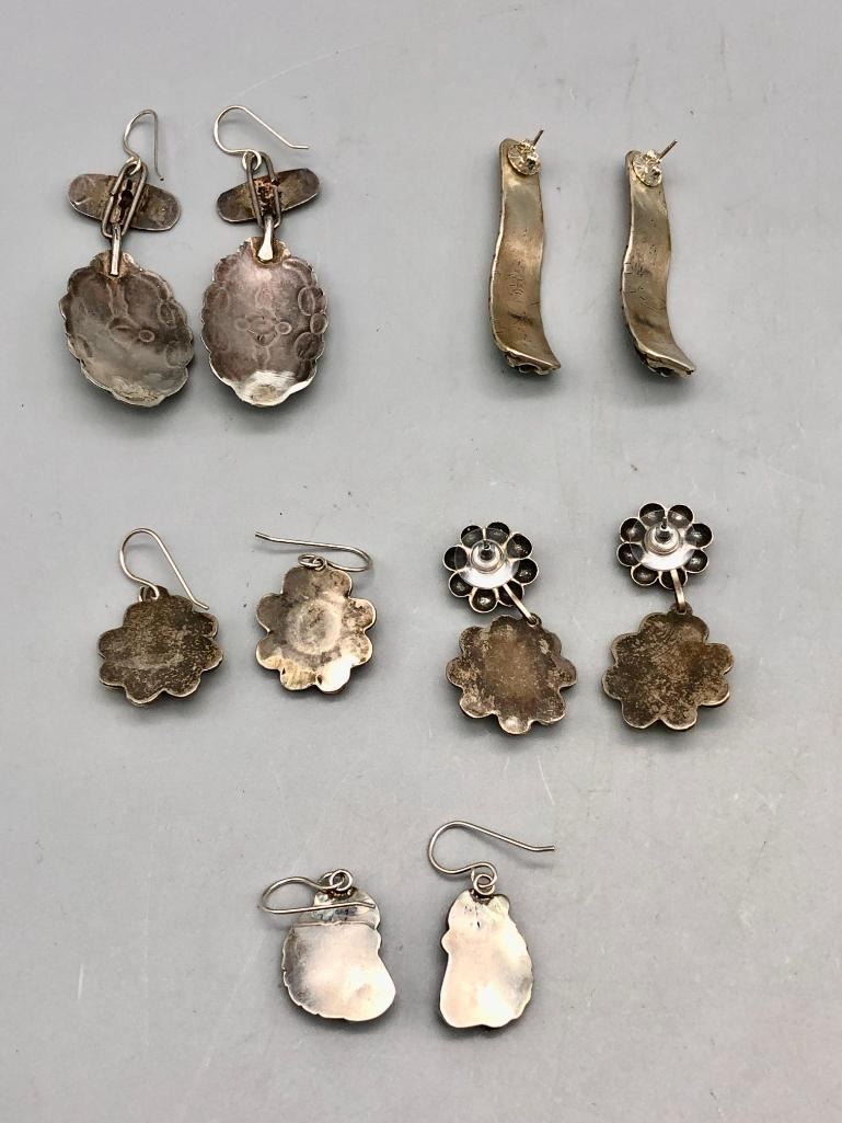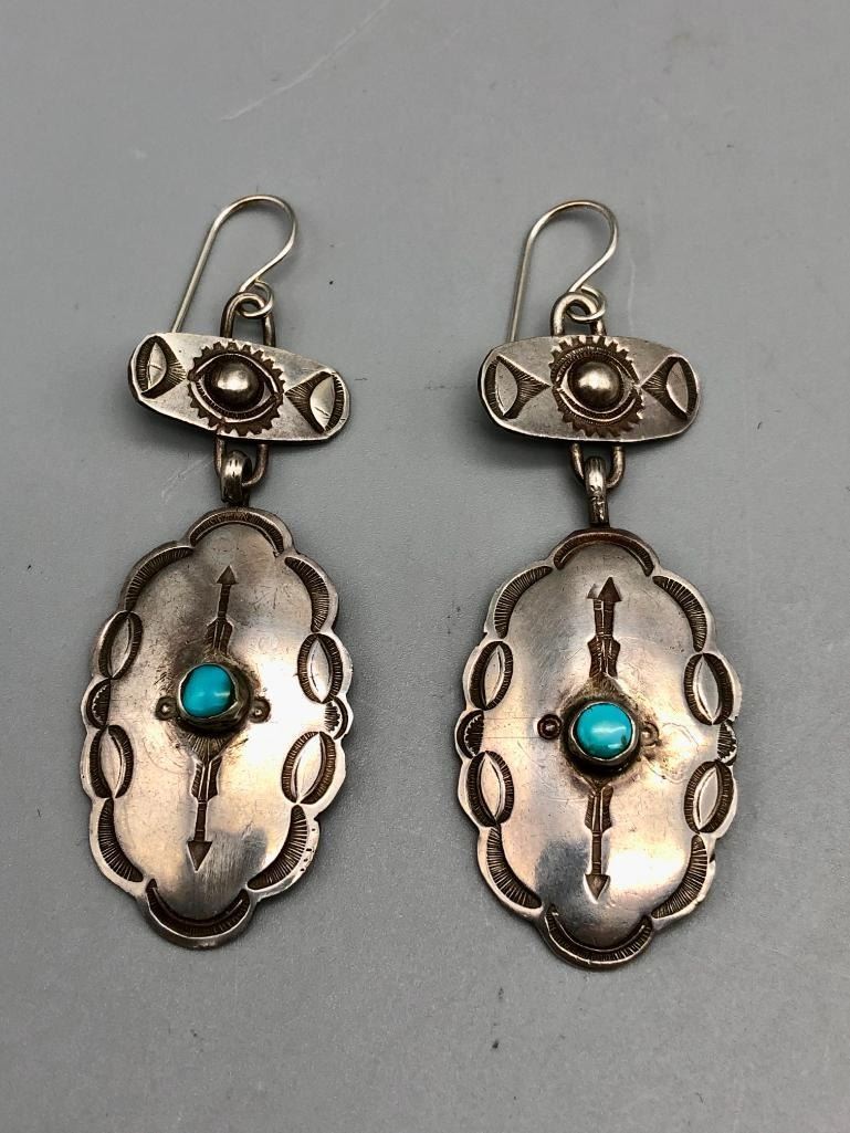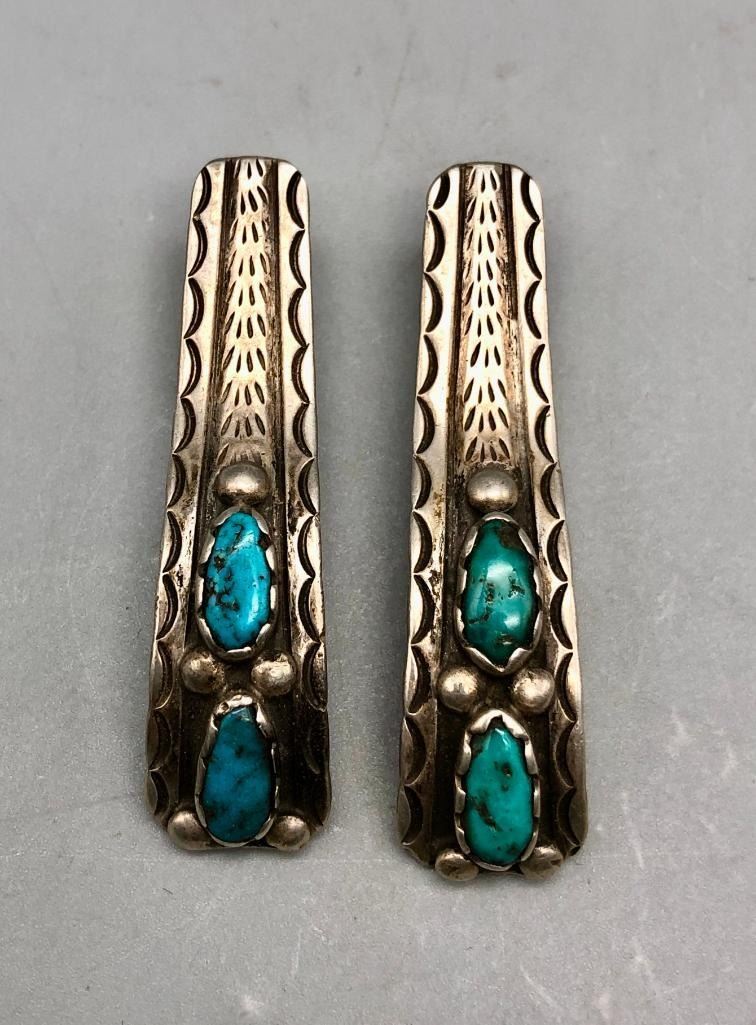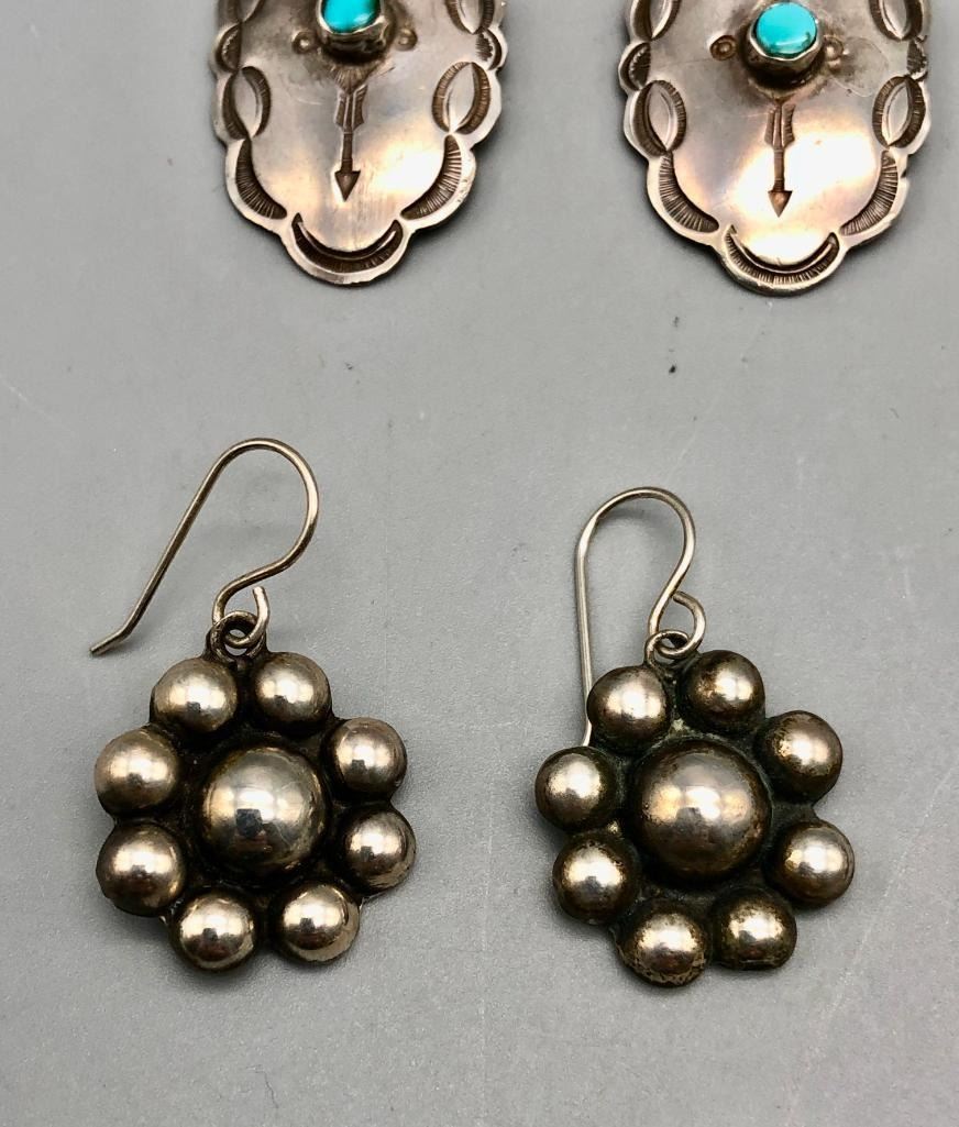 Presented for sale in this lot is a group of five pairs of vintage earrings. This is a fantastic group of earrings with a great combination of sterling silver and turquoise. All are various sizes, styles and made from sterling silver. MAKER: Various. APPROX AGE: Vintage. SIZE: Various. Combined weight is 60.6 grams. CONDITION: Good for their age, normal wear expected. Please look closely at the pictures as they are an important part of our description and are hereby incorporated into the description, specifically with regards to condition. SHIPPING: There will be a $5 handling / packaging fee for shipping this lot. The actual cost of postage will be added on top of that. BUY IT NOW: If you would like to buy this item now, without waiting for the auction day to bid on it, we do offer this option (which is available up to 48 hours before the actual auction starts). The “Buy it Now†price is the high estimate of this lot (plus applicable fees and the Buyer's premium is discounted to 10% when using the Buy it Now option). If you would like to exercise this option, you must contact us by email (or phone as long as you talk to someone live). Reference this lot number and your intention to "Buy it Now."