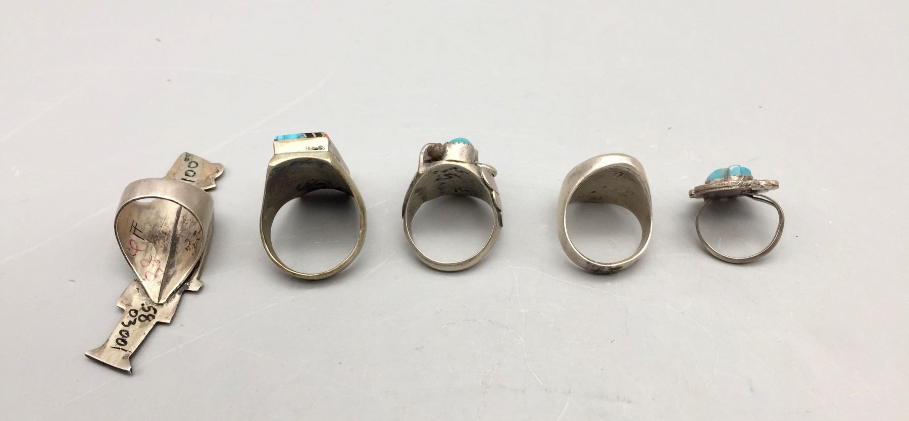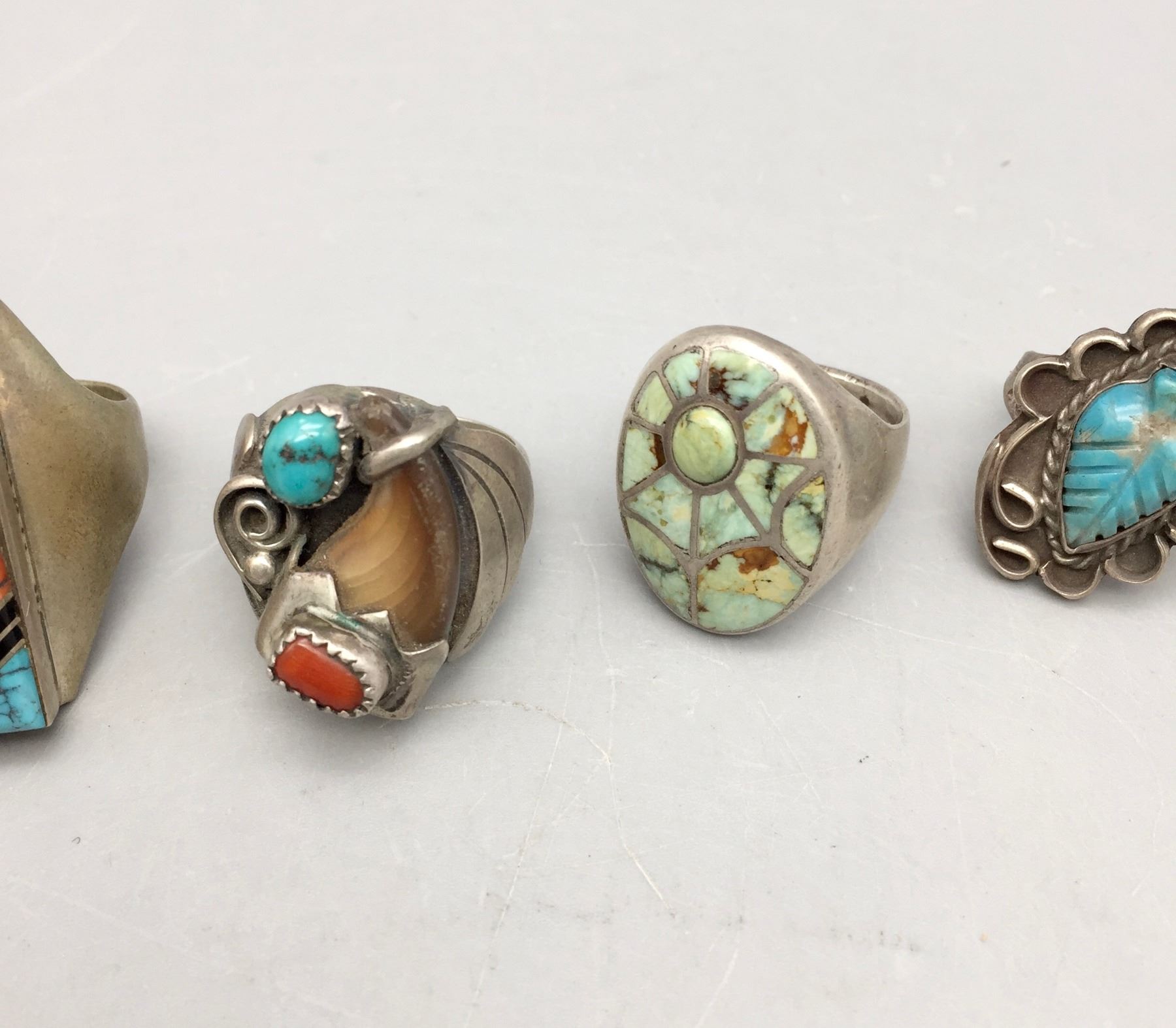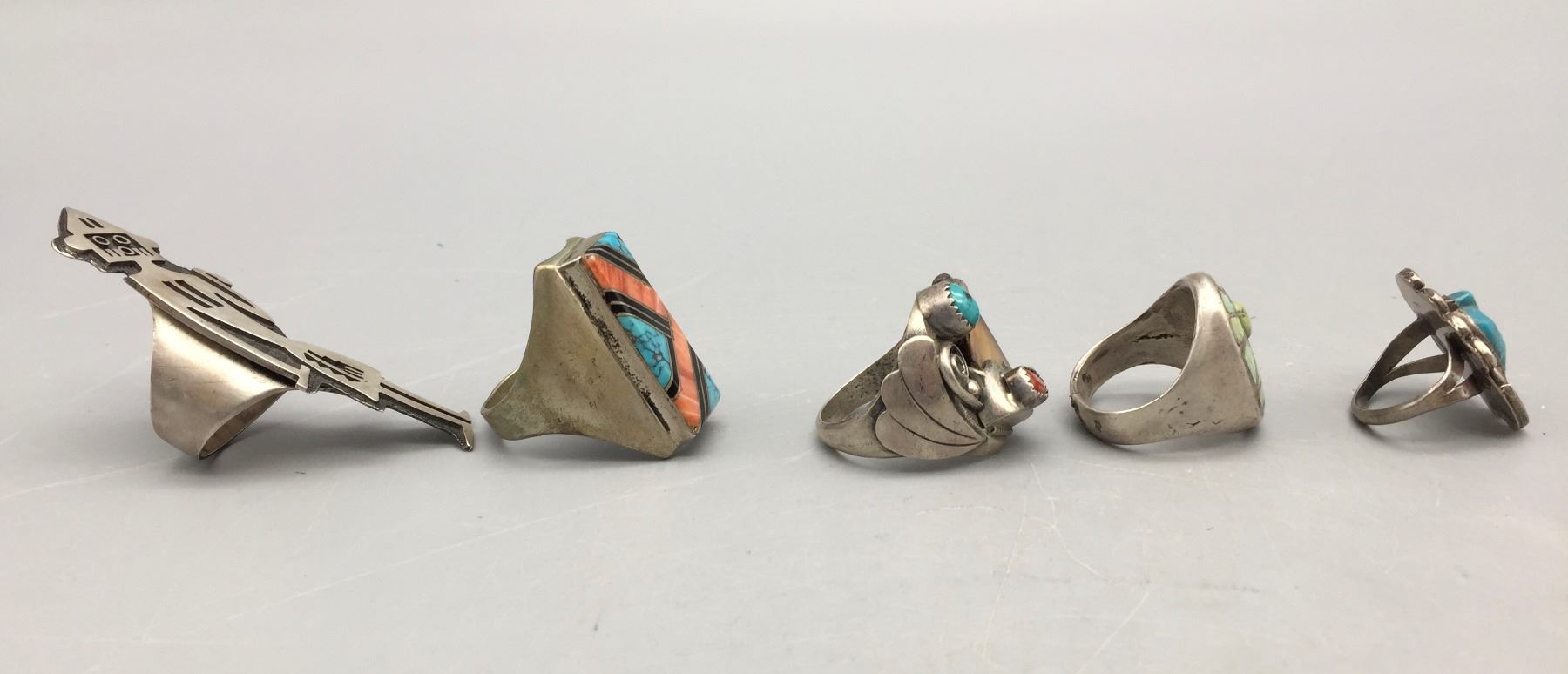 Description: Featured in this lot is a group of rings in a variety of styles and sizes. All are sterling silver.                                                                                                           Maker: Various.                                                                                                                 Approx. Age: Vintage.                                                                                                            Size: Various. 78.8 grams                                                                                                                                                                                                                                 Condition: Good for their age, normal wear expected.                                                                                                                Please look closely at the pictures - they are an important part of our description.                                Shipping: There will be a $5 handling / packaging fee for shipping this lot. The actual cost of postage will be added on top of that.