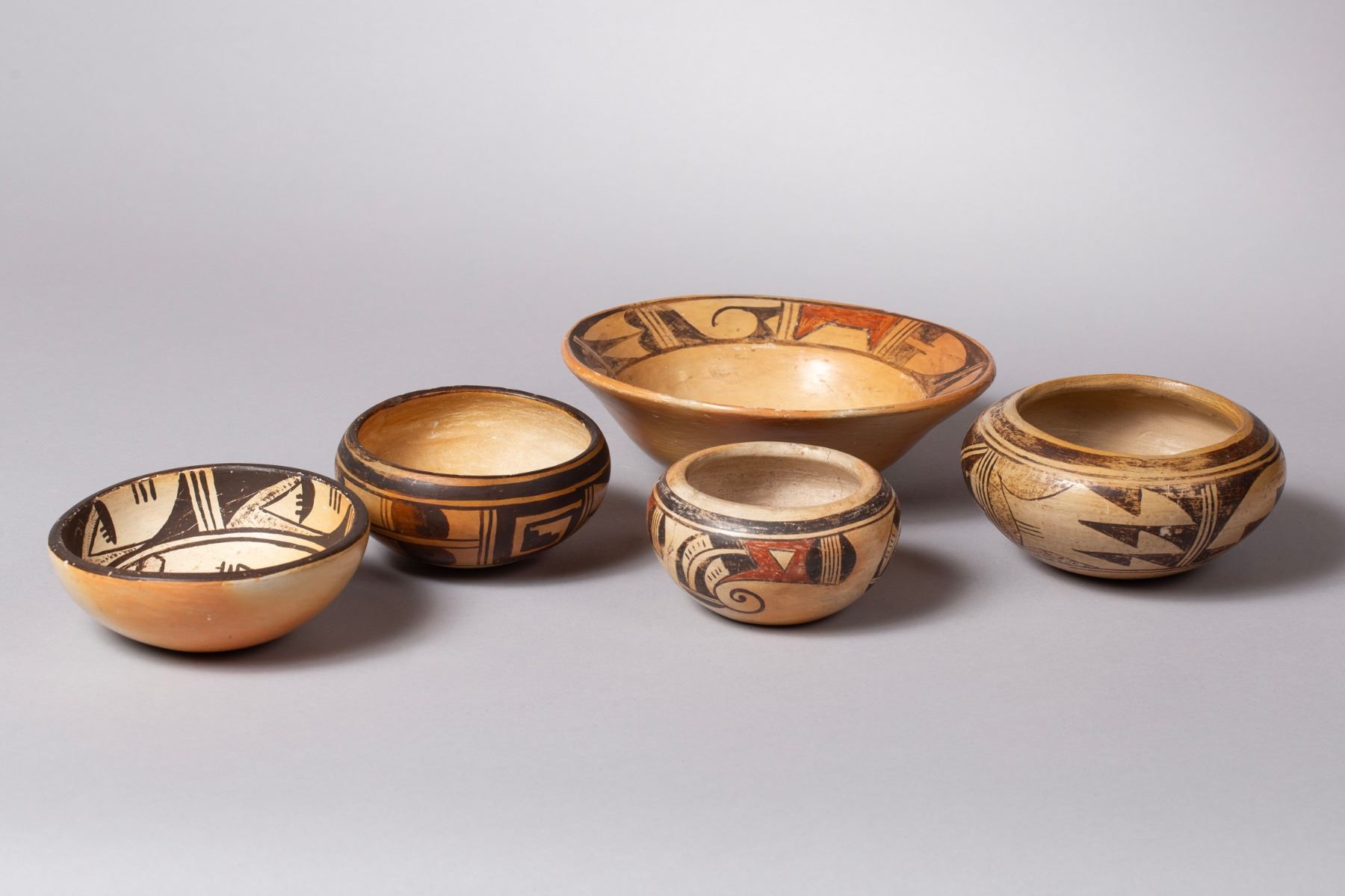 Group of Five Vintage Hopi Redware Polychrome Bowls, with Artist-Signed piece by Josephine Kachinman