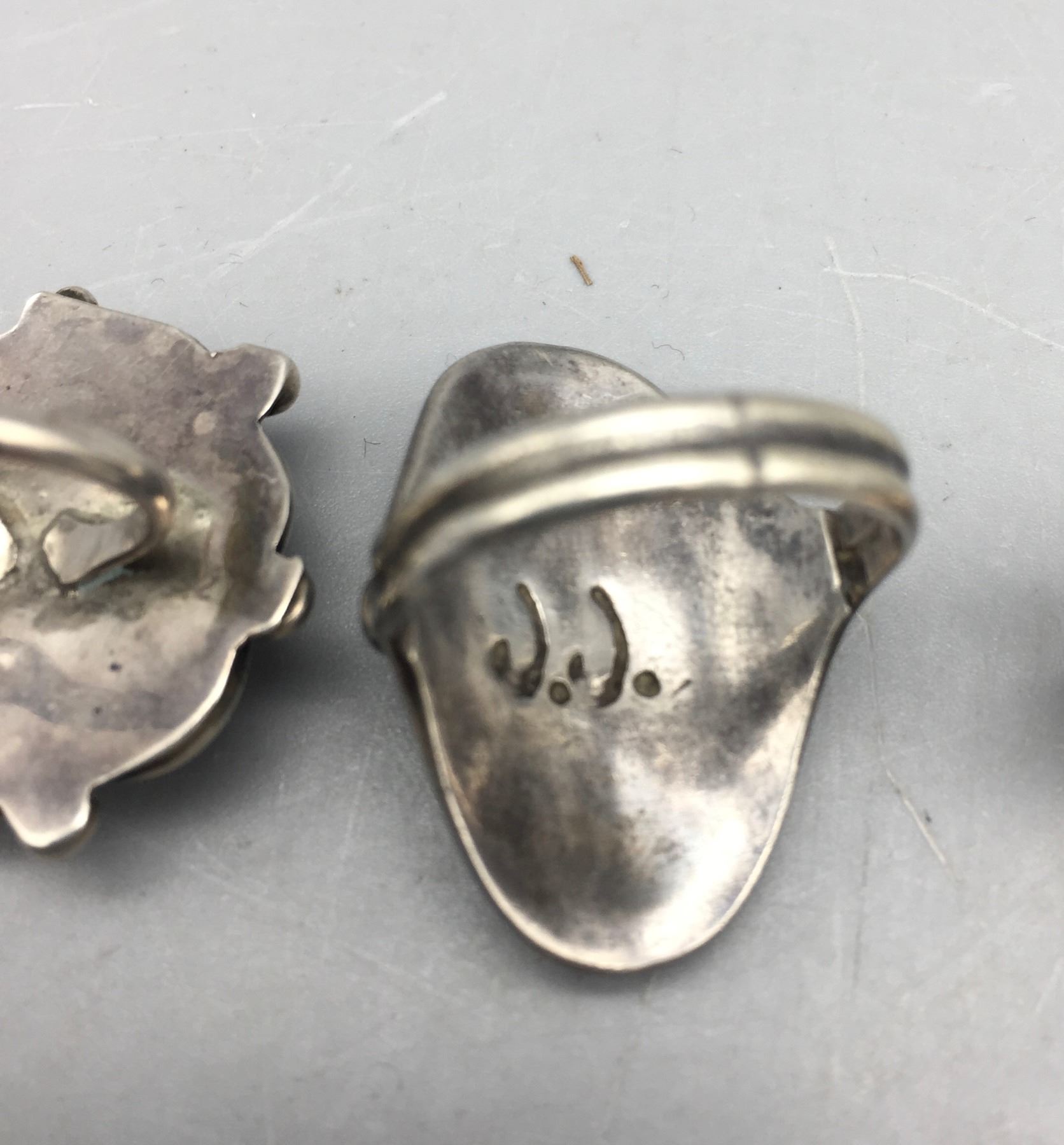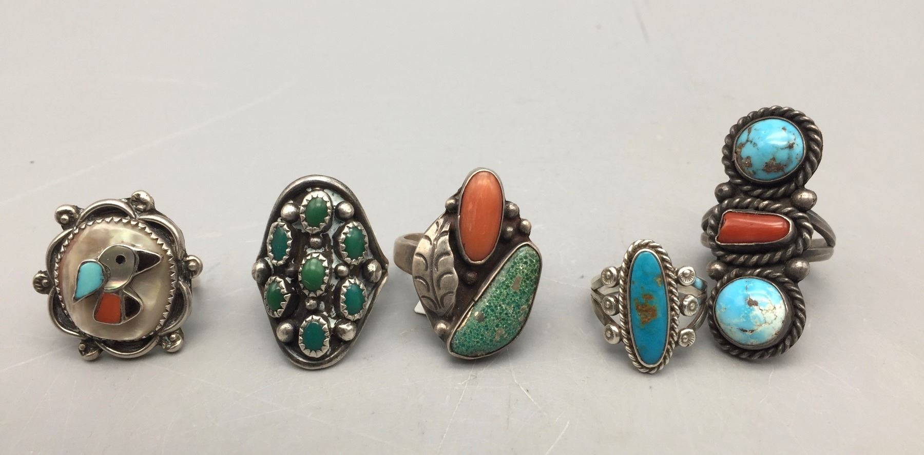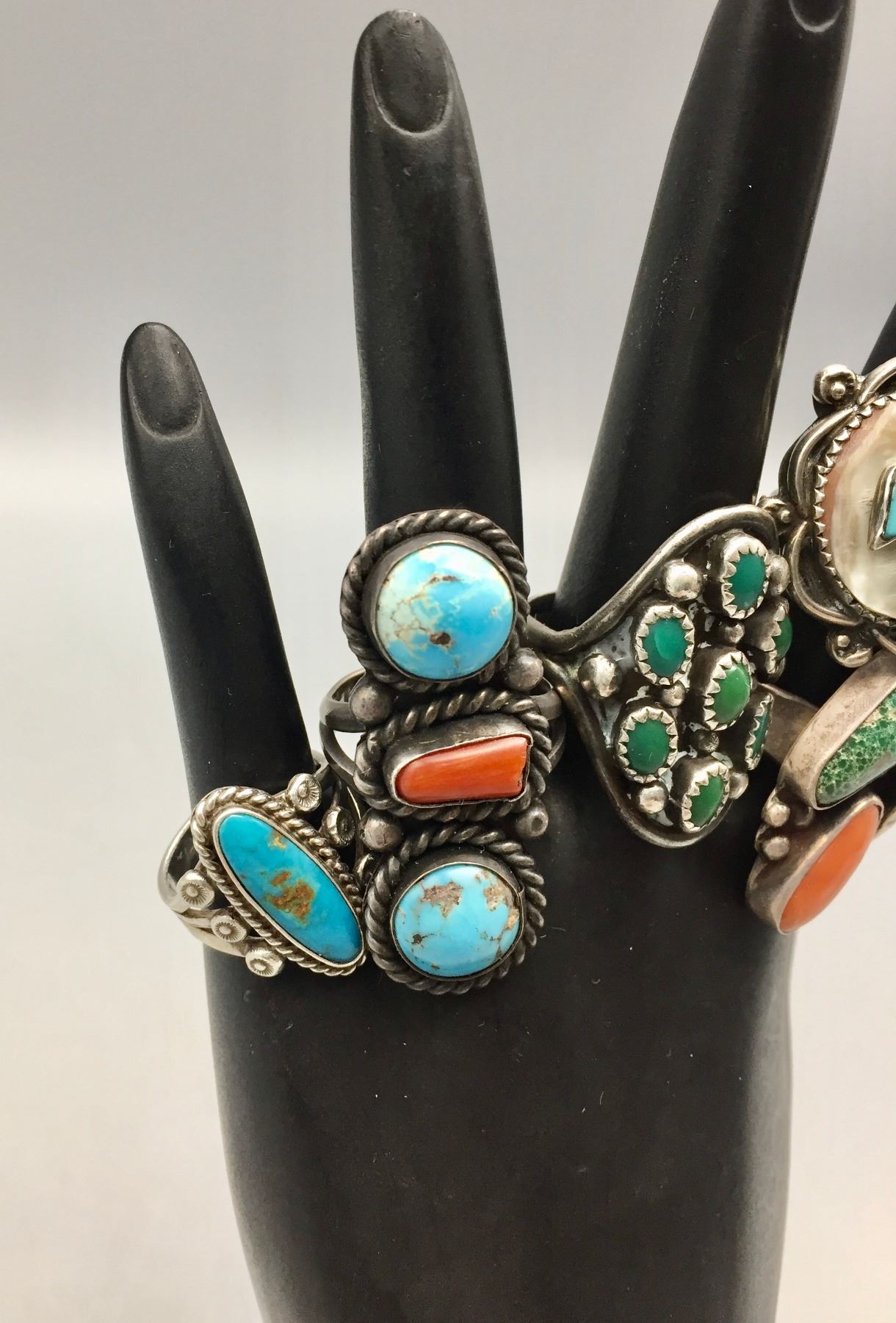 Description: For sale in this lot if a group of five rings in varying styles. Each ring has turquoise. Tested as sterling silver. Maker: Various. Approx. Age: Vintage. Size: Ranges from size 4-1/2 to 9. Combined weight of 38.4 grams. Condition: Good for their age, normal wear expected. Please look closely at the pictures - they are an important part of our description. Shipping: There will be a $5 handling / packaging fee for shipping this lot. The actual cost of postage will be added on top of that.