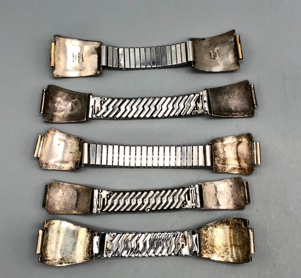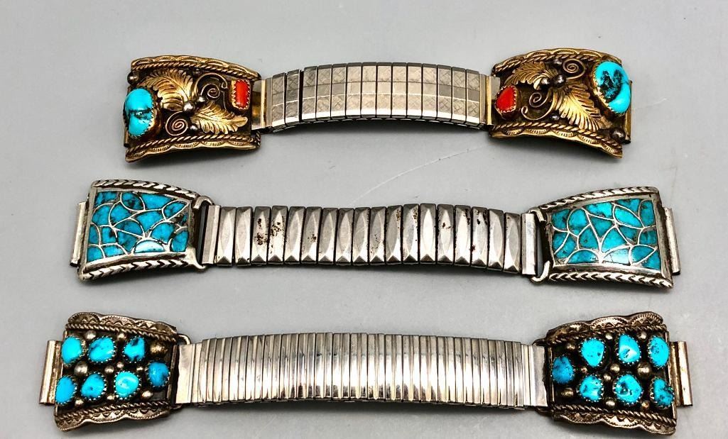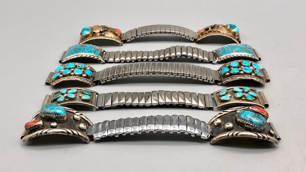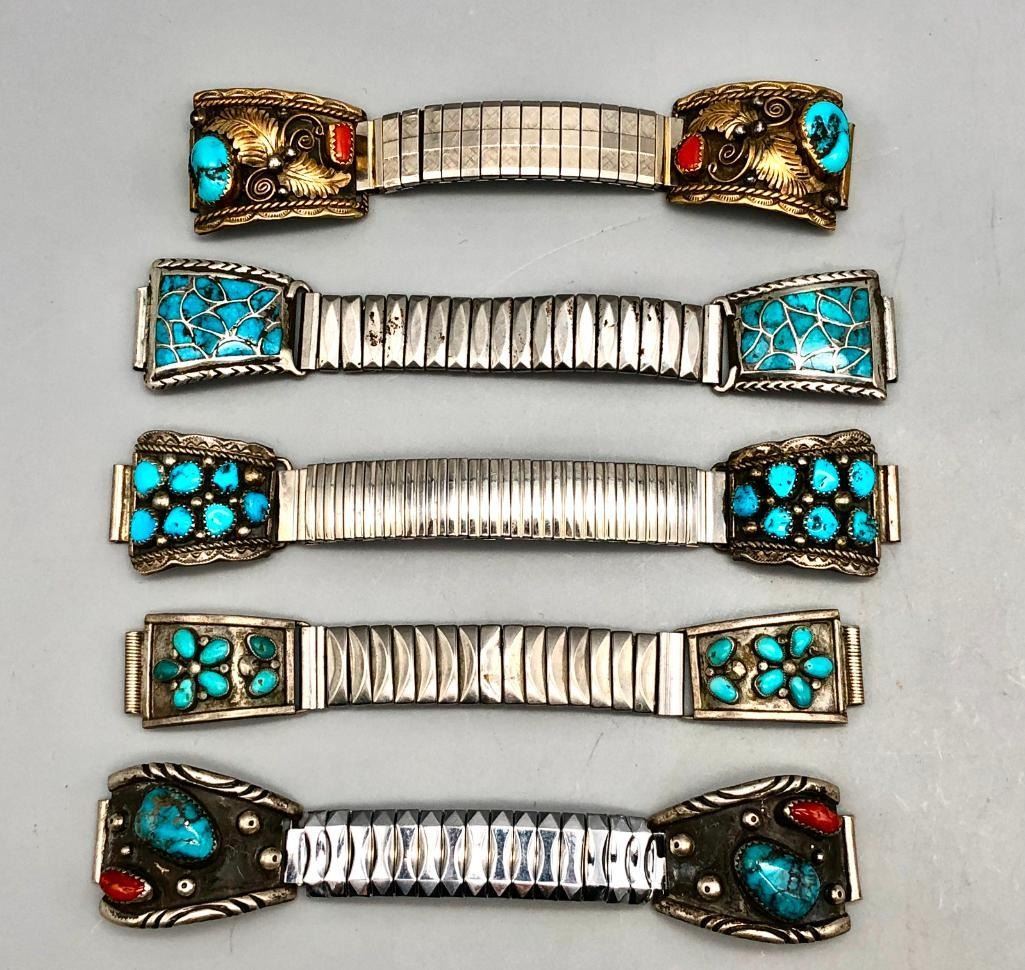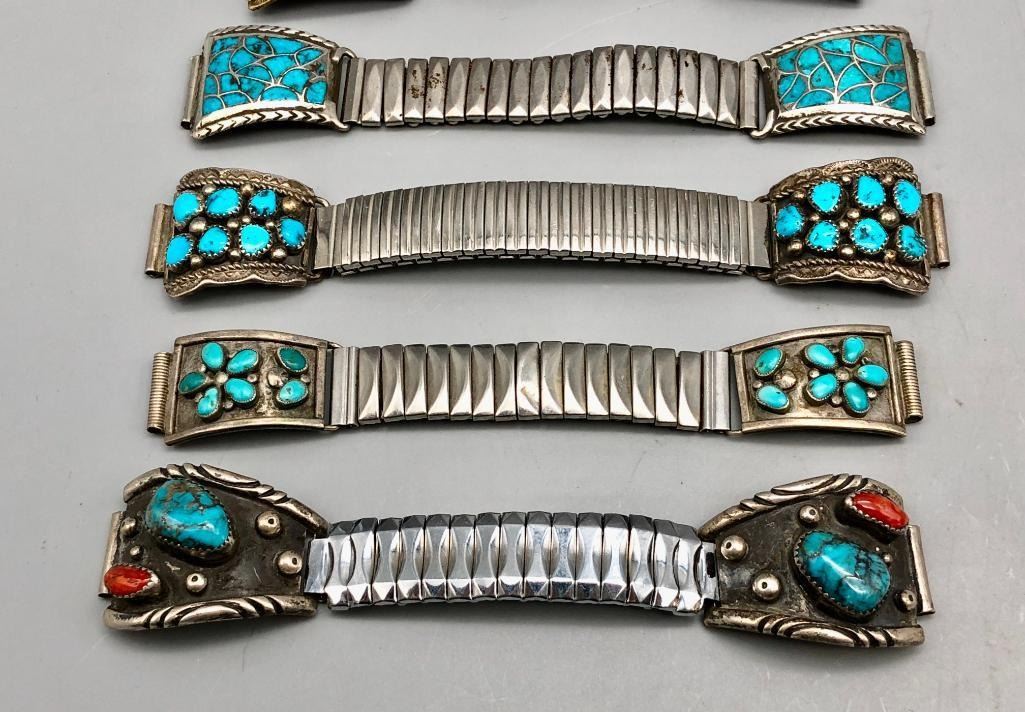 Up for consideration is a group of five vintage watch tips. All are set with turquoise with other stones. All are various sizes, styles, and all are on link watch bands. Perfect to convert to a smart watch or add a new watch face. All are made from sterling silver. MAKER: Various. APPROX AGE: Vintage. SIZE: Various. Combined weight is 157.9 grams. CONDITION: Good for their age, normal wear expected. Please look closely at the pictures as they are an important part of our description and are hereby incorporated into the description, specifically with regards to condition. SHIPPING: There will be a $5 handling / packaging fee for shipping this lot. The actual cost of postage will be added on top of that. BUY IT NOW: If you would like to buy this item now, without waiting for the auction day to bid on it, we do offer this option (which is available up to 48 hours before the actual auction starts). The “Buy it Now†price is the high estimate of this lot (plus applicable fees and the Buyer's premium is discounted to 10% when using the Buy it Now option). If you would like to exercise this option, you must contact us by email (or phone as long as you talk to someone live). Reference this lot number and your intention to "Buy it Now."