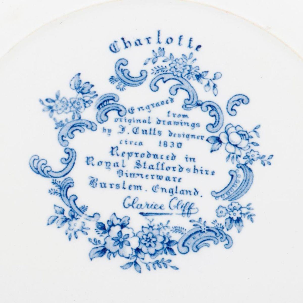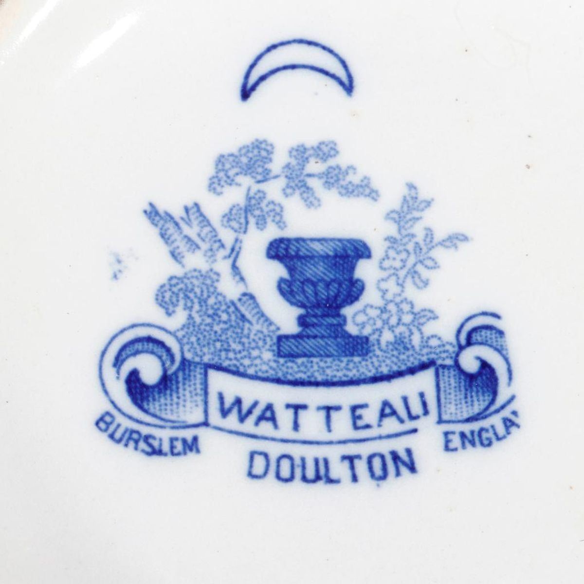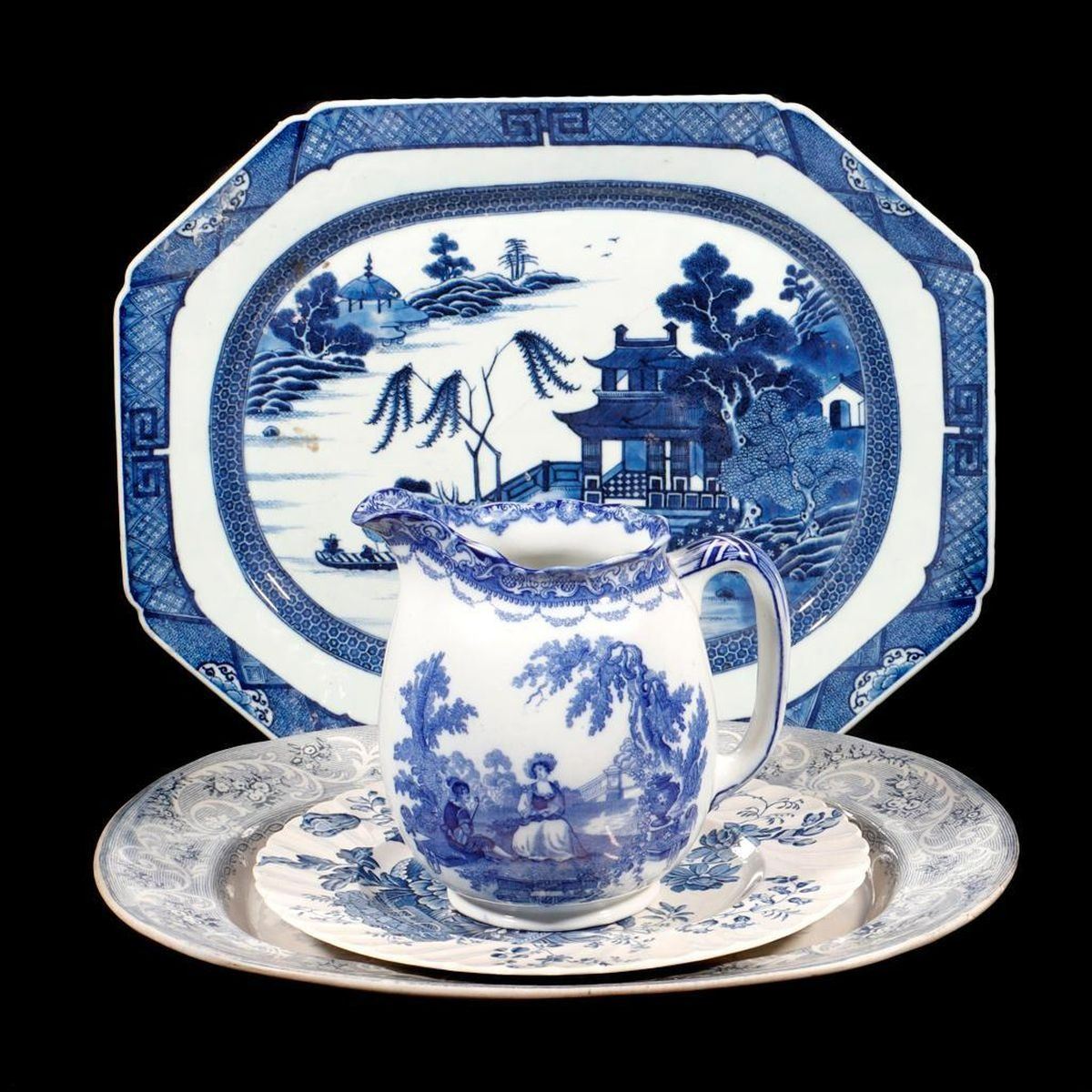 Group of blue and white porcelain and earthenwareconsisting of a pitcher ("Watteau/Burslem/Doulton/England"); a plate ("Charlotte... Reproduced in royal Staffordshire Dinnerware, Burslem, England, Clarice Cliff"); an unmarked Rhine River sceneplatter; and an unmarked willow patternplatter. Condition: Overall good, some glaze wear; the Rhine platter with small chips, and chipping to glaze on base. The platters 15in and 16in long; the pitcher 7in high; plate 10in diam. Condition Report: All lots are sold as is and where is. Turner Auctions + Appraisals, LLC provides condition reports upon request to aid in your bidding decision. No statement regarding age, condition, kind, value, or quality of a lot, whether made orally at the auction or at any other time, or in writing in this catalog or elsewhere, shall be construed to be an express or implied warranty, representation, or assumption of liability. All sales are final, Turner Auctions + Appraisals, LLC does not give refunds based on condition. Turner Auctions + Appraisals, LLC does not perform any shipping or packing services. We do have a list of suggested shippers who gladly provide quotes prior to your bidding. Please visit our webpage for a list of recommended shippers.