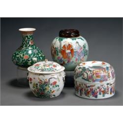 Consisting of a cuspidor, a ginger jar and covered bowl in the 'Famille Rose' palette, and a vase in the 'Famille Verte' palette.
