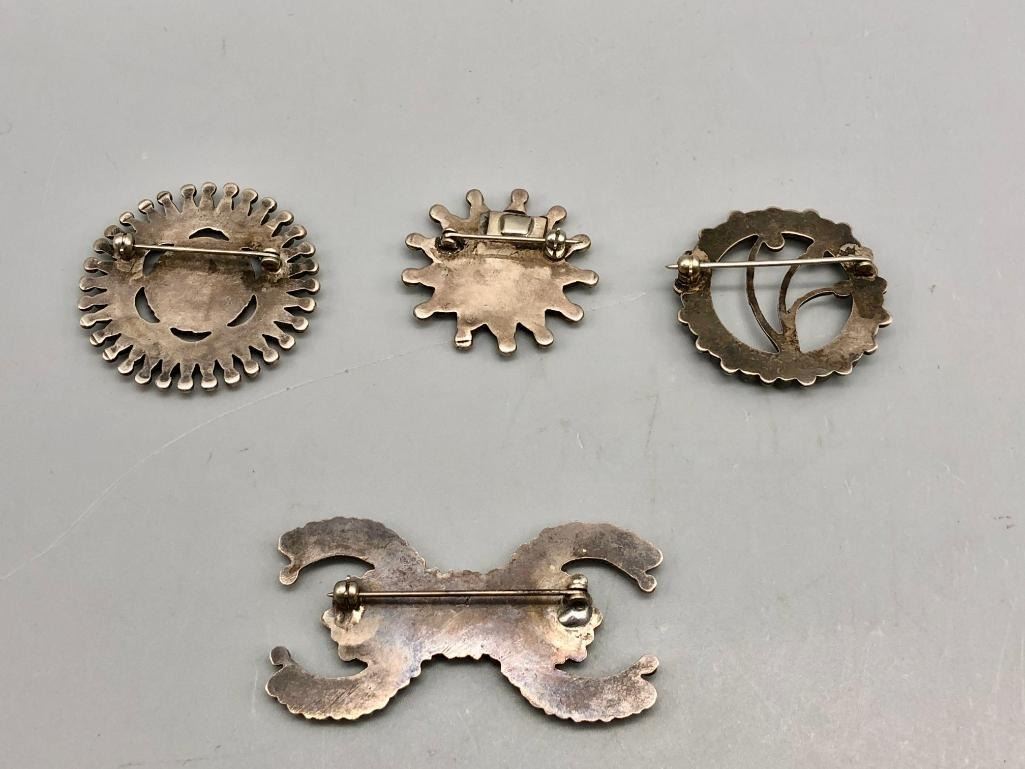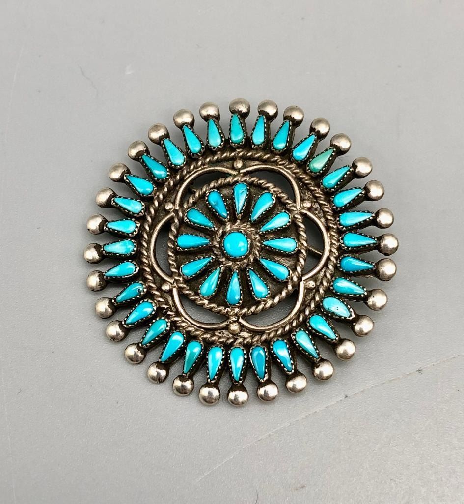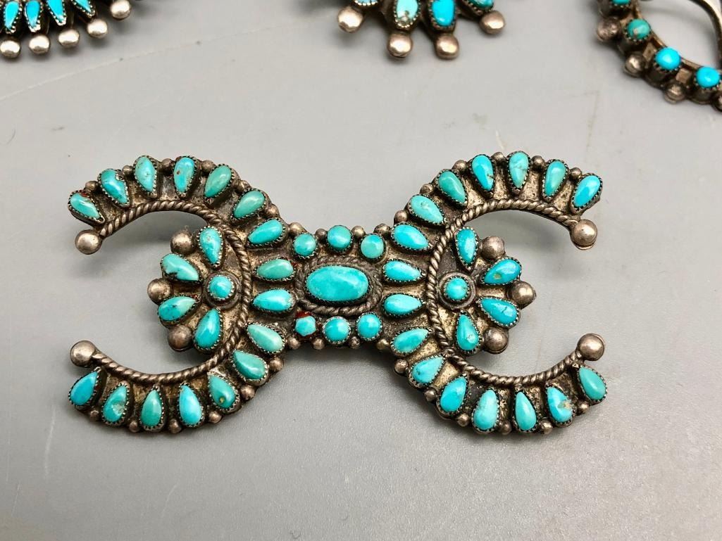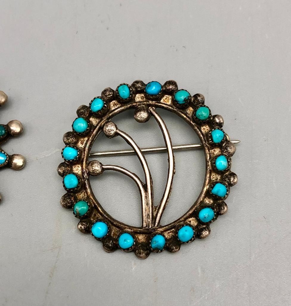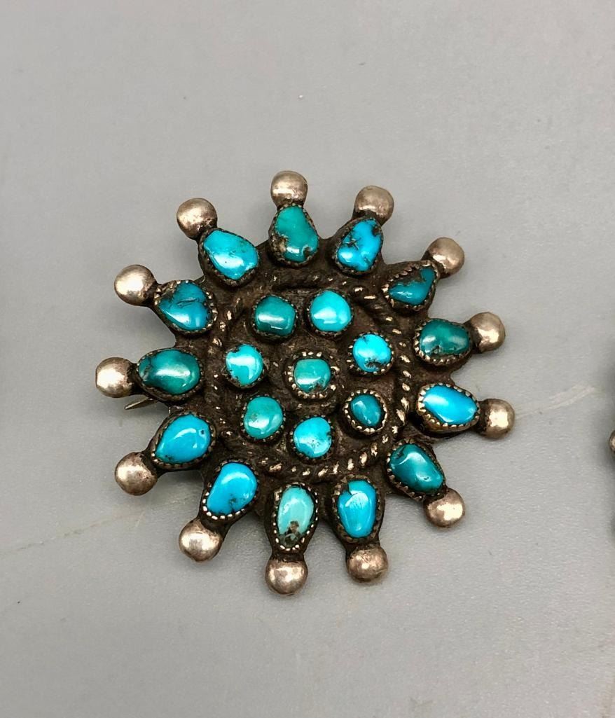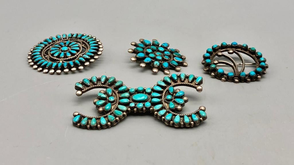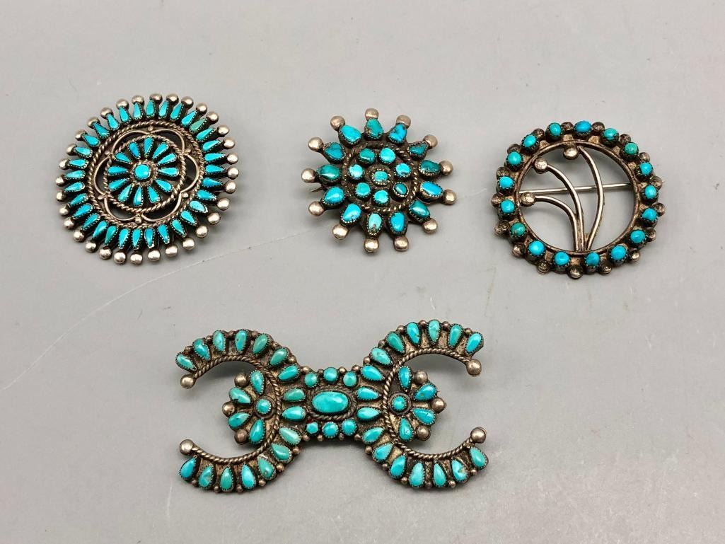 For sale in this lot is a group of four great vintage pins. This is a gorgeous group of pins, that have various sizes and styles. All are set with turquoise, and are in either petit point (tear drop cut stones) and dots. All are made from sterling silver. MAKER: Unmarked. APPROX AGE: Vintage. SIZE: Various. Combined weight is 38 grams. CONDITION: Good for their age, normal wear expected. Please look closely at the pictures as they are an important part of our description and are hereby incorporated into the description, specifically with regards to condition. SHIPPING: There will be a $5 handling / packaging fee for shipping this lot. The actual cost of postage will be added on top of that. BUY IT NOW: If you would like to buy this item now, without waiting for the auction day to bid on it, we do offer this option (which is available up to 48 hours before the actual auction starts). The “Buy it Now†price is the high estimate of this lot (plus applicable fees and the Buyer's premium is discounted to 10% when using the Buy it Now option). If you would like to exercise this option, you must contact us by email (or phone as long as you talk to someone live). Reference this lot number and your intention to "Buy it Now."