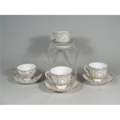 Group of Four Meissen Cups and Saucers, 19th c. - Porcelain with relief molded gilt designs, two cups with quatrefoil and cartouche design, 3"h; one cup with flowers and leaves, 2.75"h; one cup with molded leaves, 2.5"h; three saucers with relief molded leaves, 6"d; one saucer with fan and leaf design, 5-7/8"d. All but the fan and leaf saucer bear the marks for Meissen factory seconds, cup with molded leaves has three base chips, roughness to interior glaze of the flower and leaf cup.